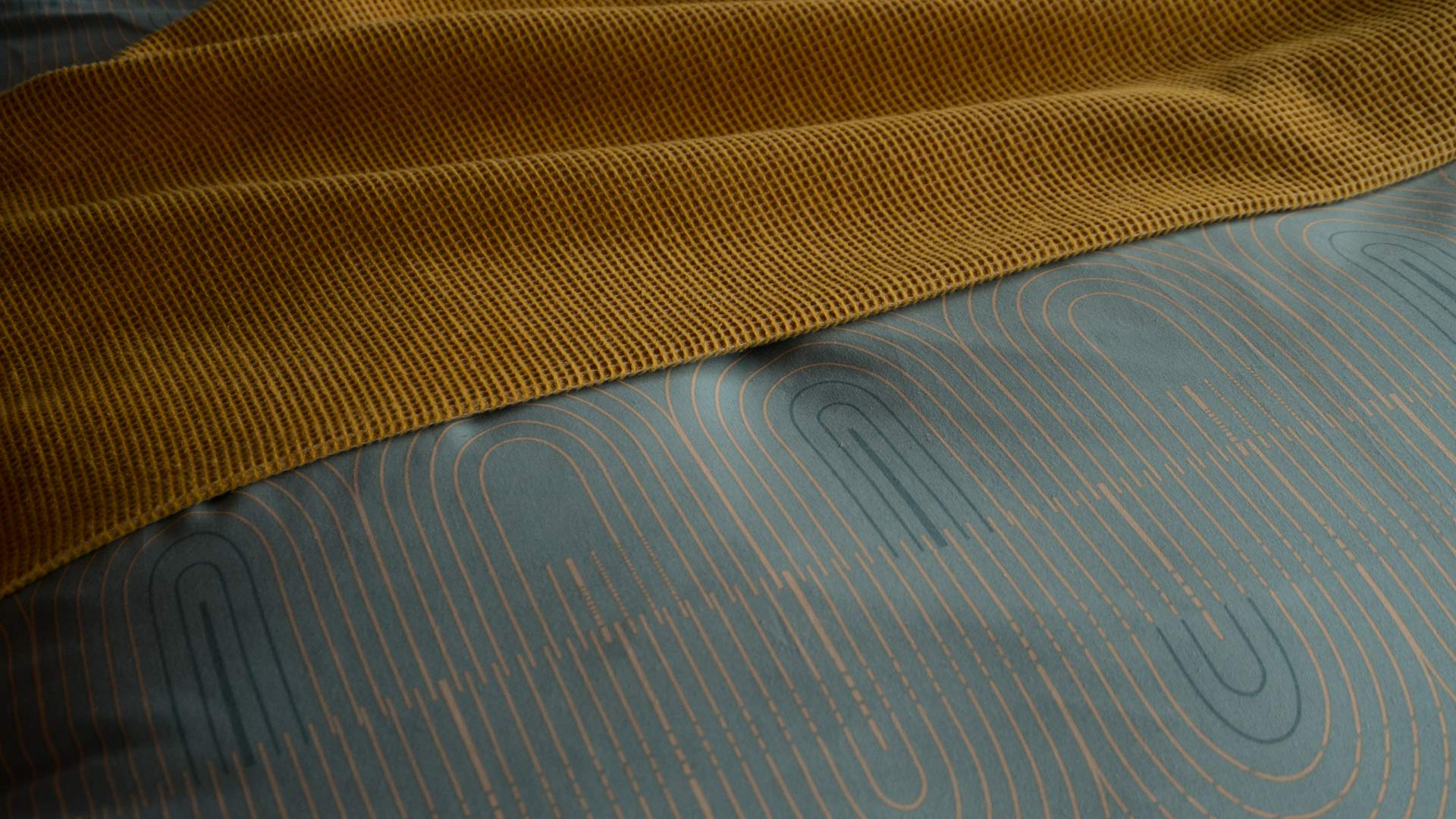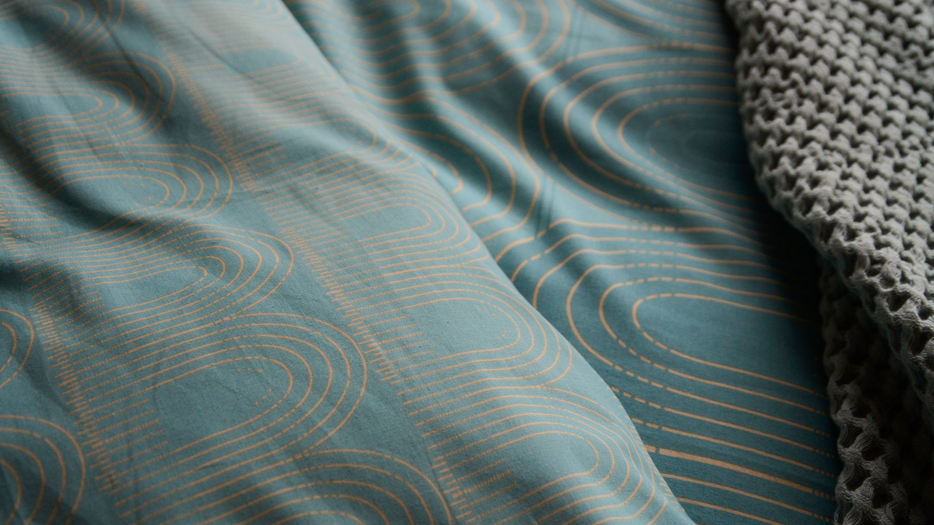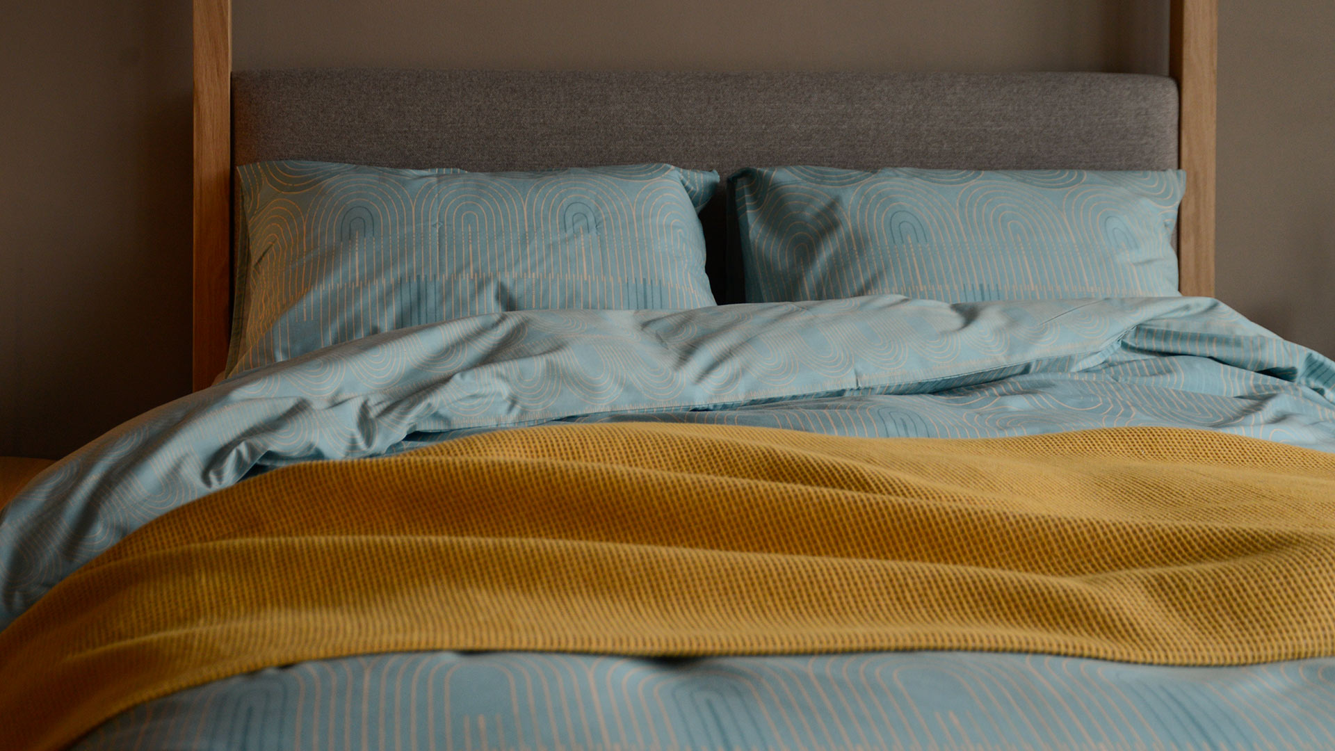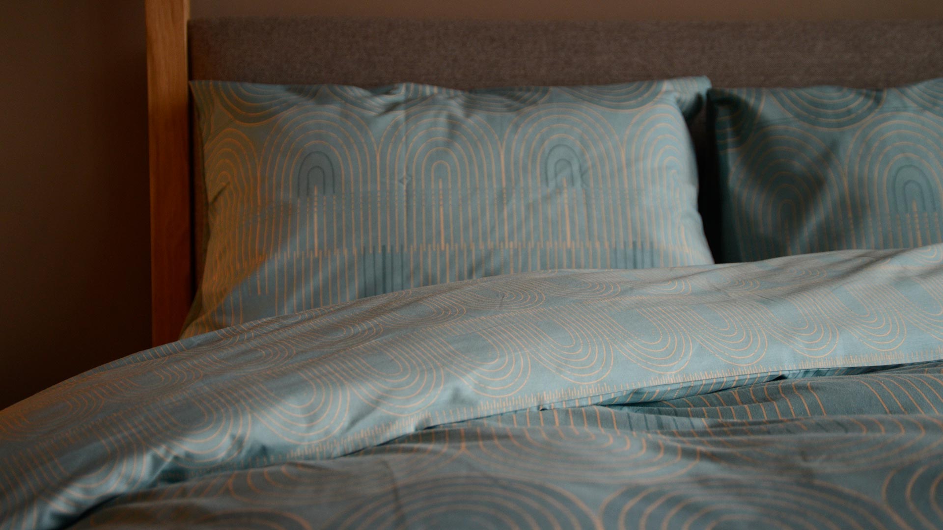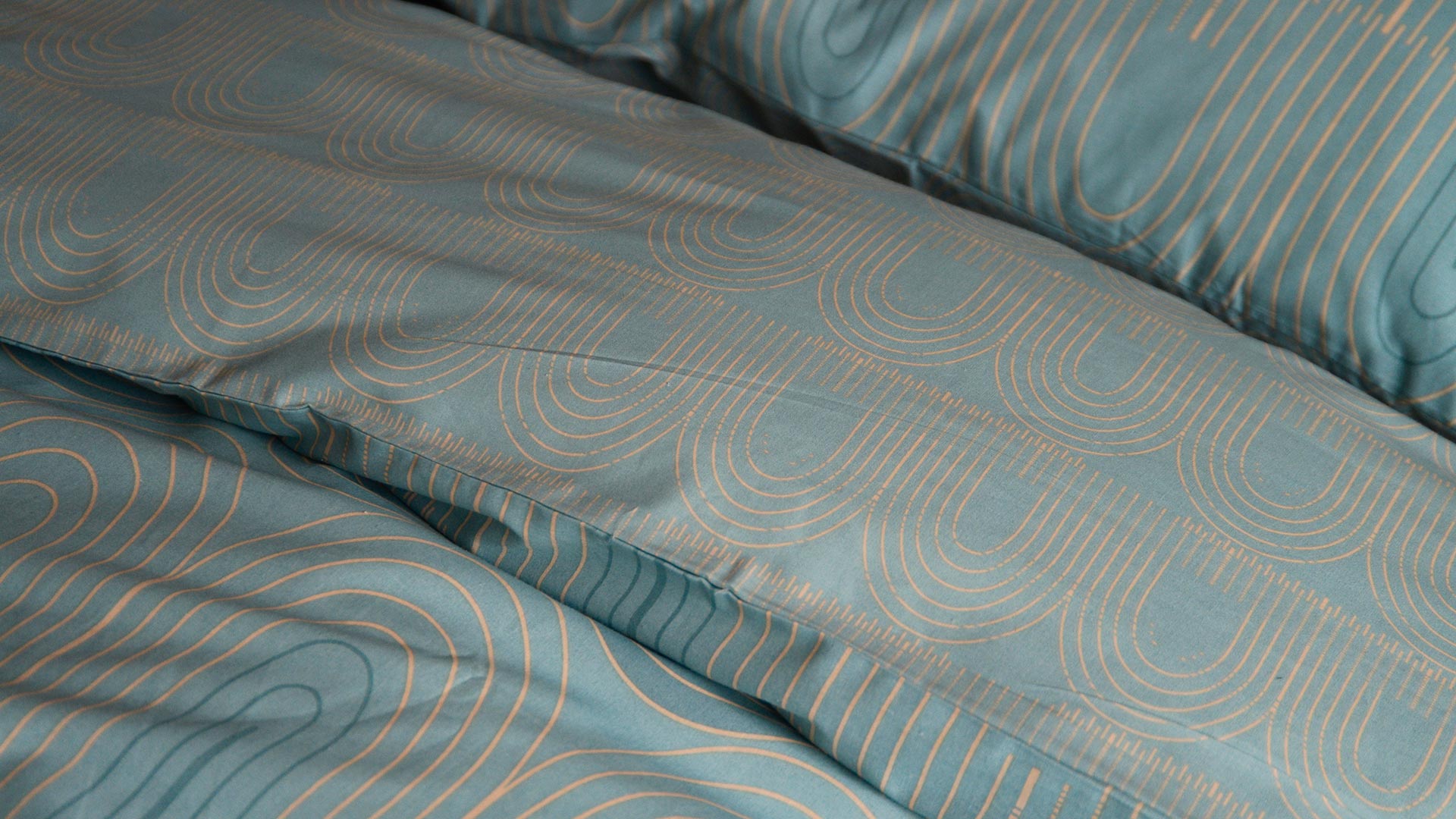 A reversible duvet set with a stylish pattern of arches in muted teal and gold tones, over a soft aqua background. The reverse is a similar, smaller scale pattern in pale gold over aqua.