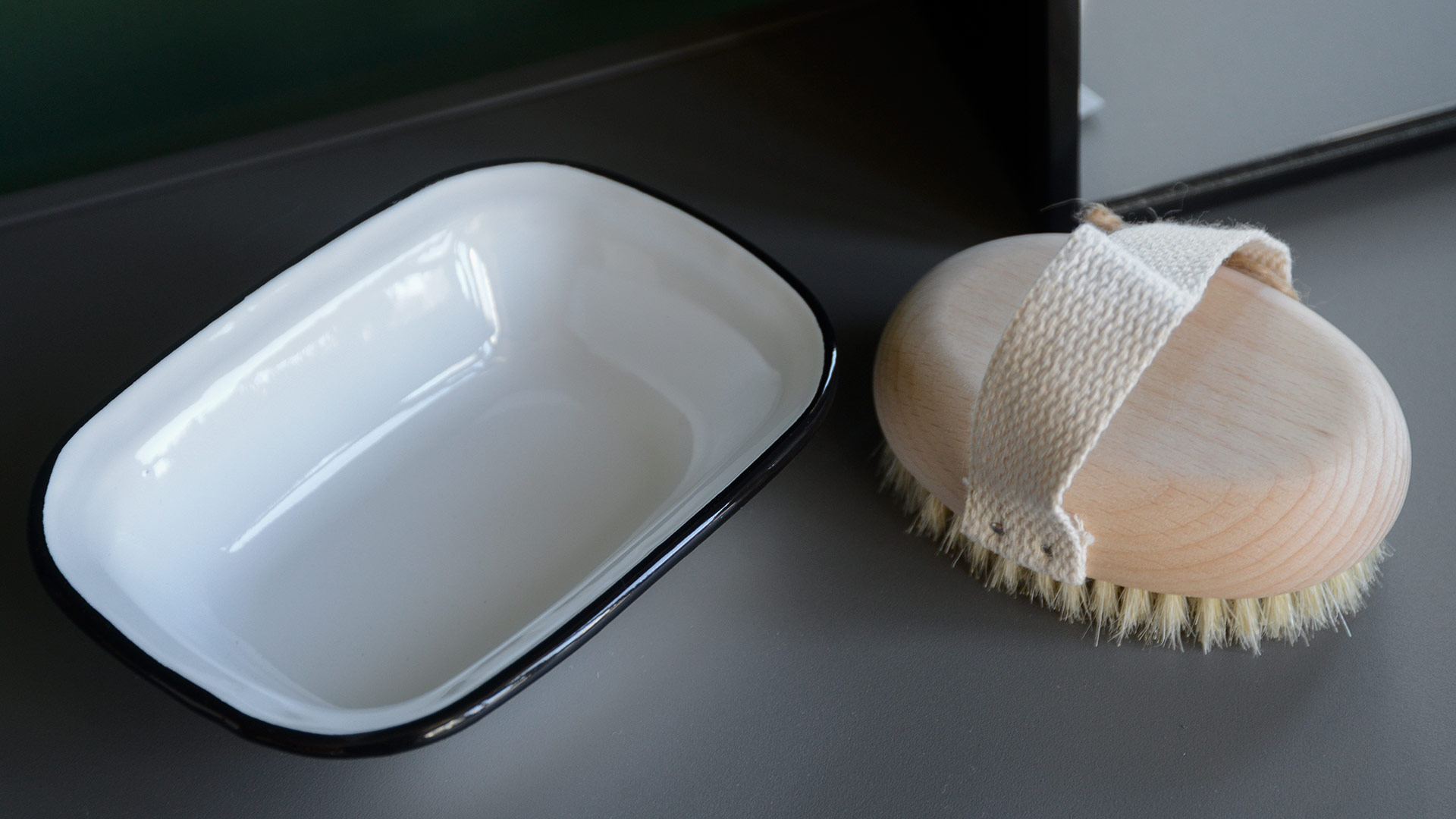 A classic enamelled dish in white with a black rim, paired with a beech and natural bristle body brush. The dish is handy for storing the body brush or a bar of soap.