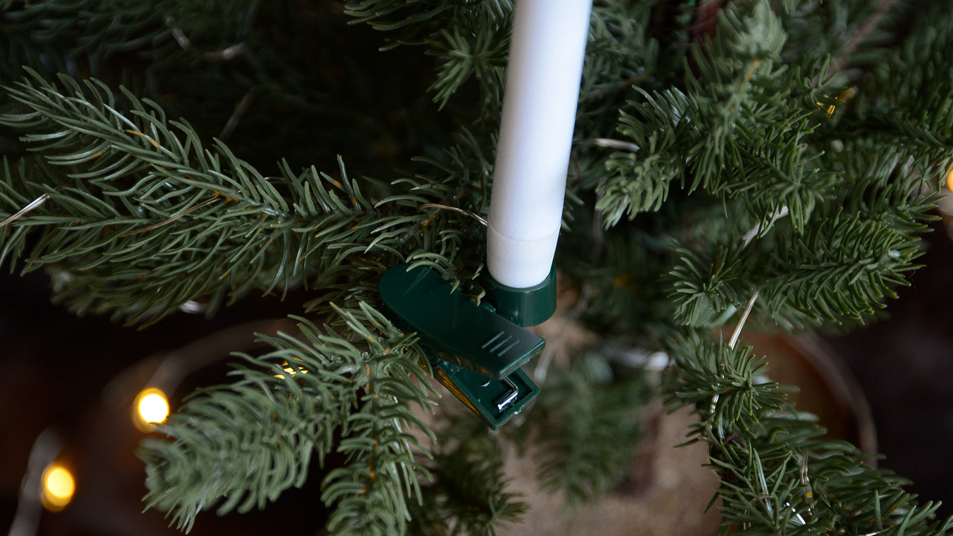 A set of 8 battery powered clip-on candle lights. Each ‘candle’ has a dark green clip for easily attaching to Christmas tree branches or a garlands. The set comes with a remote control: on/off control, timer setting, for setting a steady light or flickering candle light modes.
