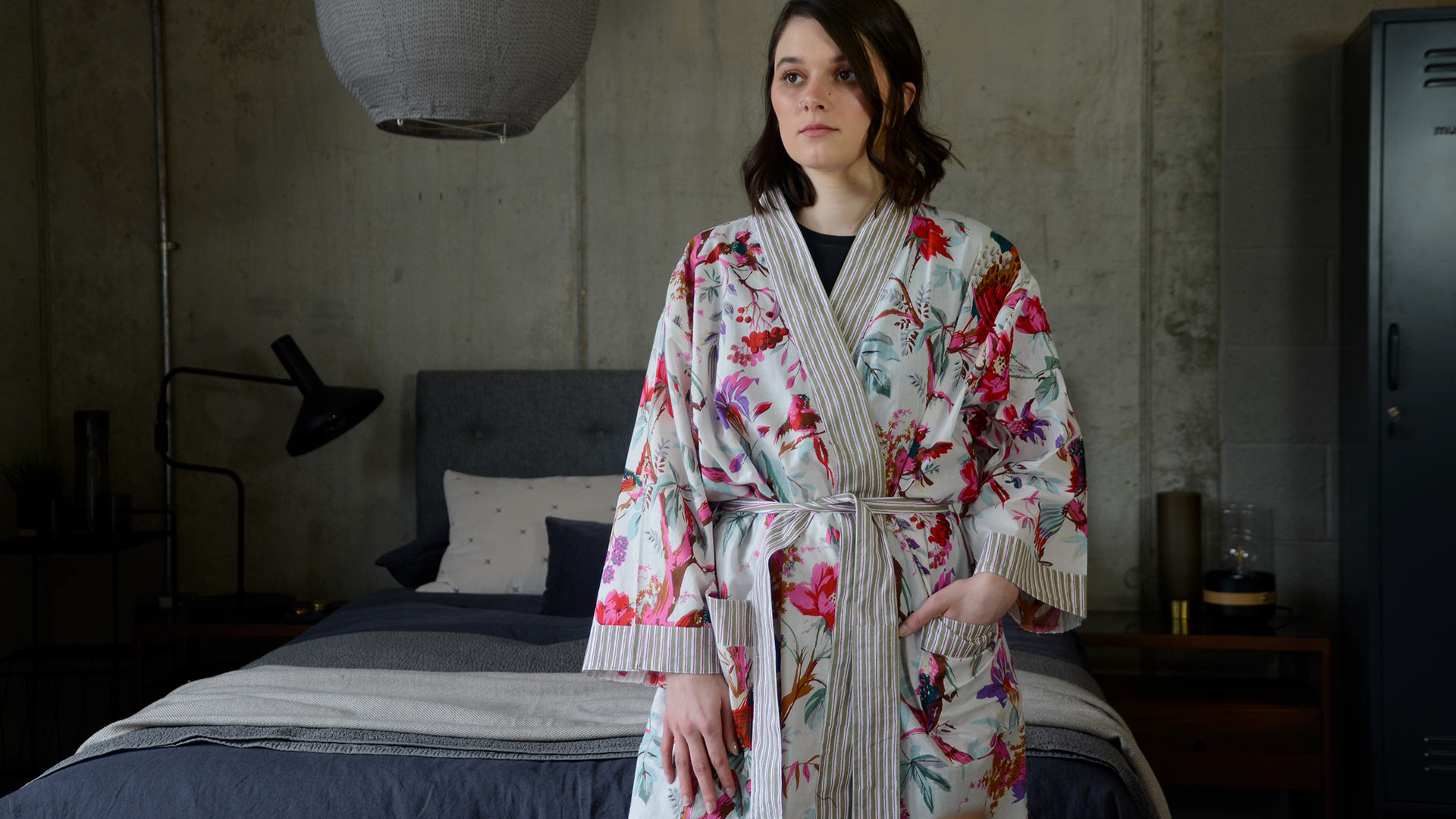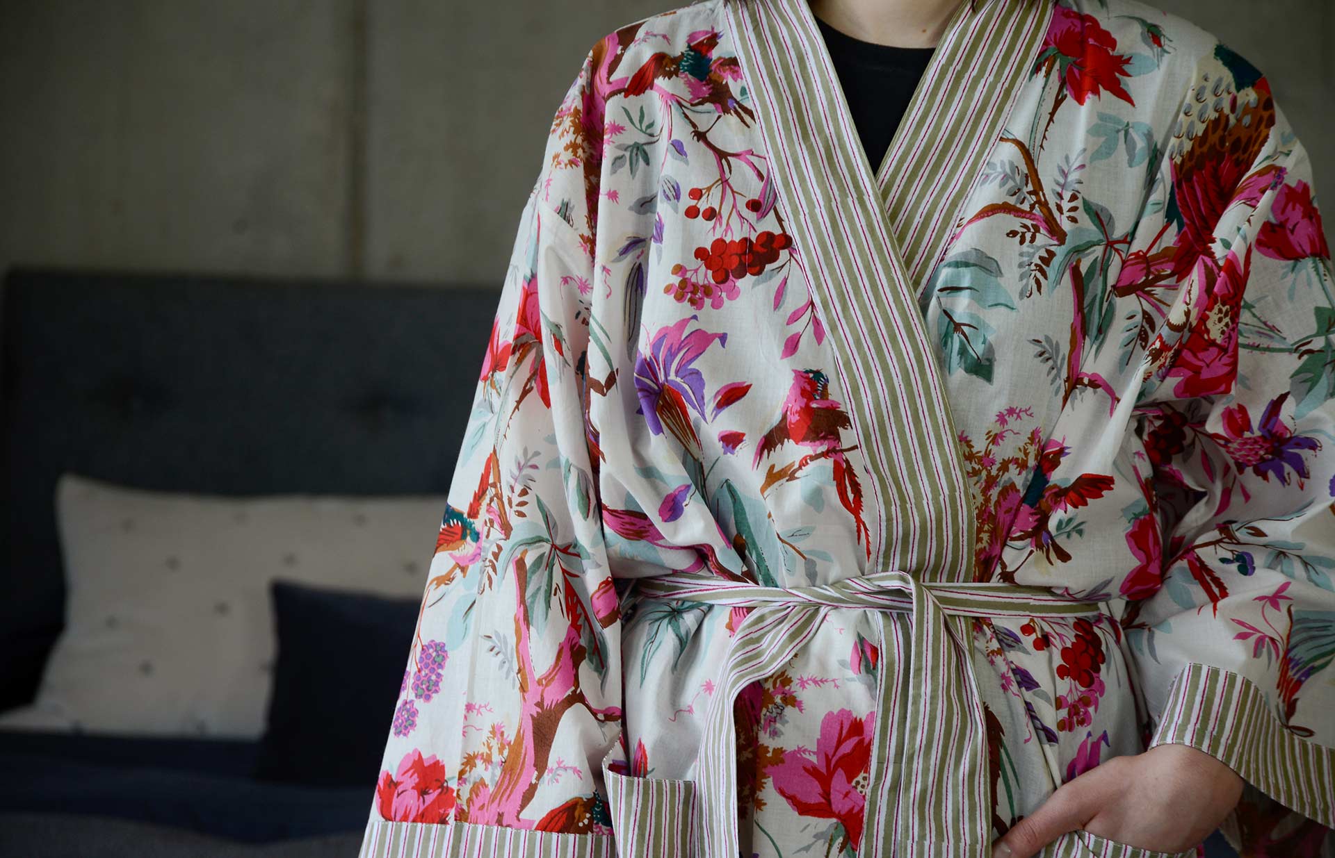 Lightweight, printed cotton robe with a bold print of birds, berries and branches over an ivory background. The robes have two front pockets with green and pink stripe detail and a tie belt.