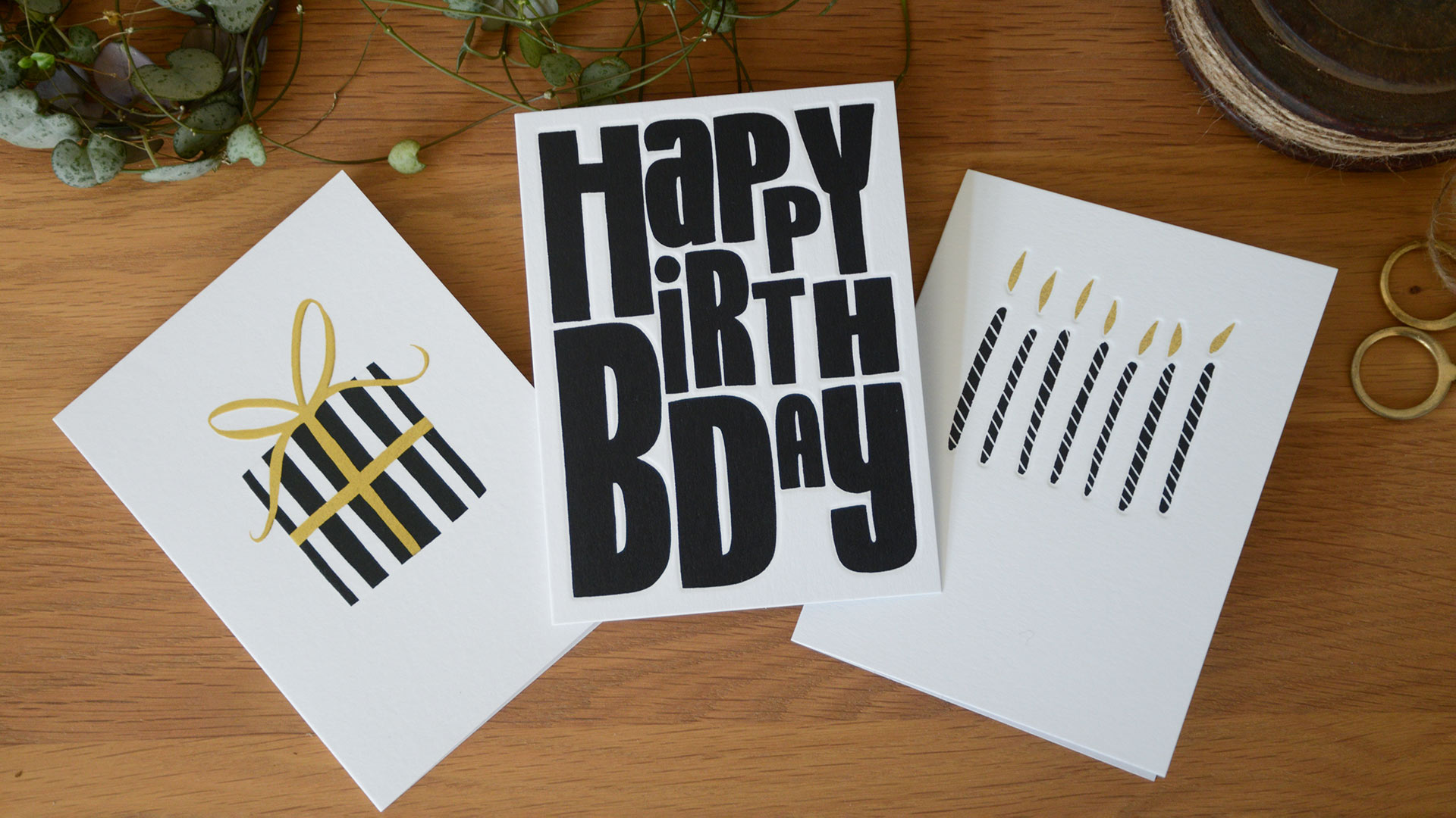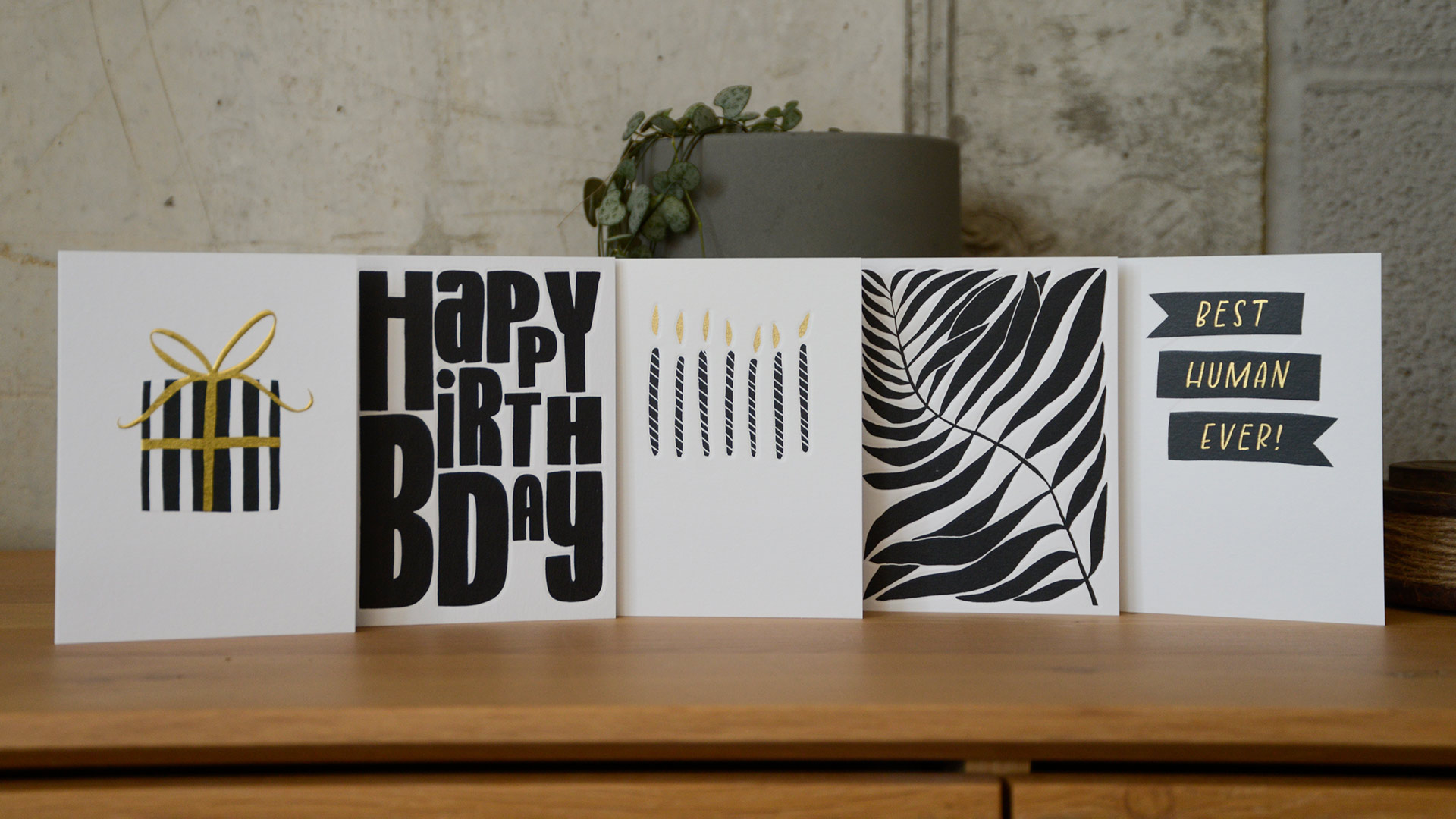 A set of 5 black & gold embossed cards. Set includes one of each design; perfect for birthdays or special occasions. Printed in the UK on FSC certified card.