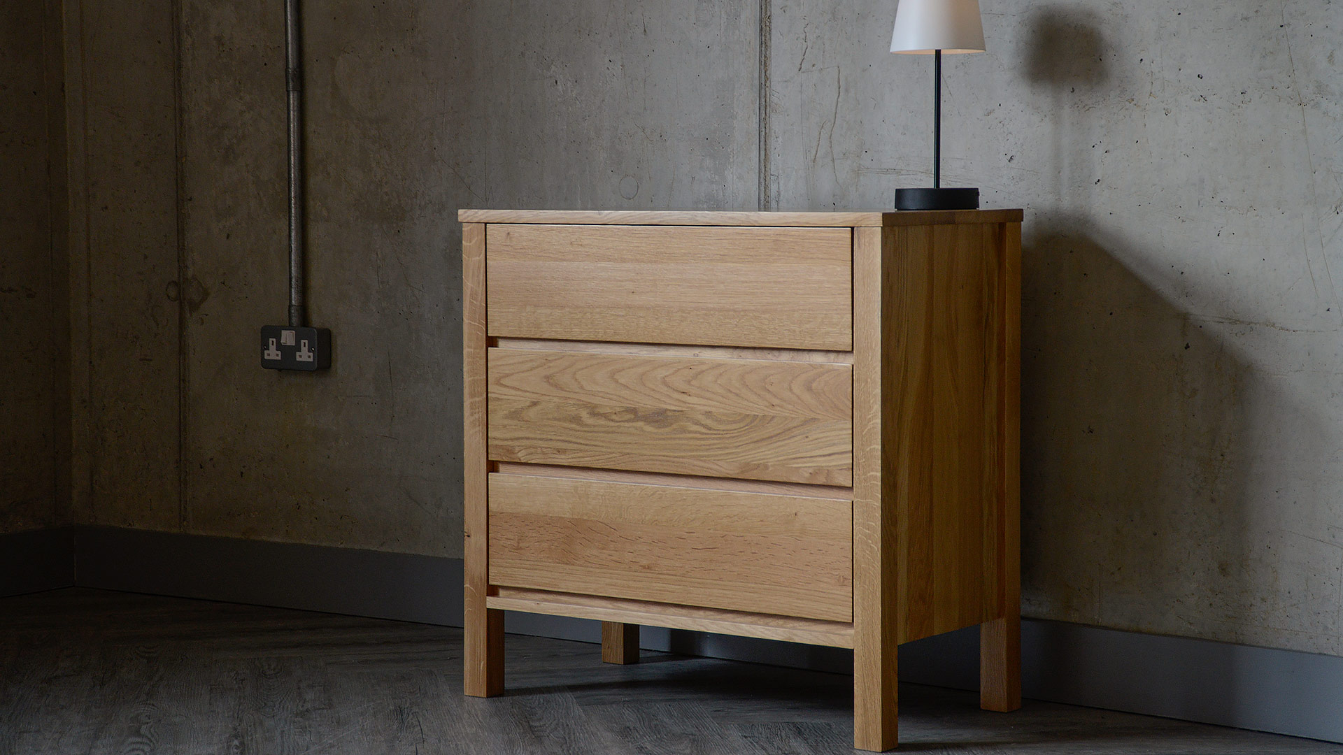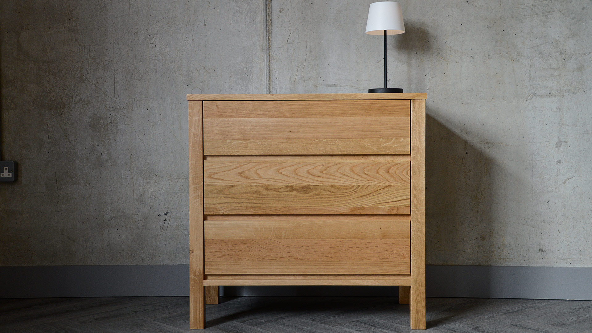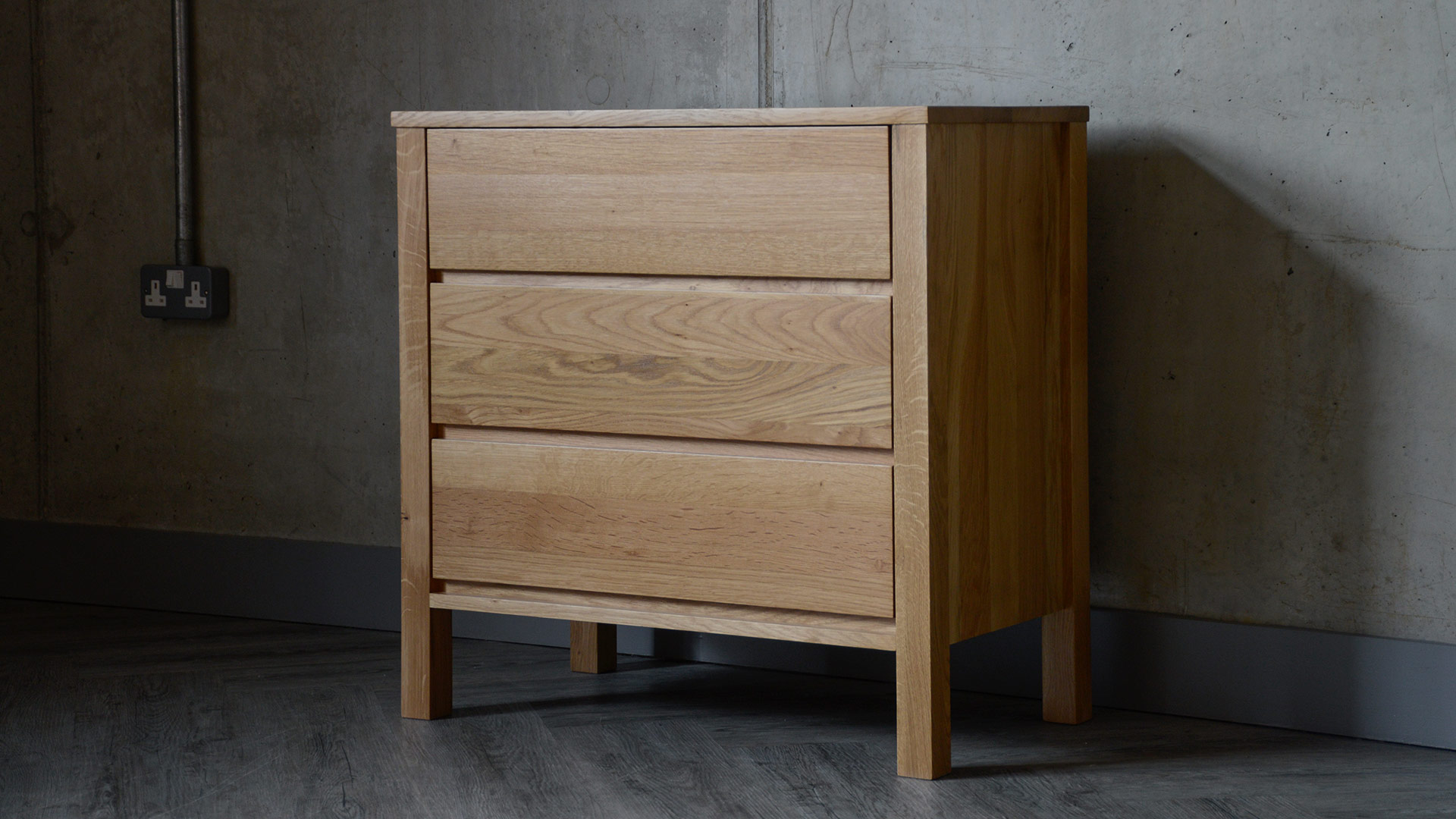 A solid, oak 3-drawer chest, part of our Black Lotus Collection of solid oak and walnut bedroom furniture. The design of this chest is inspired by the clean lines of Shaker style, but given a modern twist. Available here in solid oak, this contemporary chest of drawers has a coating of clear lacquer with a slight sheen.