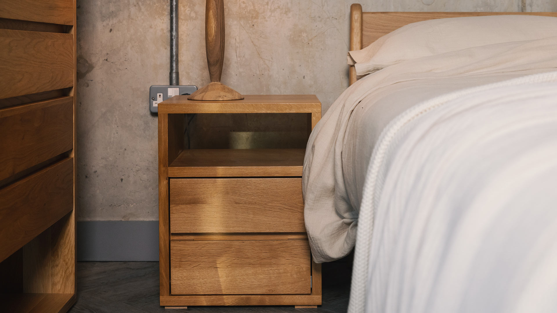 This stylish and compact bedside drawer table is made in oak and now has a coating of clear lacquer in a soft, matte finish. Please note previous batches from this range had a soft satin finish.