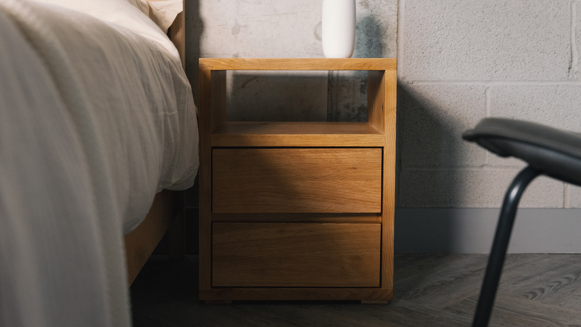 Exclusive to Natural Bed Company – the Cube Shelf Table with Two Drawers is part of our Black Lotus Collection of contemporary, oak bedroom storage. This unit has two lower drawers and an upper shelf – a useful storage unit that takes up very little floor space – it is ideal for smaller bedrooms.