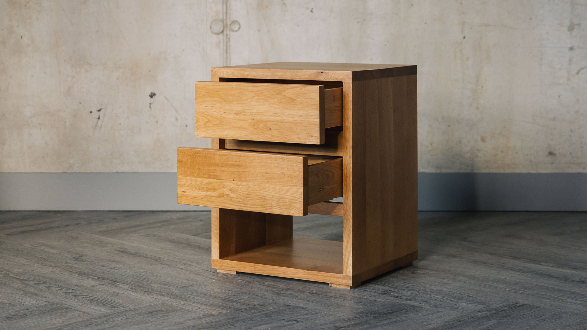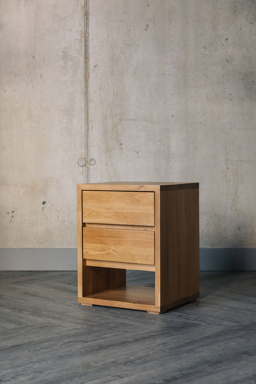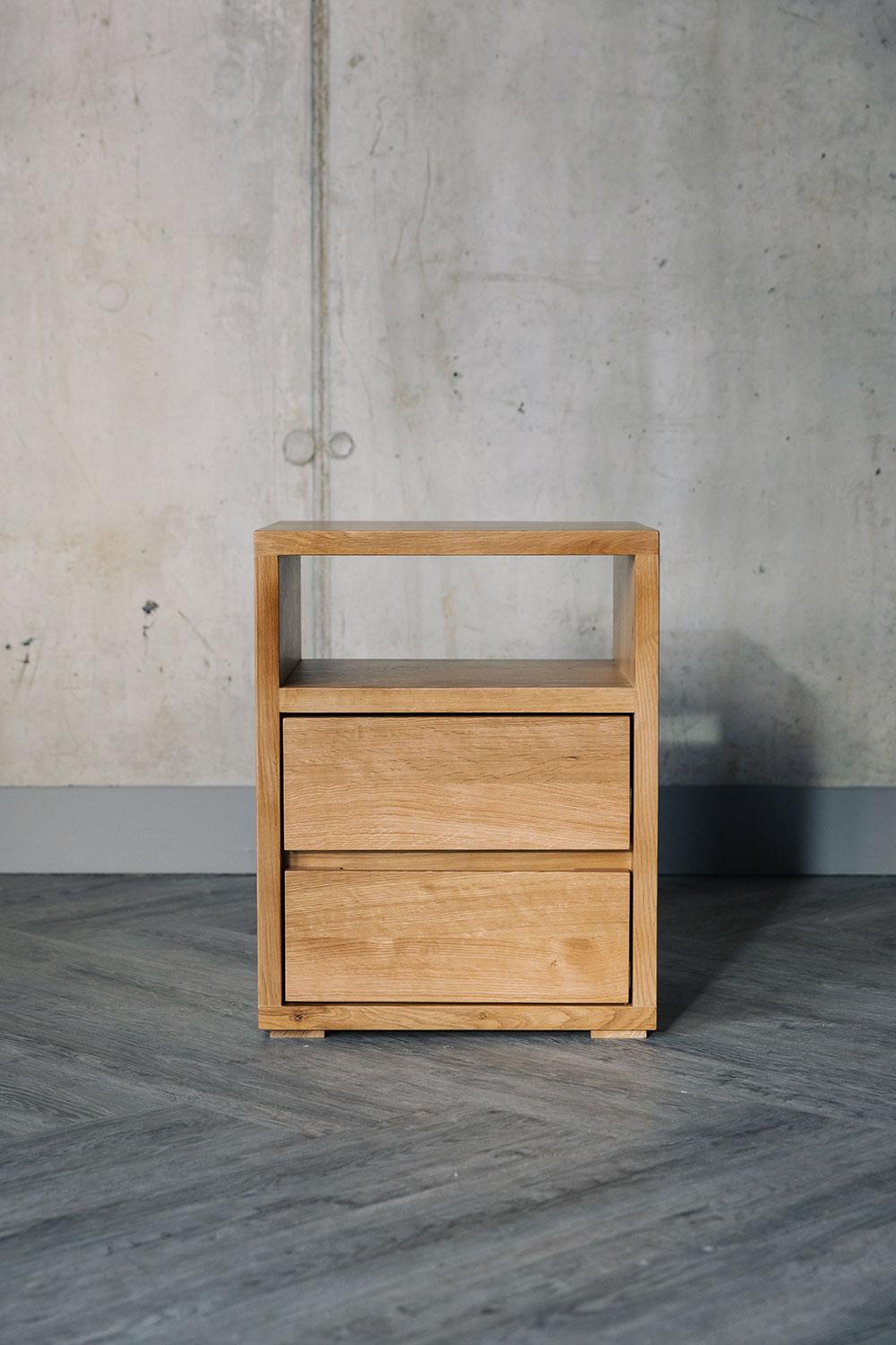 This handy oak bedside shelf table with drawers is a contemporary storage unit with a modern style. A particularly useful chest of drawers, it has two slim drawers and a compact footprint – perfect for a smaller bedroom. Made using solid oak, this cube style chest also has a top shelf as part of the frame. Useful for storing books, throws or slippers. The ideal storage solution for your bedside.