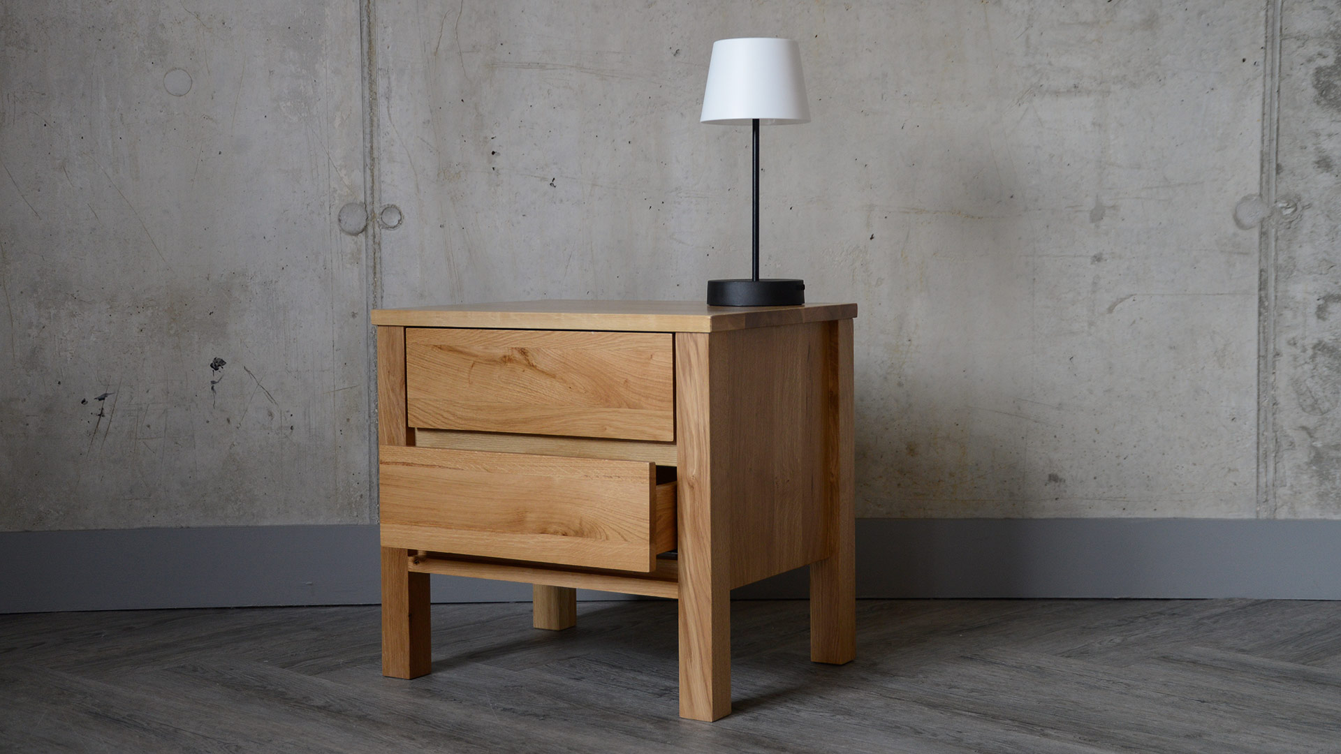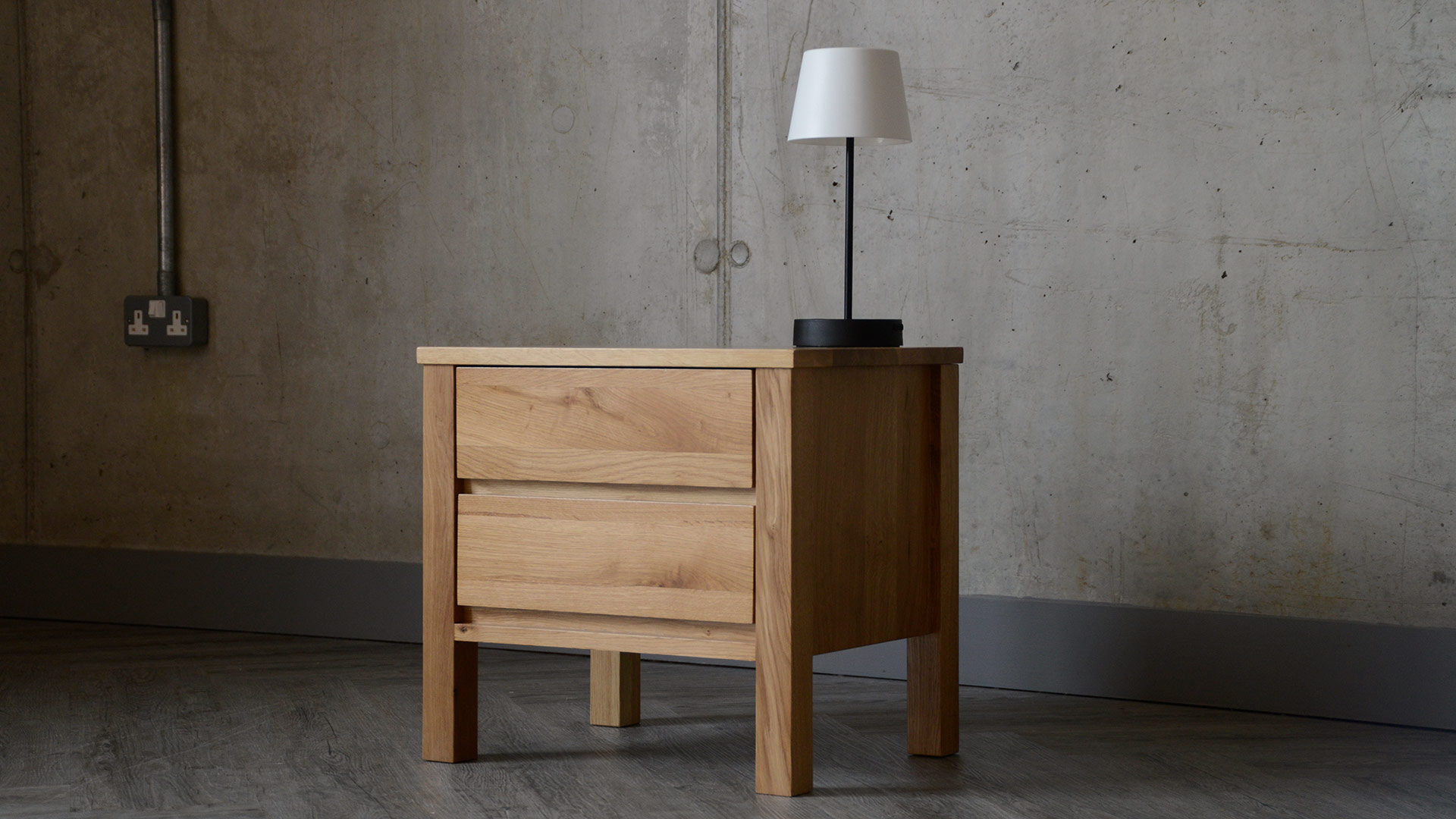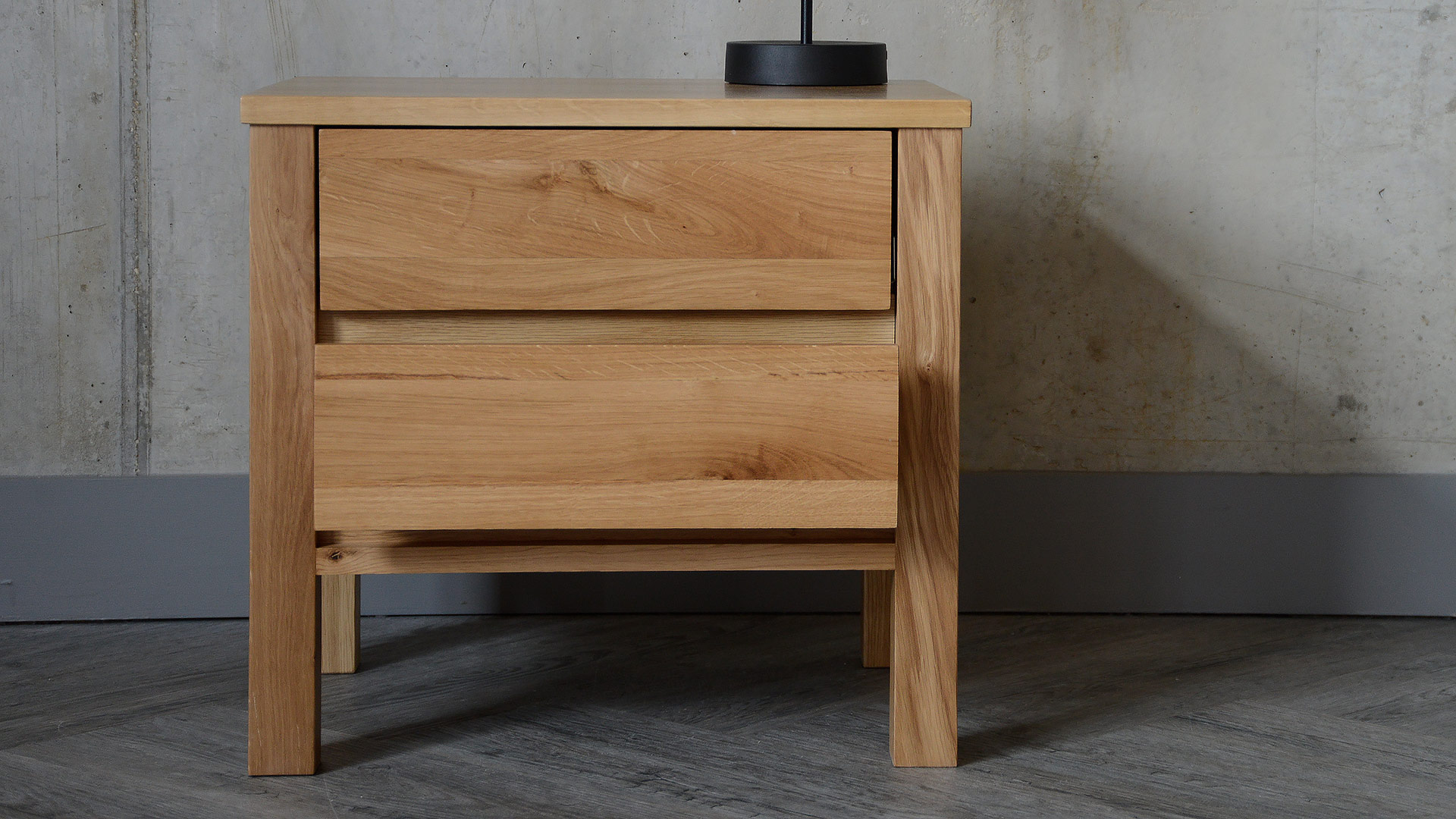 A solid, oak 2-drawer bedside chest, part of our Black Lotus Collection of solid oak and walnut bedroom furniture. The design of this chest is inspired by the clean lines of Shaker style, but given a modern twist. Available here in solid oak, this contemporary chest of drawers has a coating of clear lacquer with a soft matte finish.