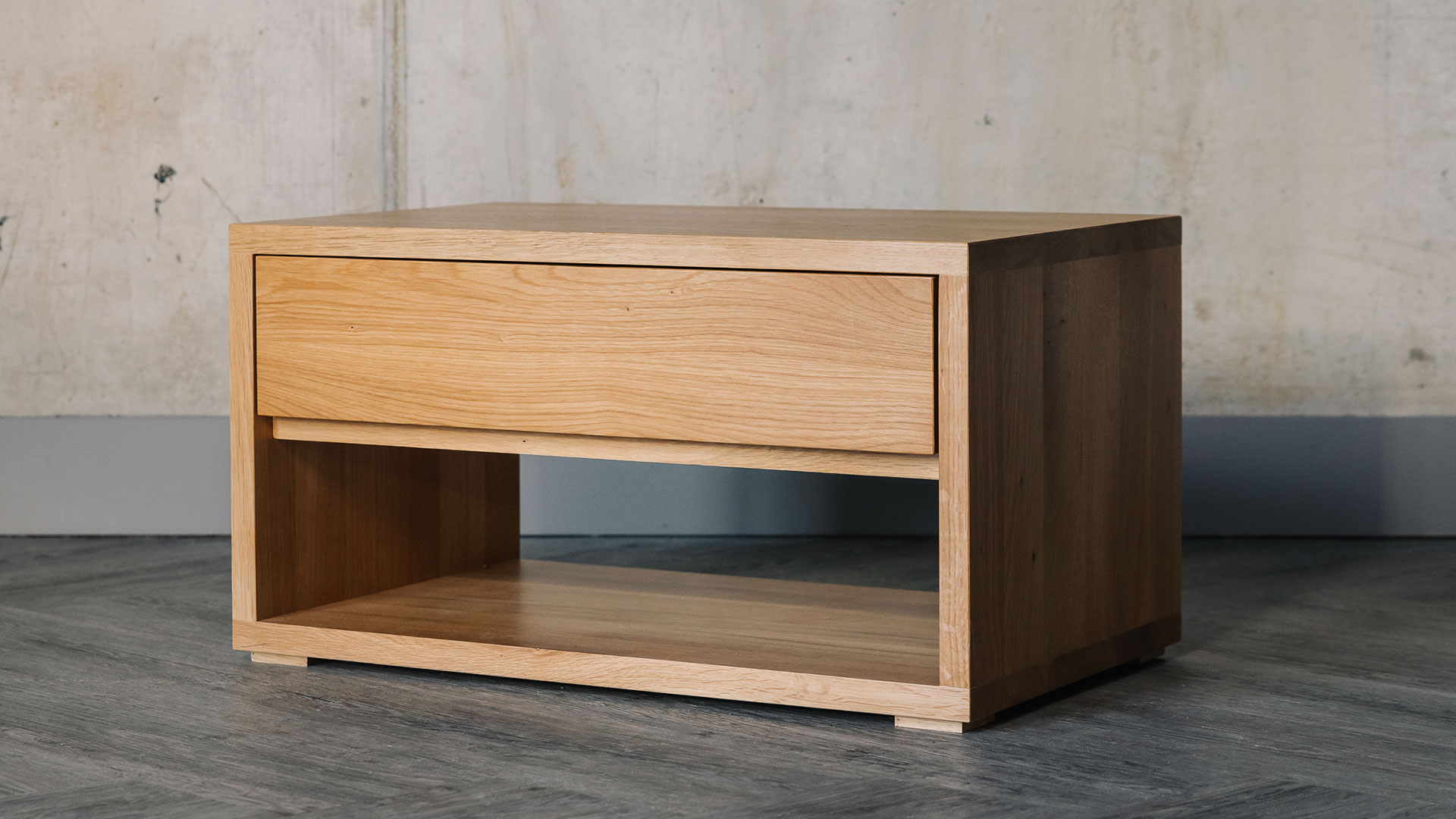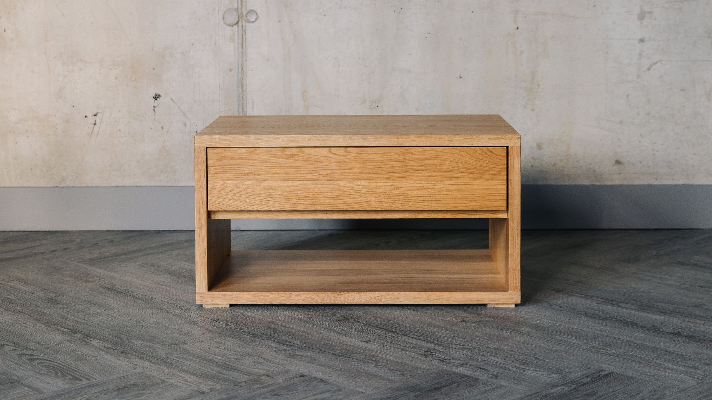 This solid oak bedside drawer table is part of our Black Lotus Collection of bedroom storage furniture. A modern, low Cube unit – it has been designed to be the half the width of a standard UK double bed (which is 135cm wide). Place two together at the end of your double bed (or larger), or use them as stylish low bedside tables. This unit has a low shelf – the ideal place to store your slippers – and a handy, slim drawer. It makes a contemporary storage bench and is made of oak finished with a clear lacquer in a soft matte finish.