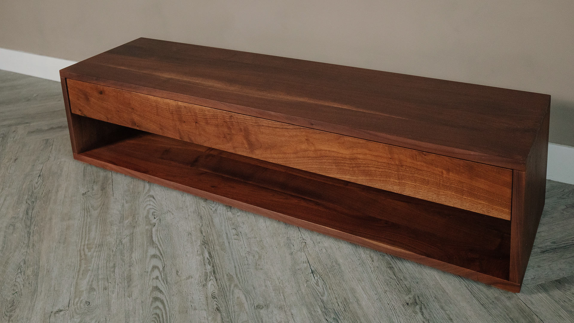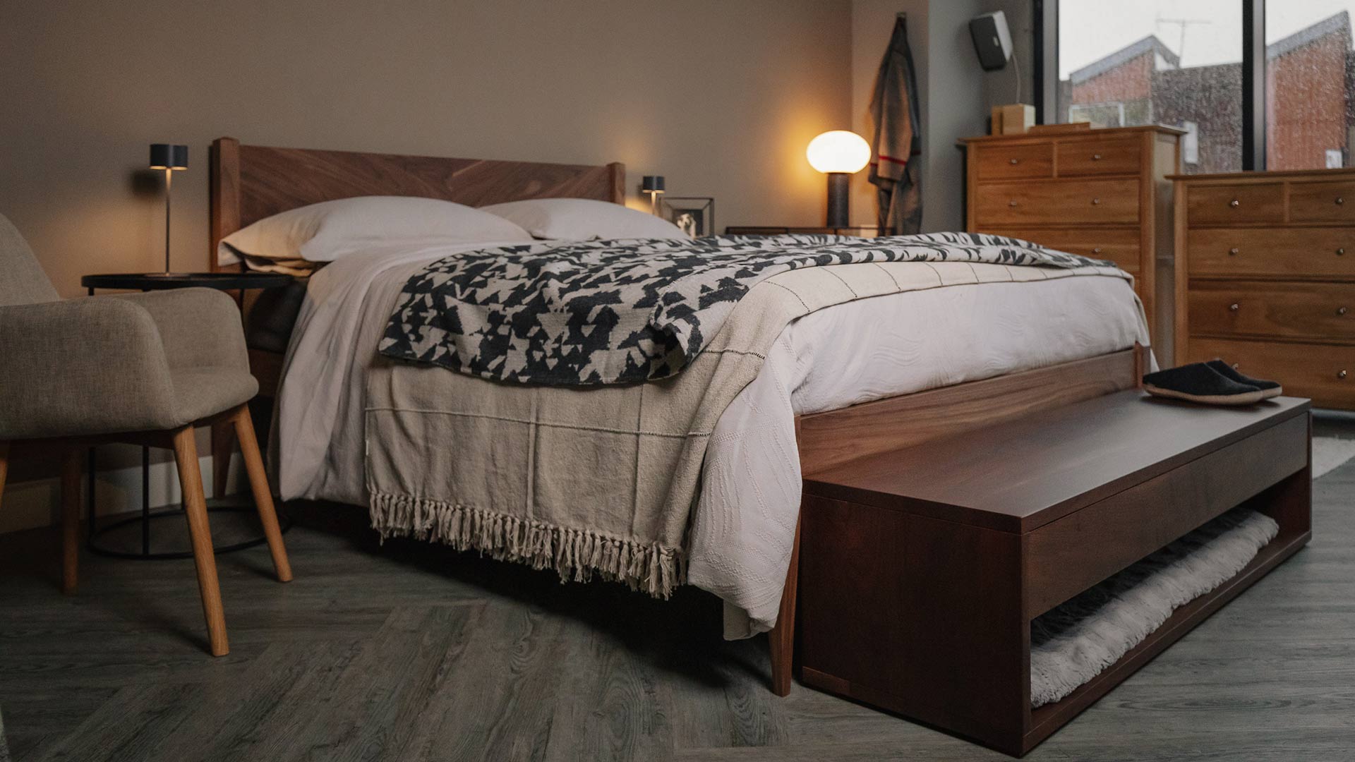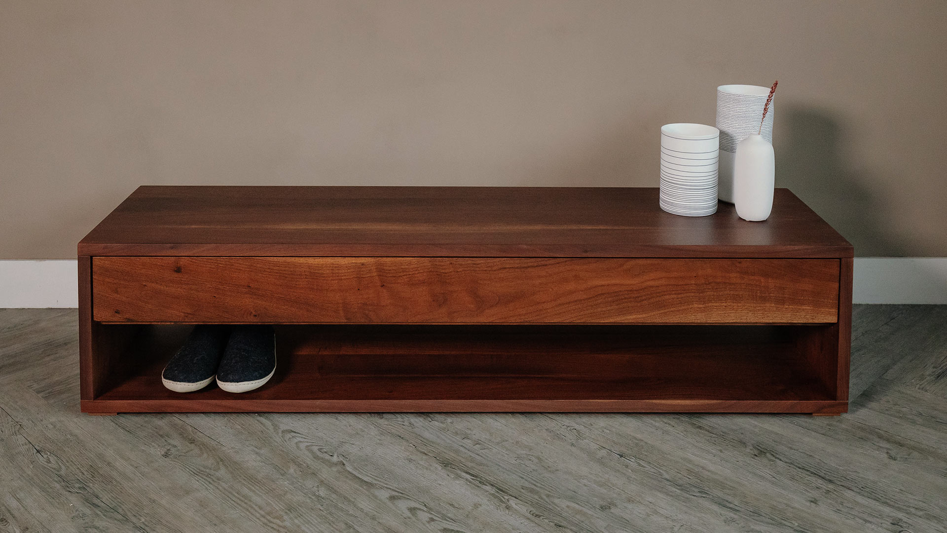 Materials: This contemporary, end-of-bed, storage bench is made of solid walnut with a tinted coating of lacquer in an almost matte finish.