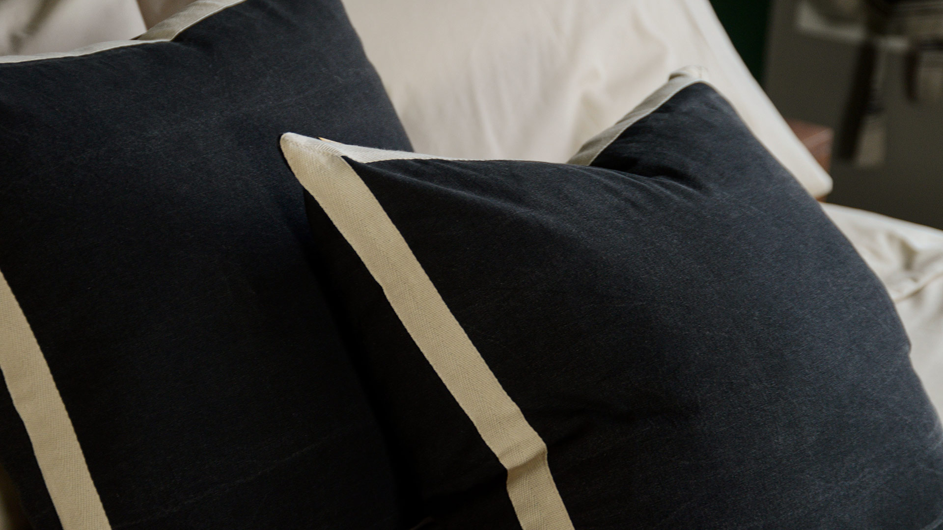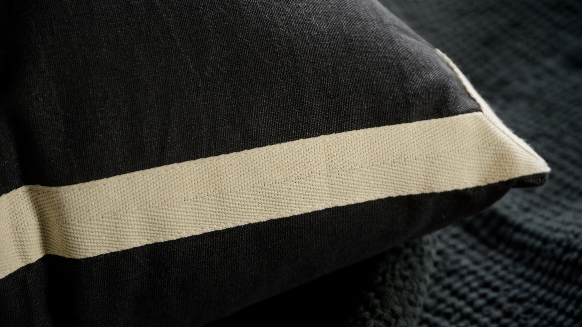 Simple and stylish, these black textured cushions feature a modern ivory border. A minimal, contemporary style, they would compliment any modern room design. Perfect as throw cushions for the bed or sofa.