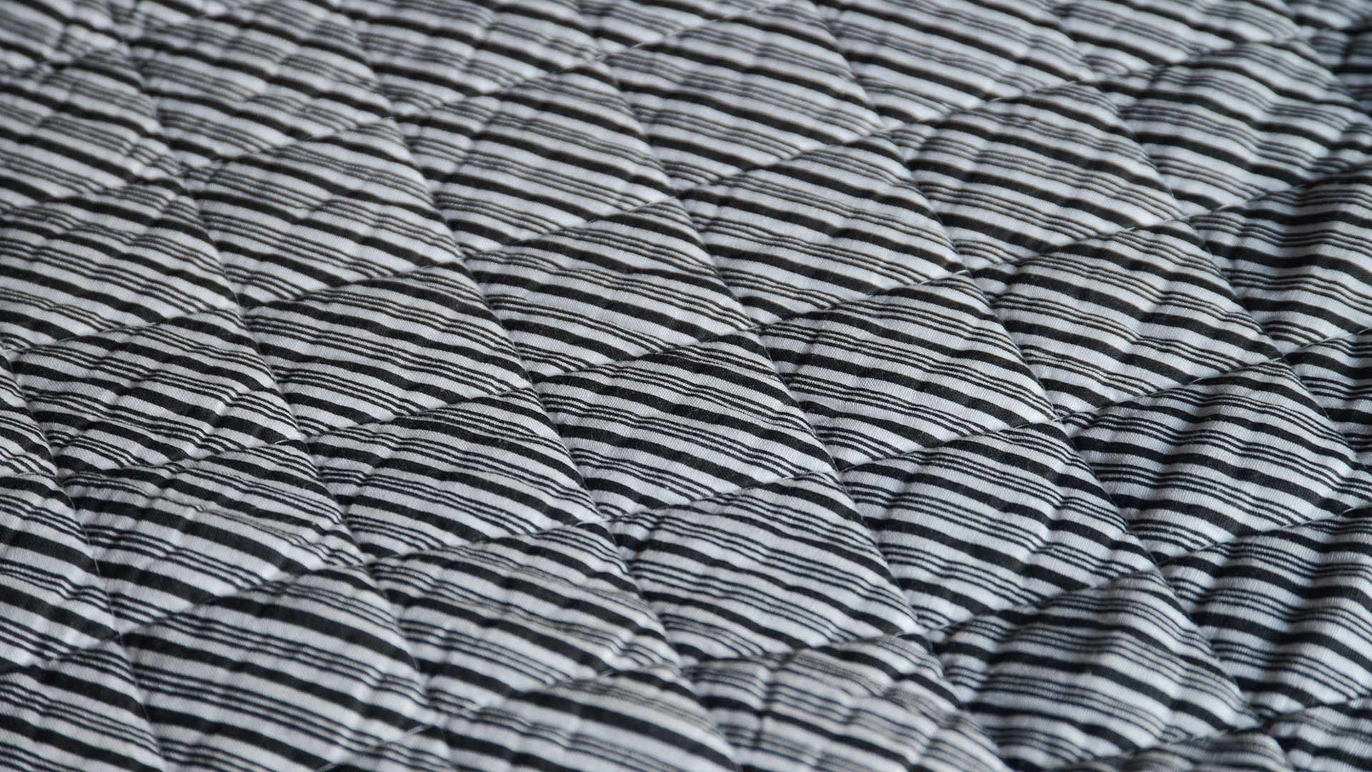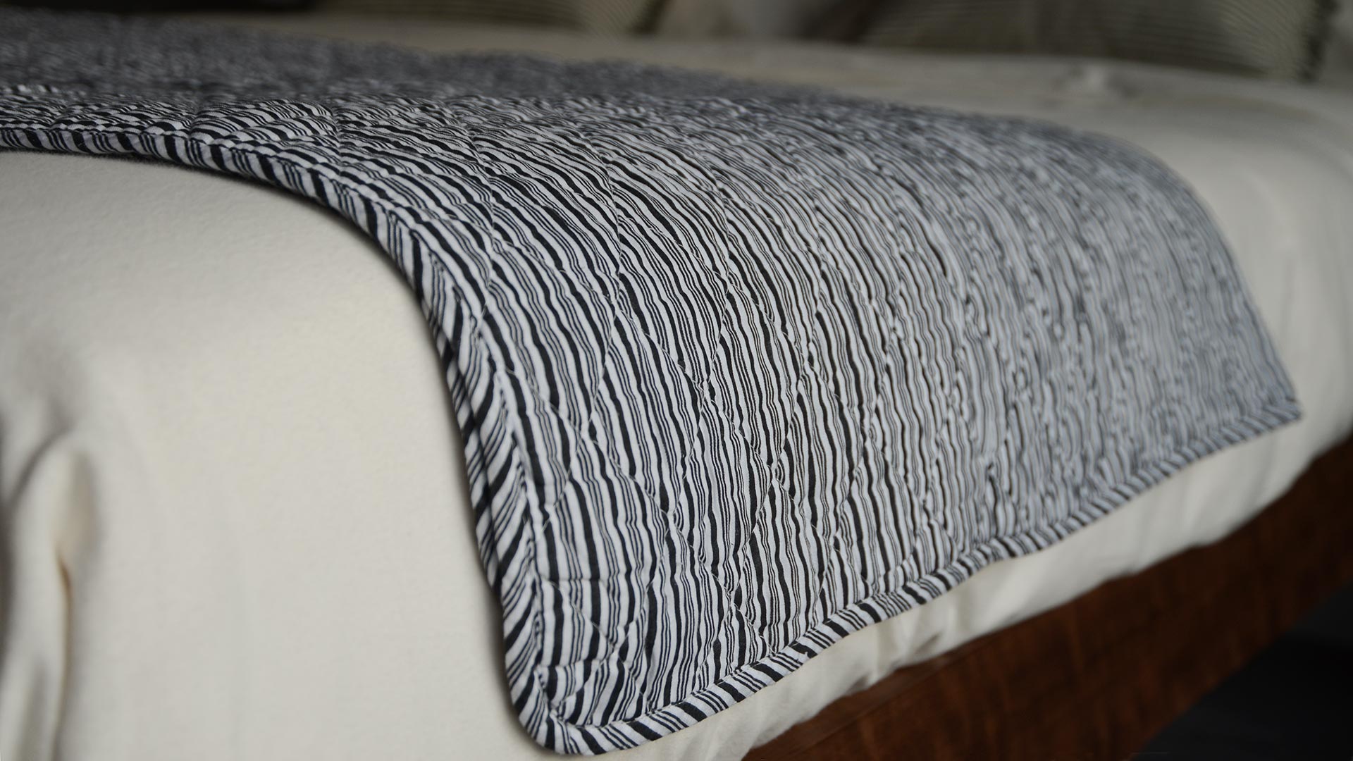 Stylish, cotton quilted throws. A lightly quilted blanket, made using soft cotton fabric with a multi-stripe pattern in black over a white background. It has a stitched design in ivory thread to create the ‘quilted’ effect.