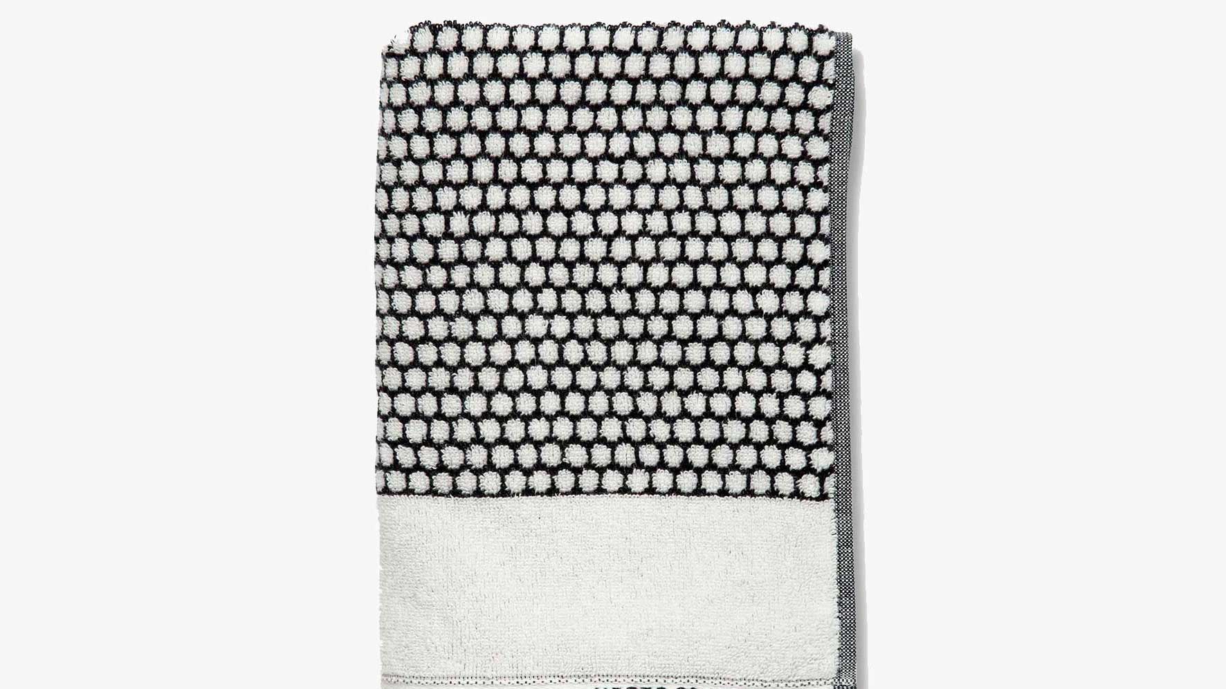 A collection of black and white towels from Danish design company Mette Ditmer. The collection includes a small guest towel, hand/hair towel and a large bath towel. The hand/hair towel and bath towel are available with a monochrome dot pattern (ivory spots on a black background). Whereas, the guest towel and bath towel have a tile design (ivory rectangles with a fine black grid/background).