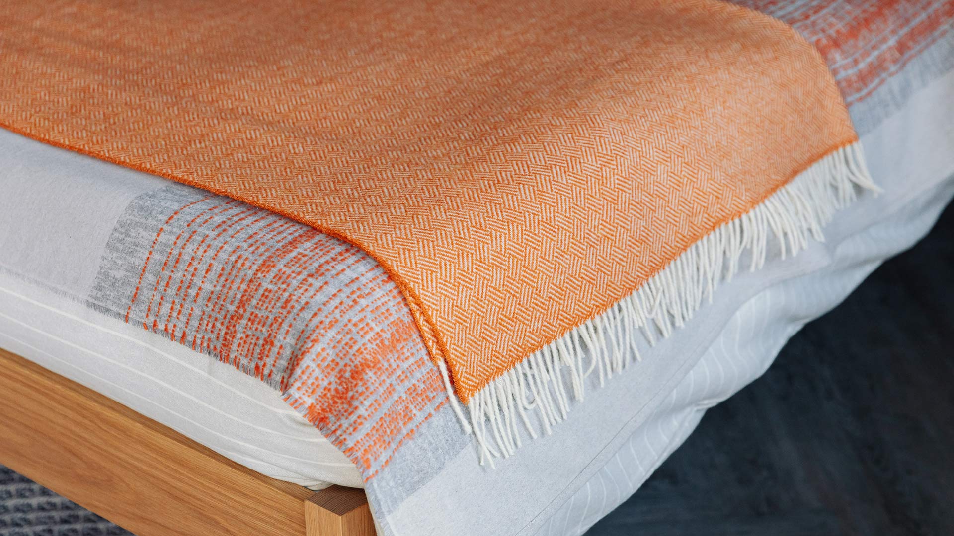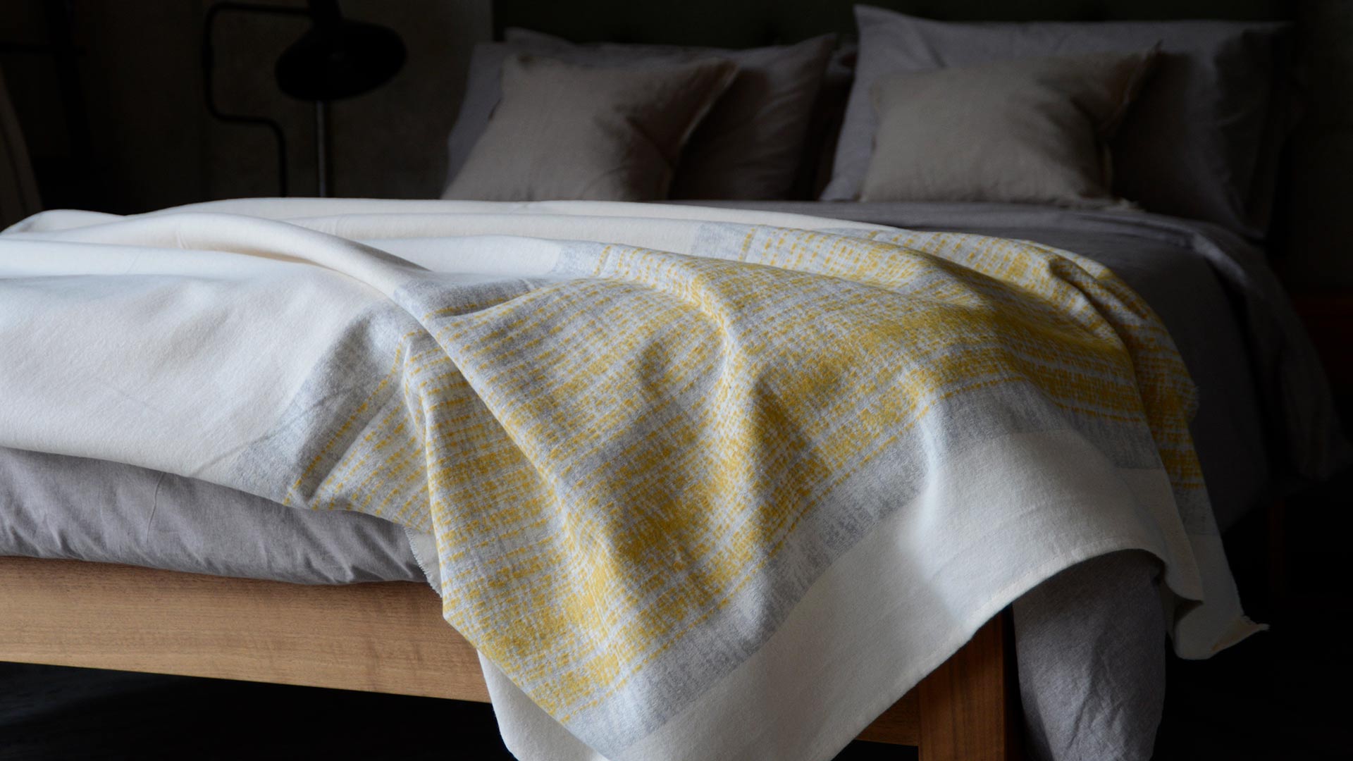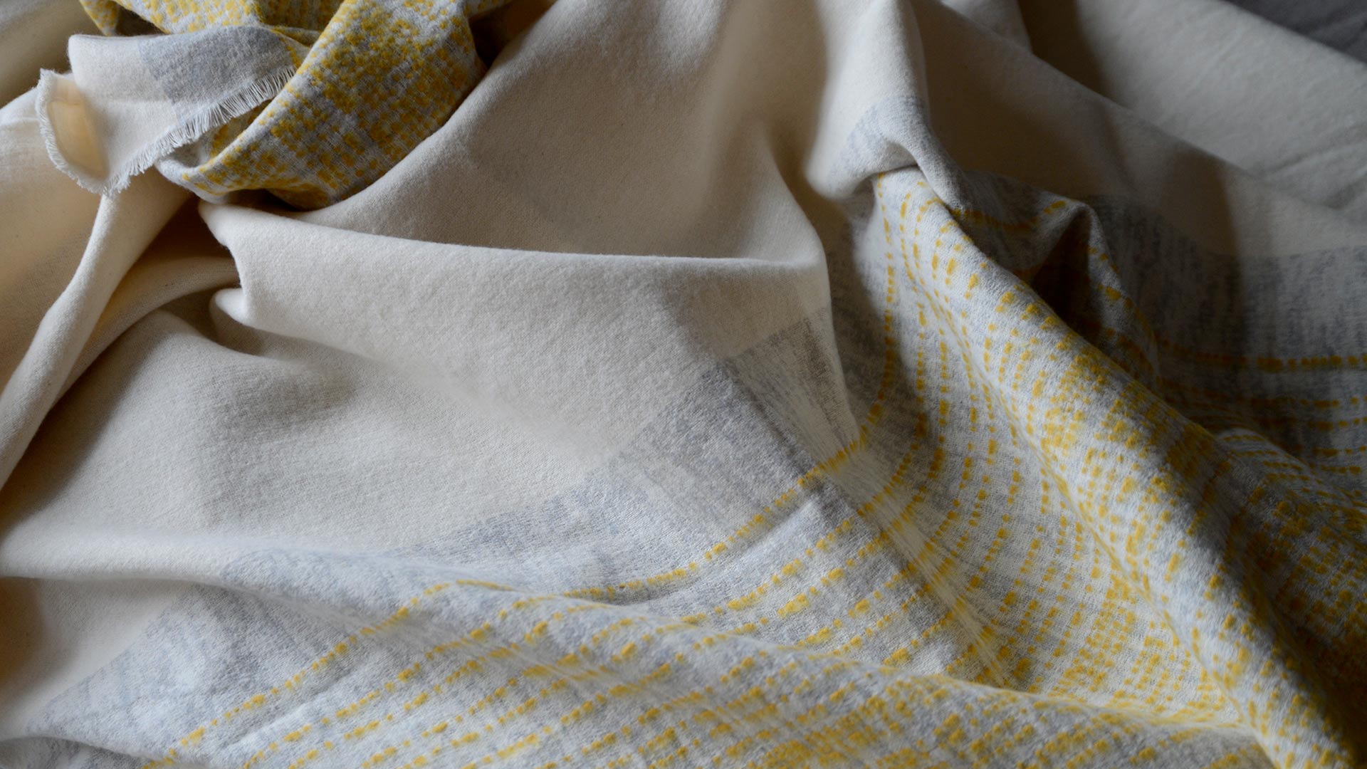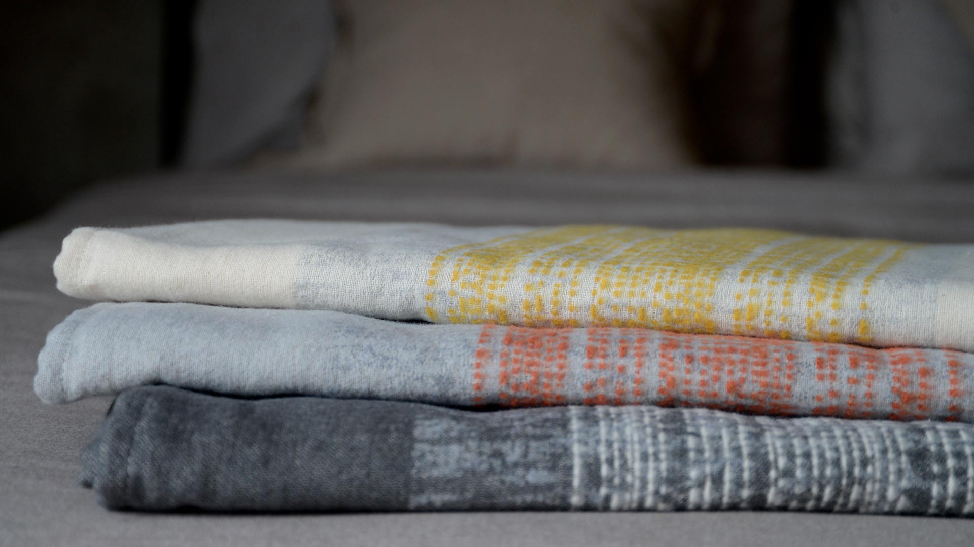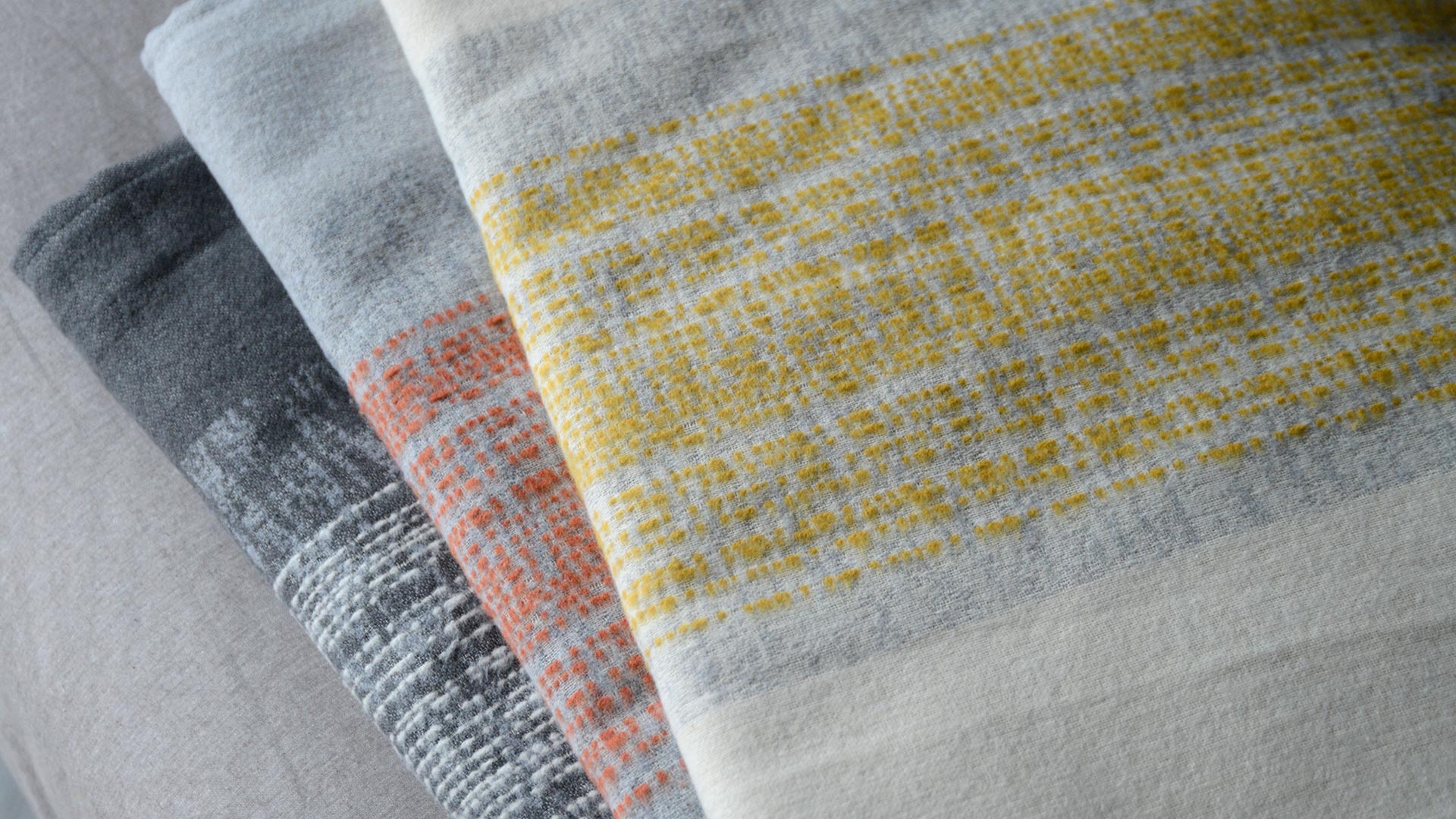 Available in three colour-ways: Deep Grey – White Stripes: A deep grey throw with broad stripes made up of fine white stripes and light grey patterns. Light Grey – Yellow Stripes: A light grey throw with broad stripes made up of fine rich yellow stripes and light grey patterns. Mid Grey – Red Stripes: A mid grey throw with broad stripes made up of fine tomato red stripes and grey patterns.