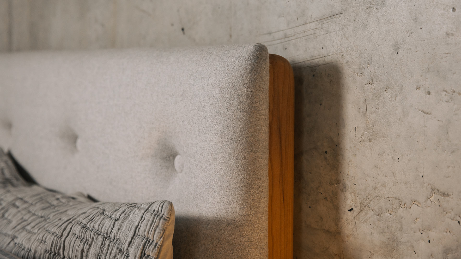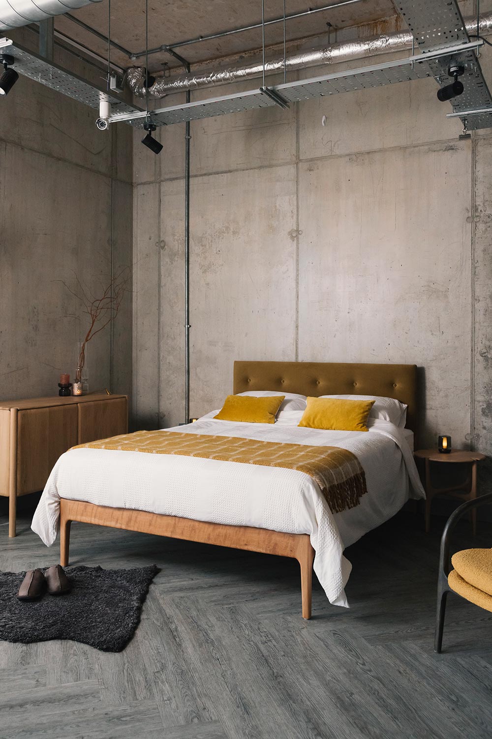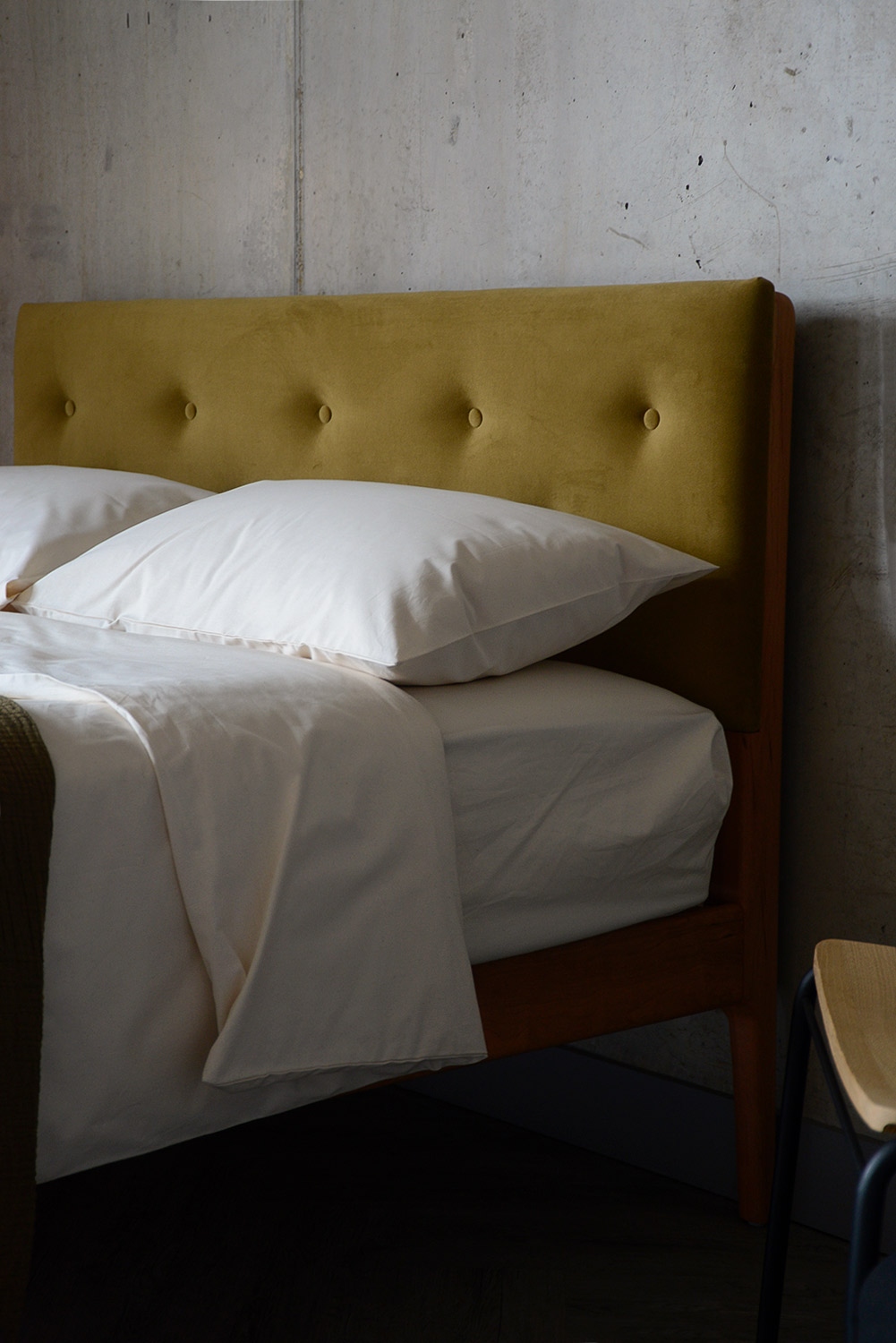 Our classic, mid-century inspired Bloomsbury bed base. Available here with a buttoned headboard, upholstered in our standard fabric options. You can choose from a range of fabric options for your headboard, and select one of our hardwood timbers for the base.