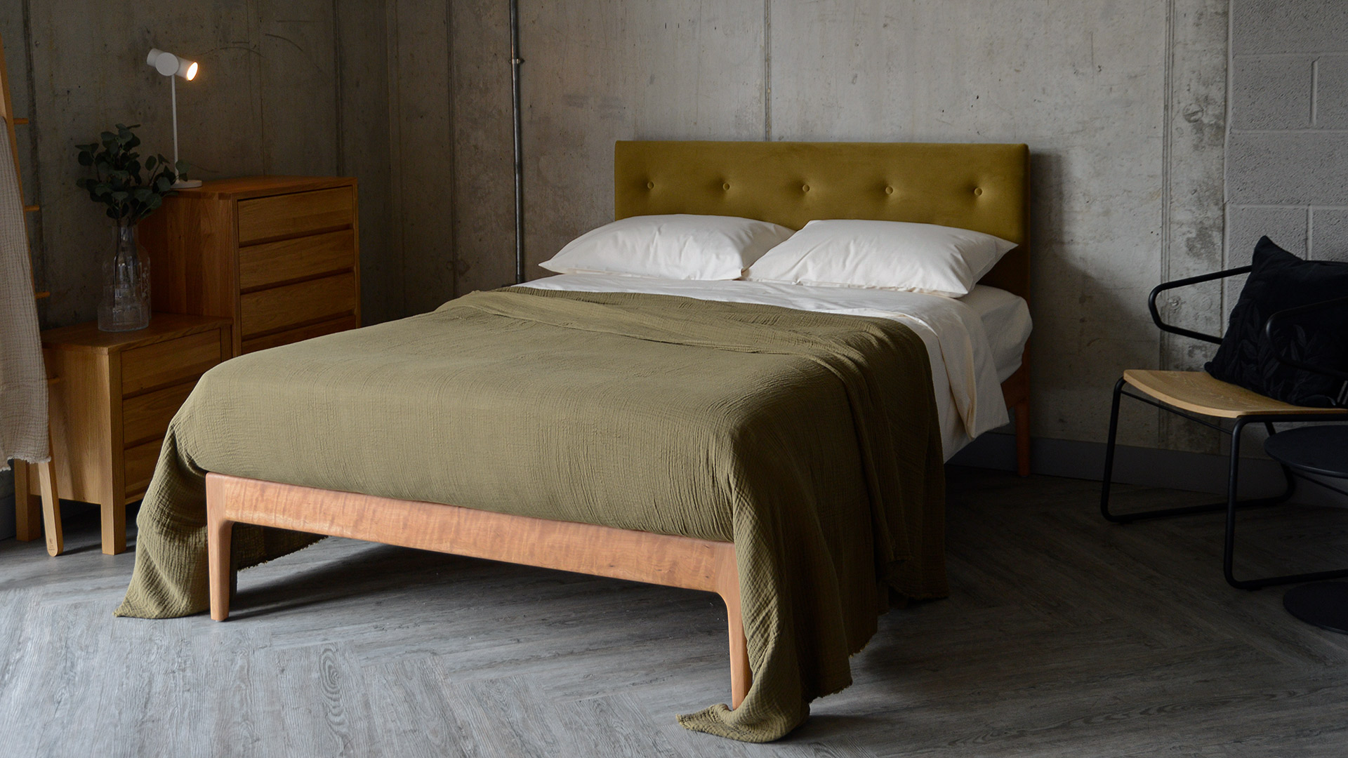 Pictured here in solid cherry with Amatheon (Porcelain) upholstery and Eco Velvet (Plantation) upholstery. The bed base is also shown in oak with the headboard upholstered in Amatheon (fabric in the colour, Linen). The headboard can be upholstered in you choice of colour, and the frame is also crafted in your choice of size and timber.