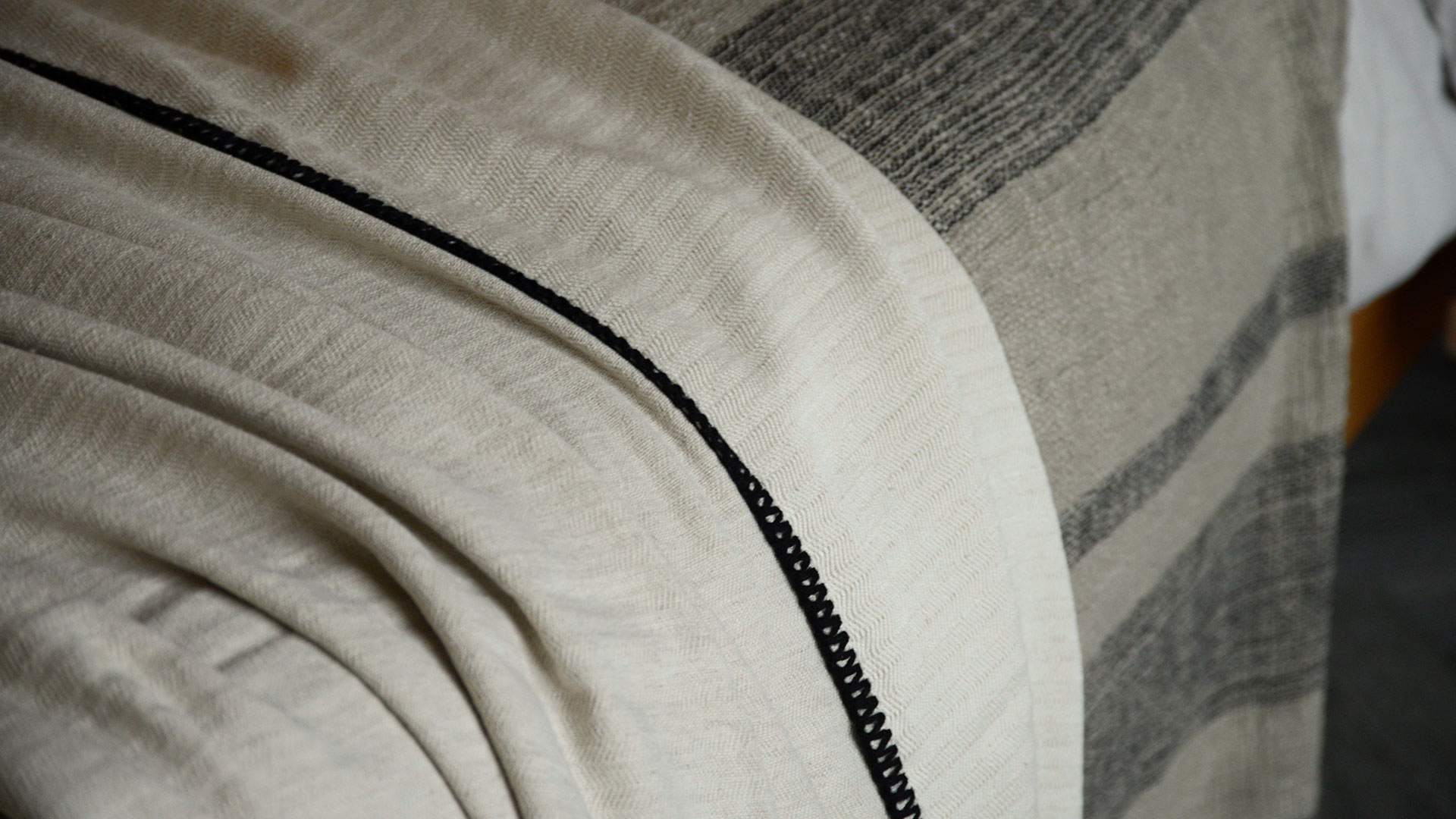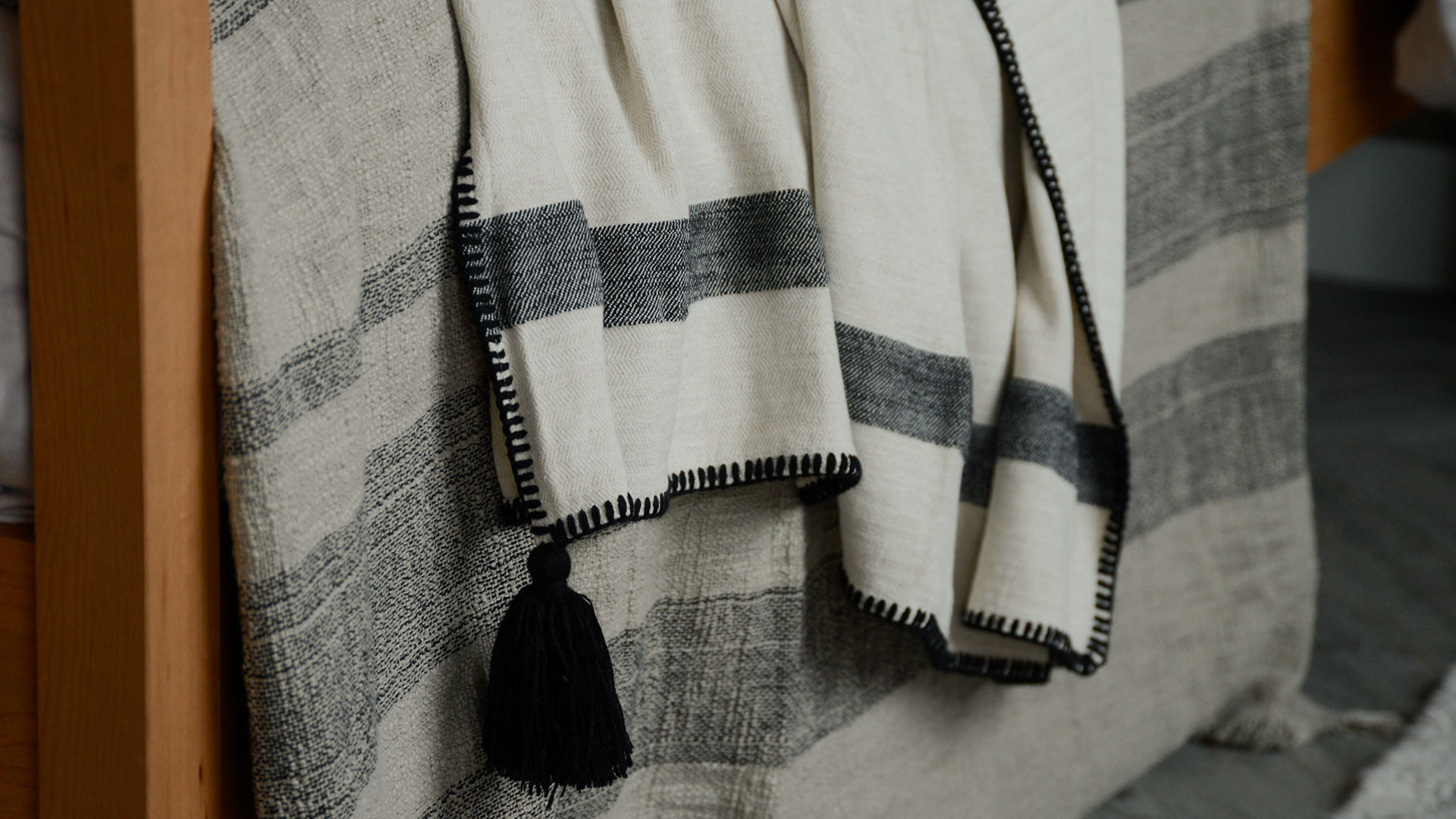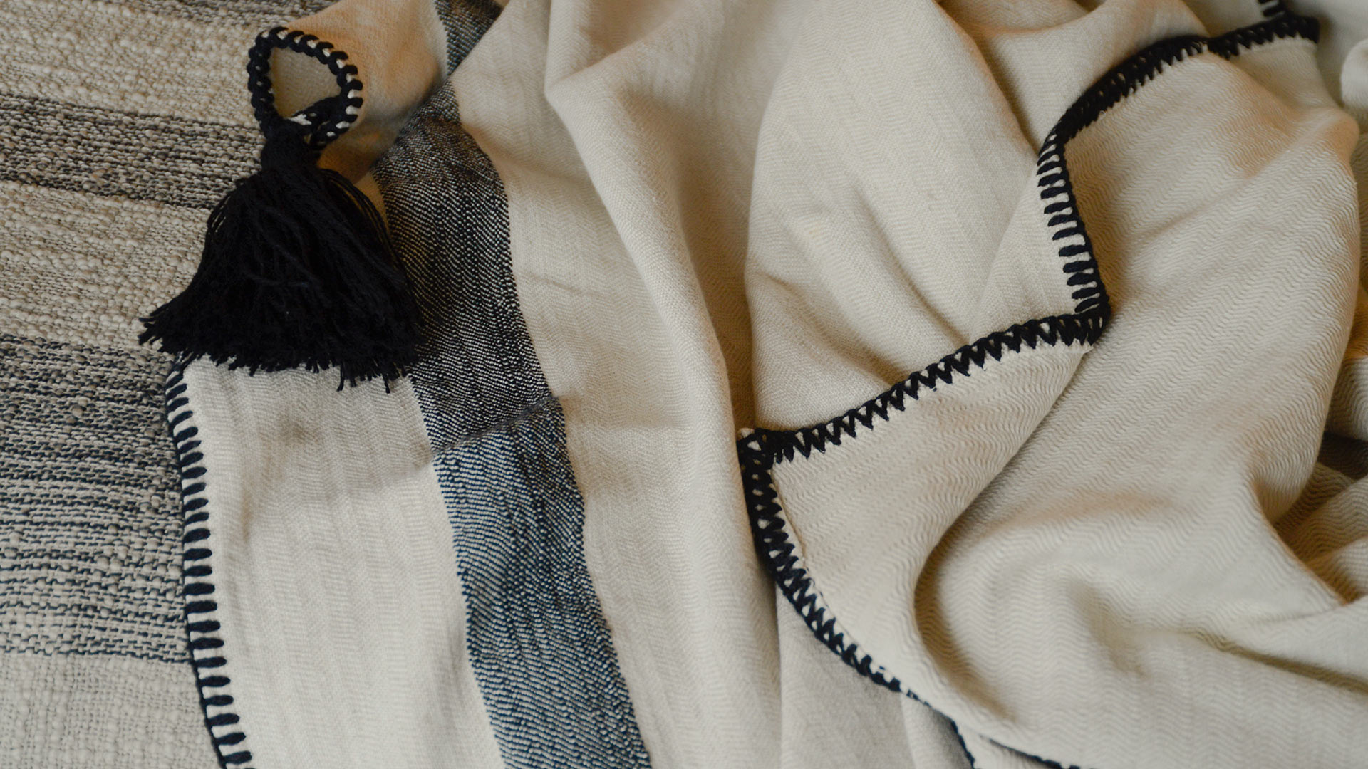 A large, soft throw in pale ecru and black. Complete with a large black tassel to one corner and a black blanket stitch detail.