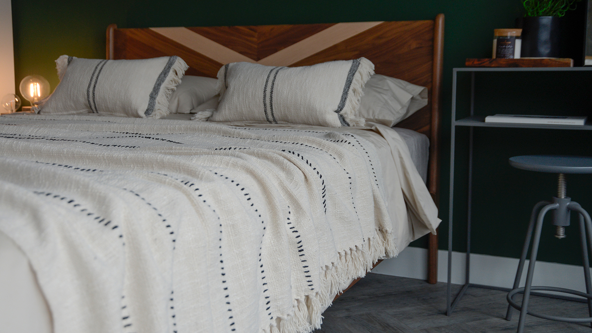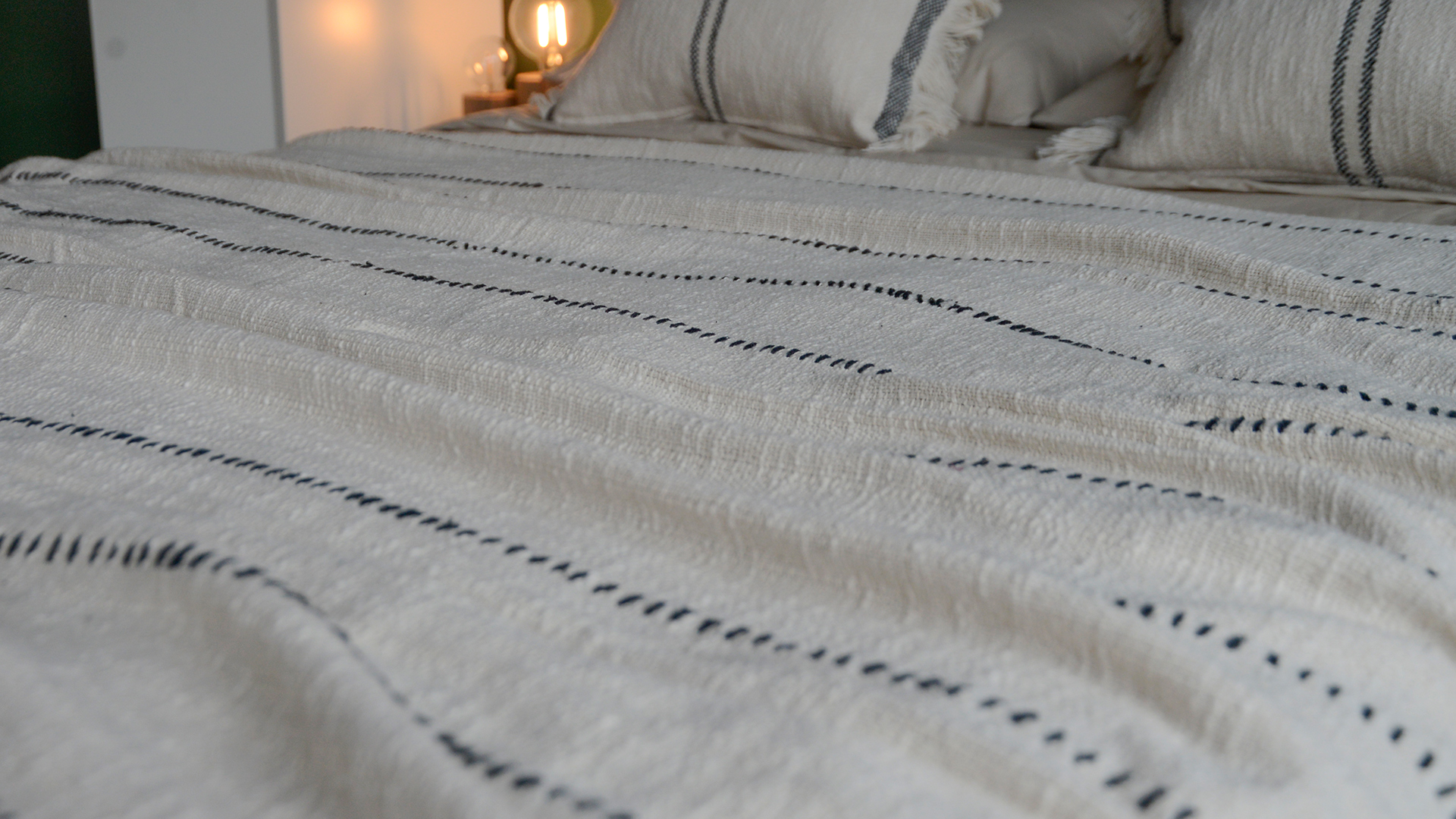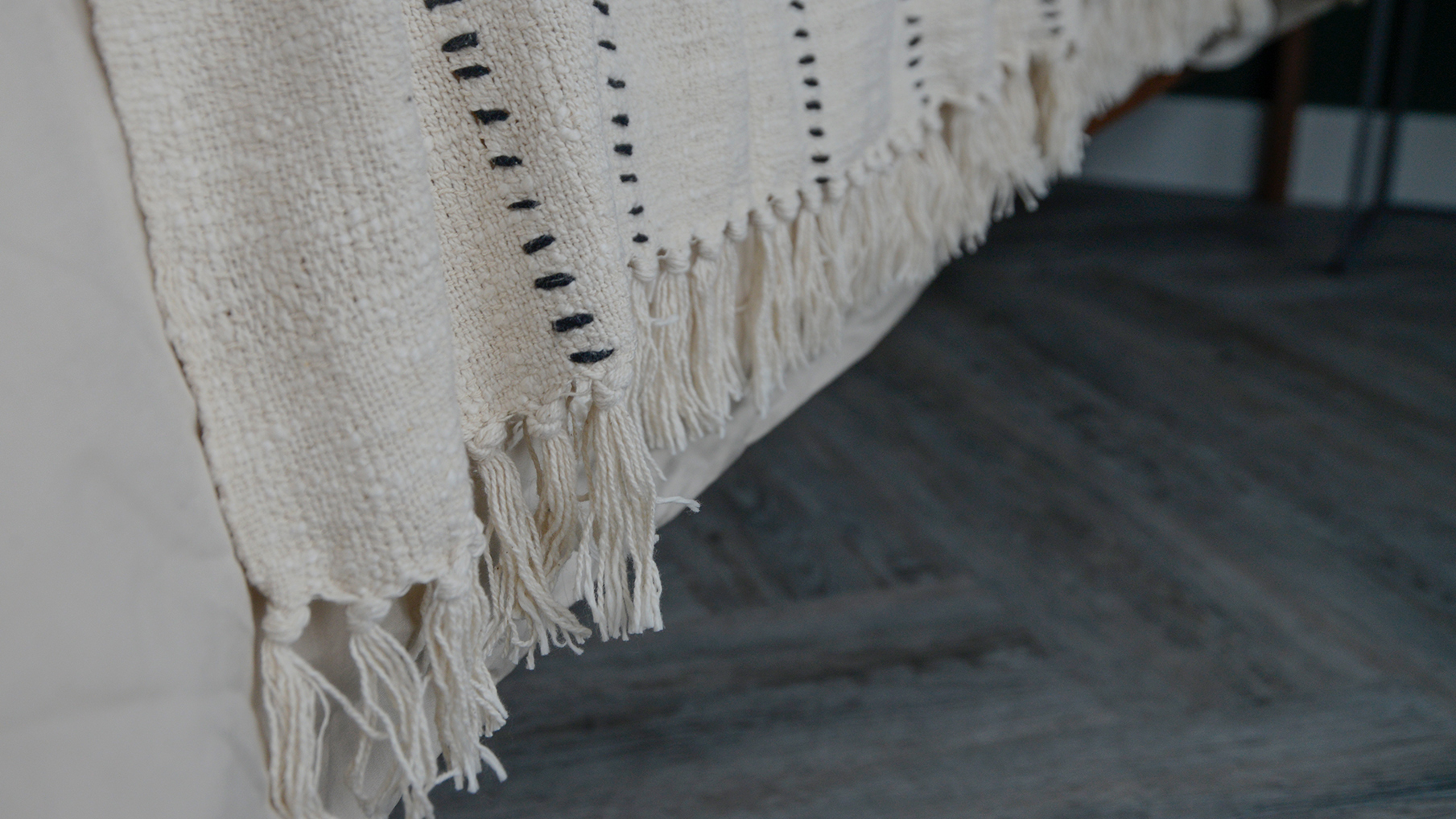 Softly textured boho woven cotton throw, in soft ivory and black. Perfect for spreading out across your bed or over the arm of your sofa. Styled here with the Andas cushions.
