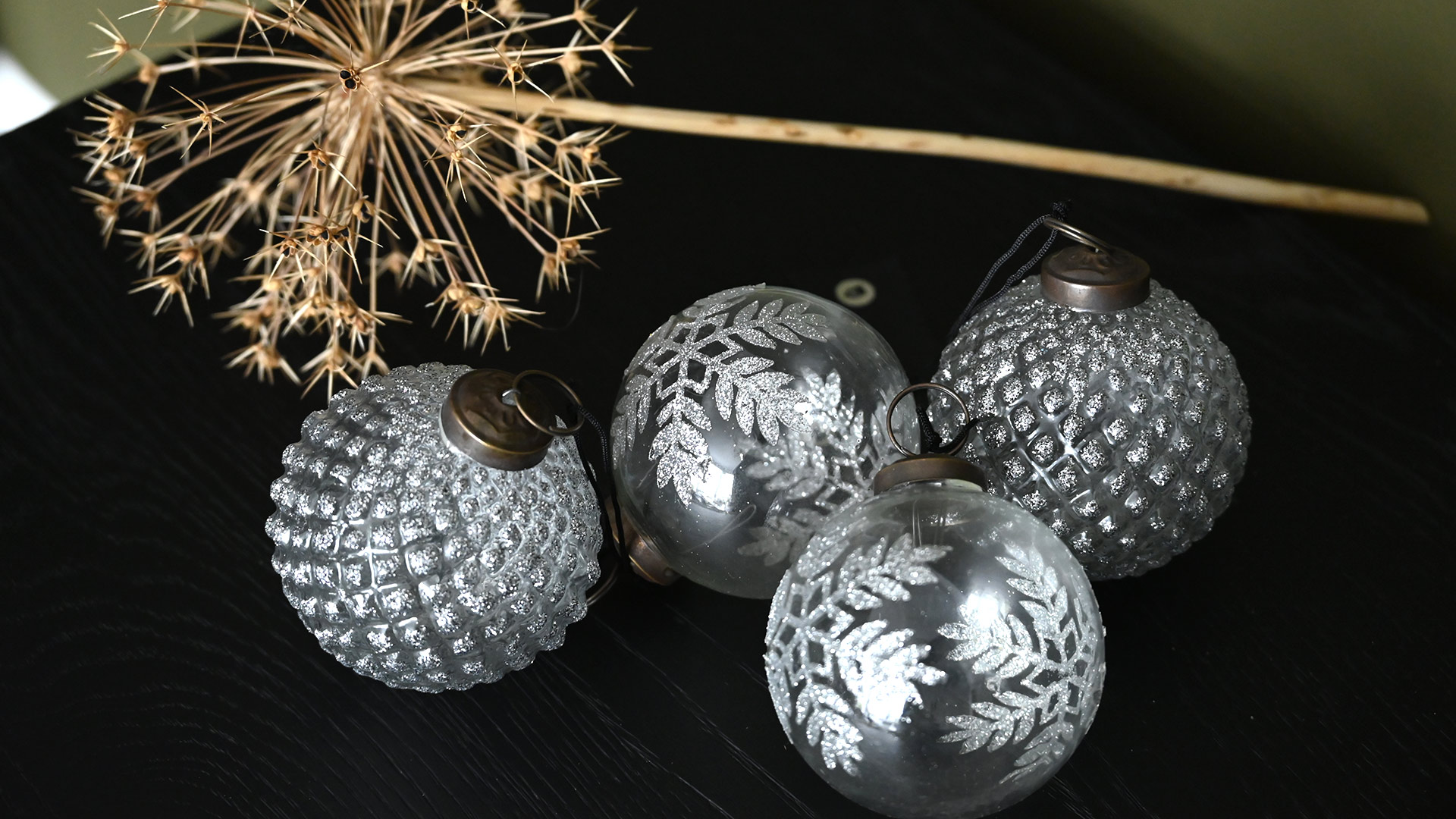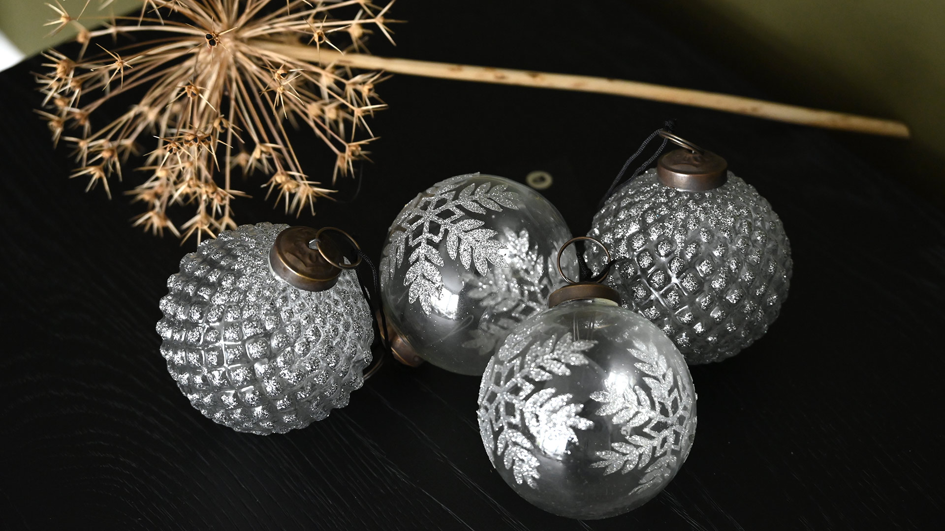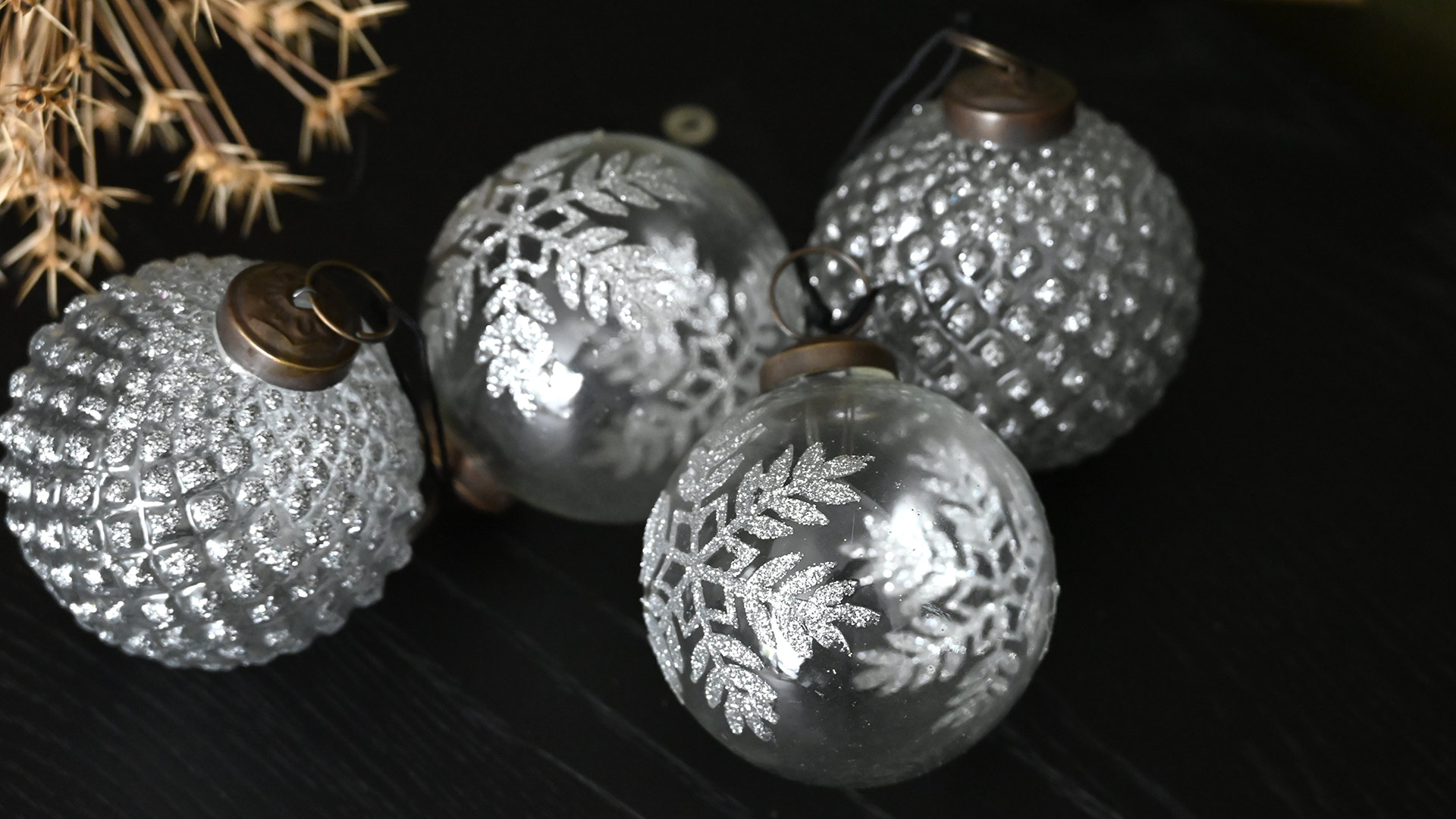 Handcrafted, luxury glass christmas decorations with silver decoration. This set of four ornaments exudes style and sparkle. Perfect for adorning your Christmas tree whether you want a vintage look or a contemporary festive style.