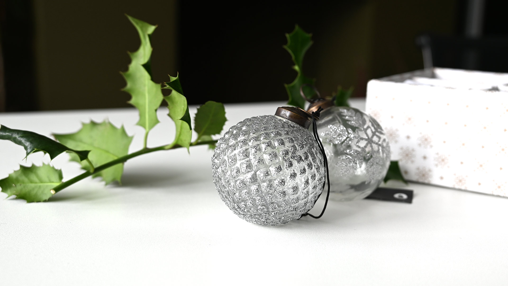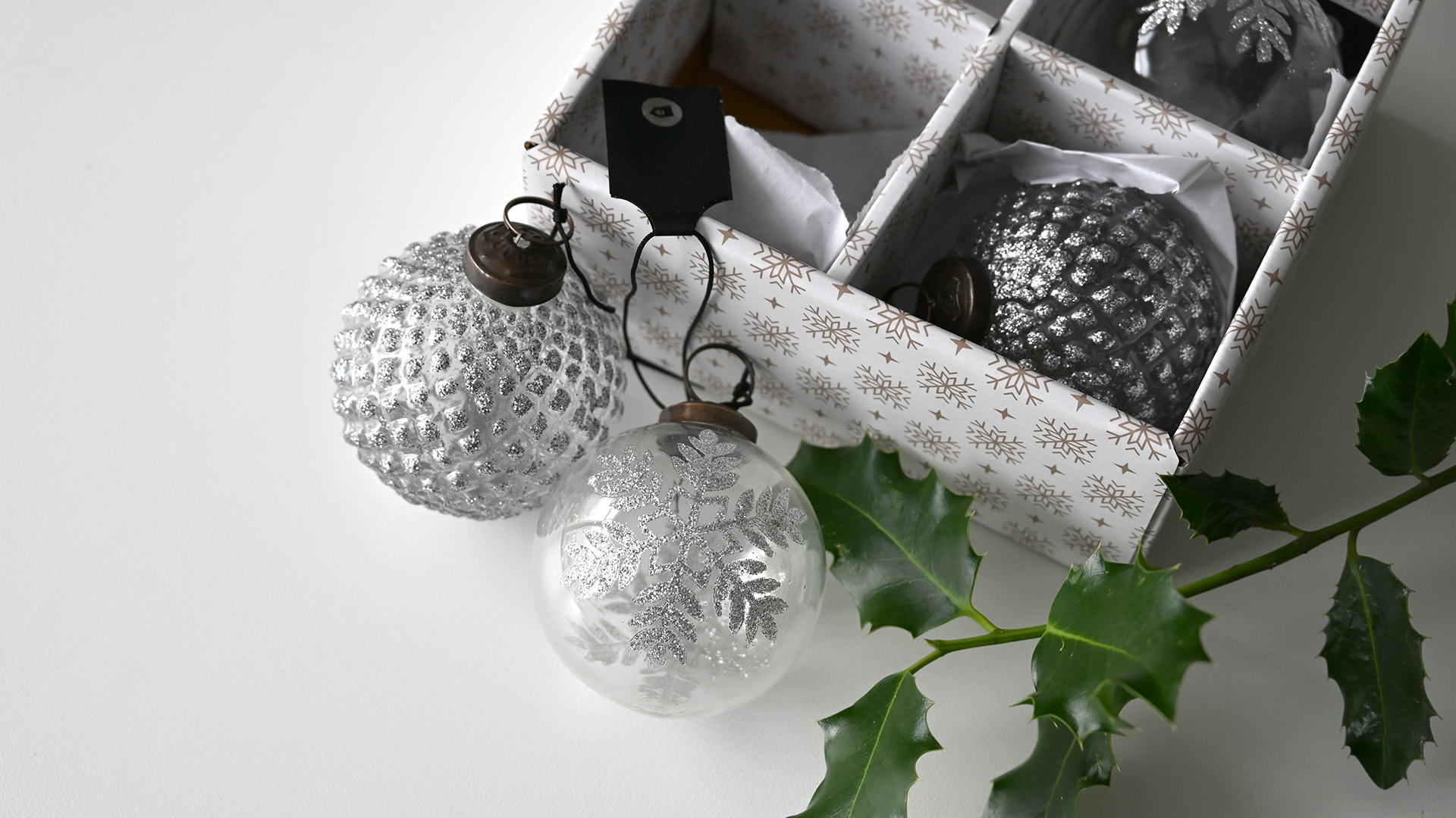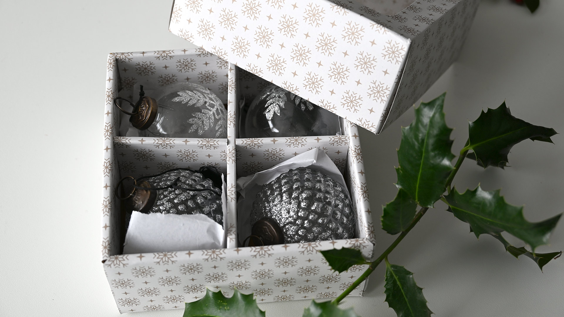 A box of luxury glass Christmas decorations decorated in sparkling silver. Four luxury handmade glass ornaments, two of each design.