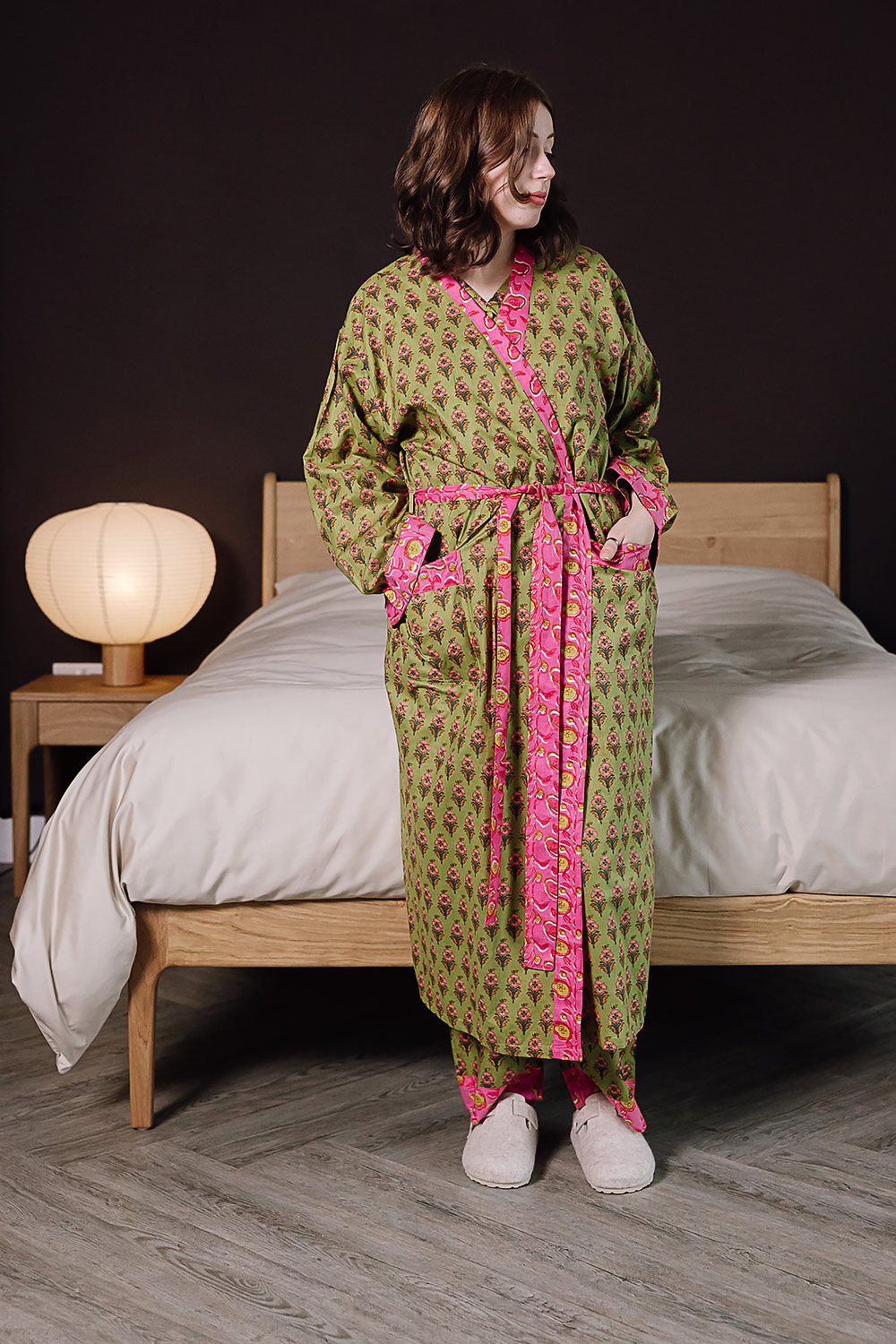 This pretty printed cotton floral robe is in 100% fine, soft cotton. Airy and light-weight, this printed cotton robe boasts a beautiful olive green base colour and contrasting pink trim. Printed over with a bold floral print in shades of pink blue and orange.