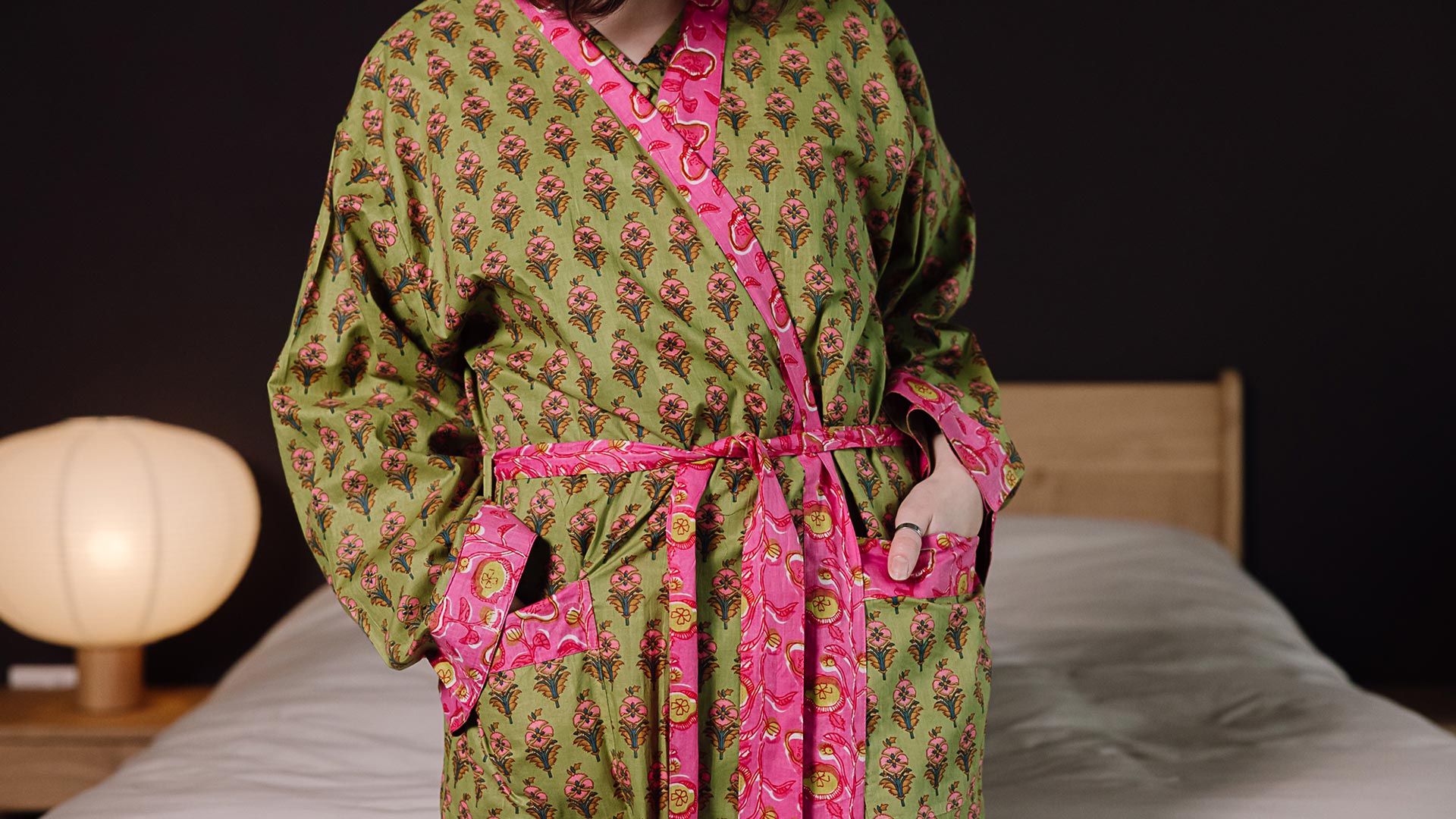 Lightweight, printed cotton robe with a floral print on a bold bright green and pink colour way. This robe has two front pockets with pink floral detail and a tie belt.