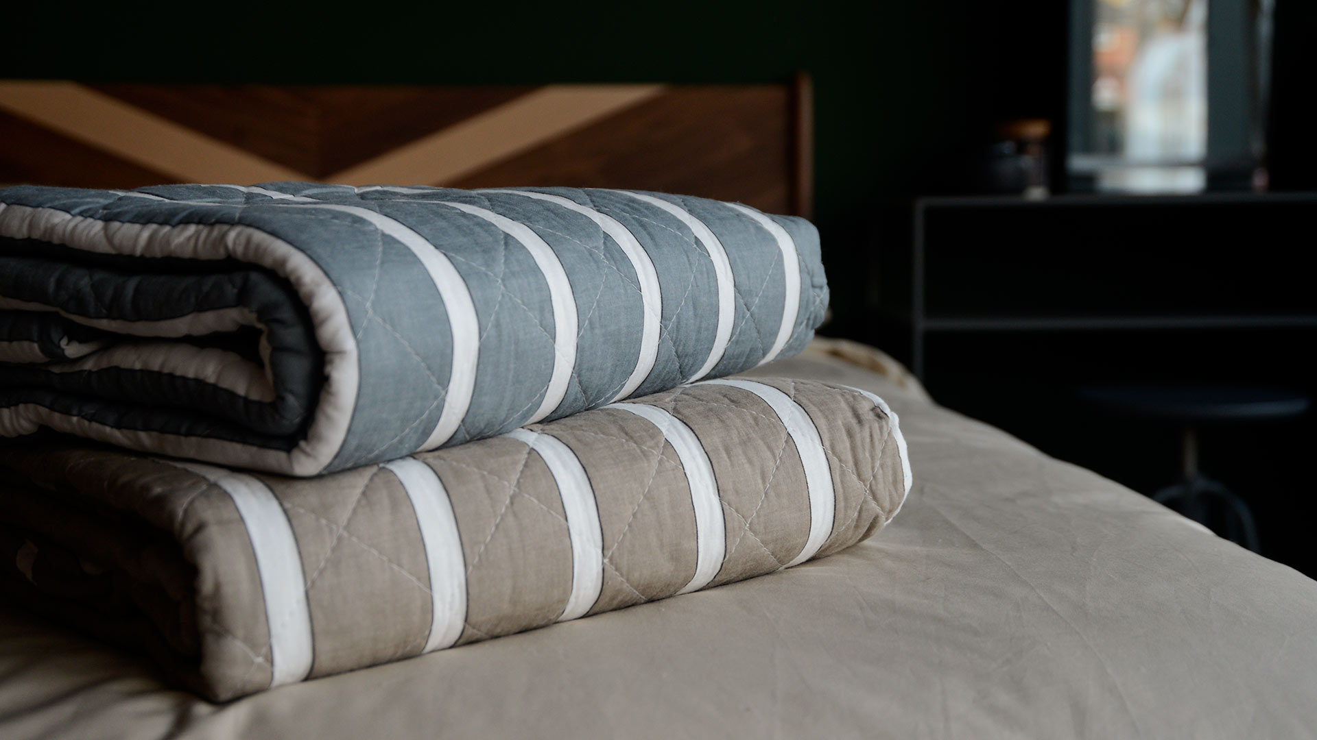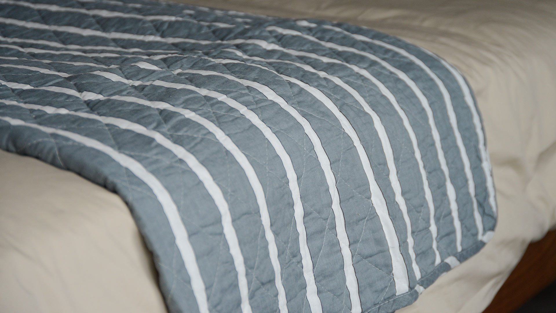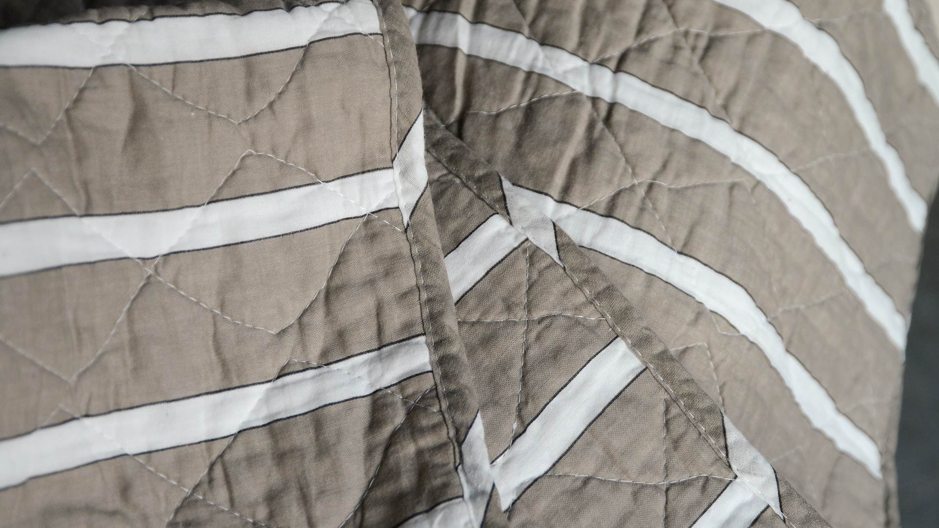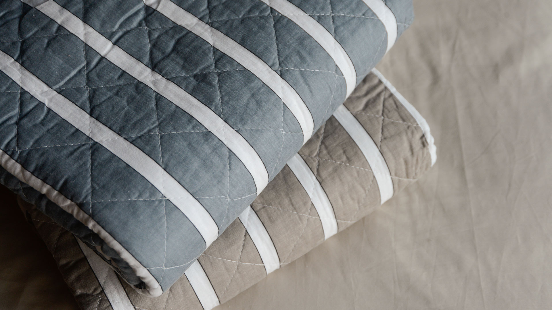 Stylish, striped cotton quilted throws, available in two colour-ways: a cool blue-grey or taupe, with white stripes and a stitched diamond pattern design. These cosy quilts can be used over the end of your bed or to snuggle under on your sofa.