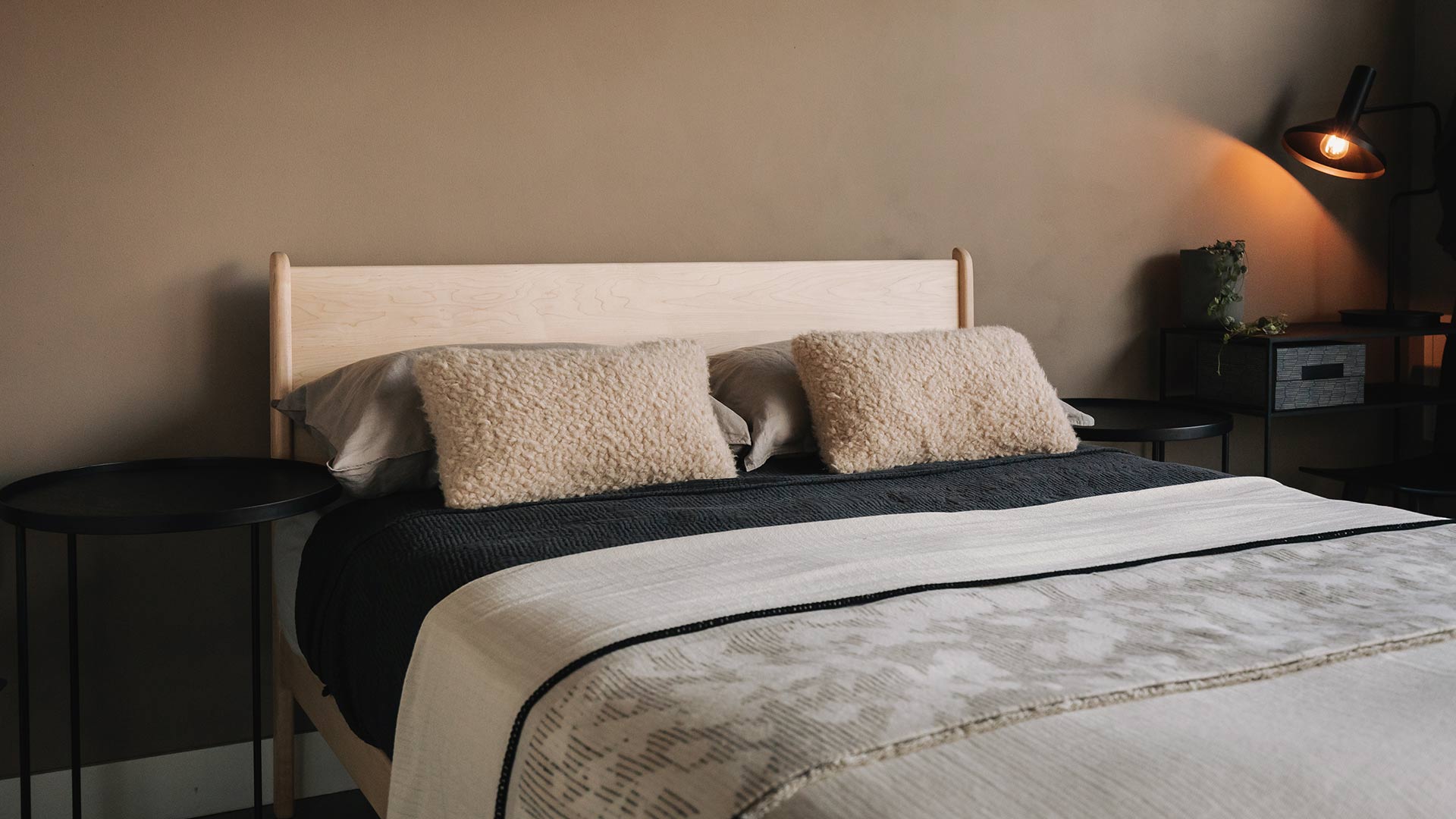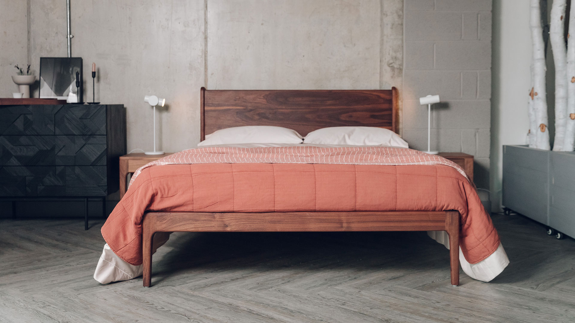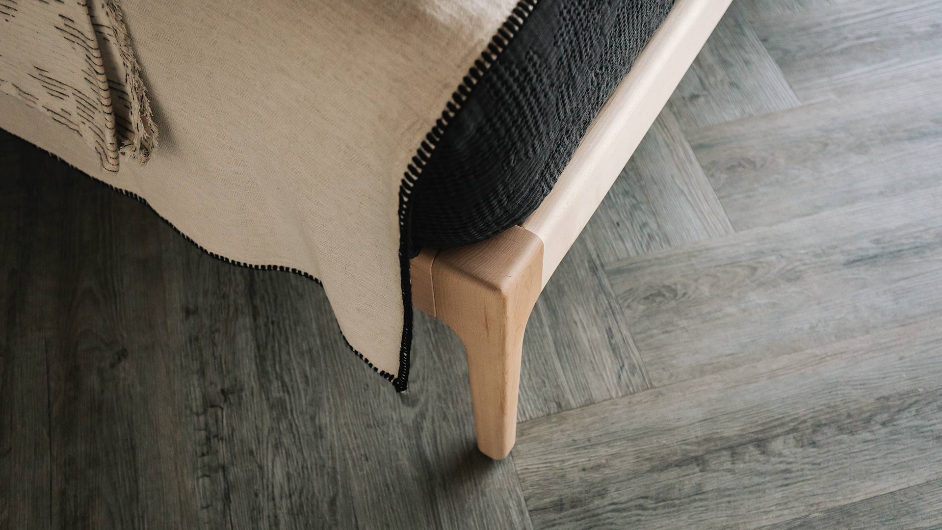 The Camden is a beautiful, solid wood, handmade bed with shaped legs and soft curves to the edges. Shown here in solid oak, dark walnut and pale maple. Any one of our sustainably sourced timbers are ideal for the Camden, where the natural, differing directions of the grain on the legs and headboard make for an interesting detail.