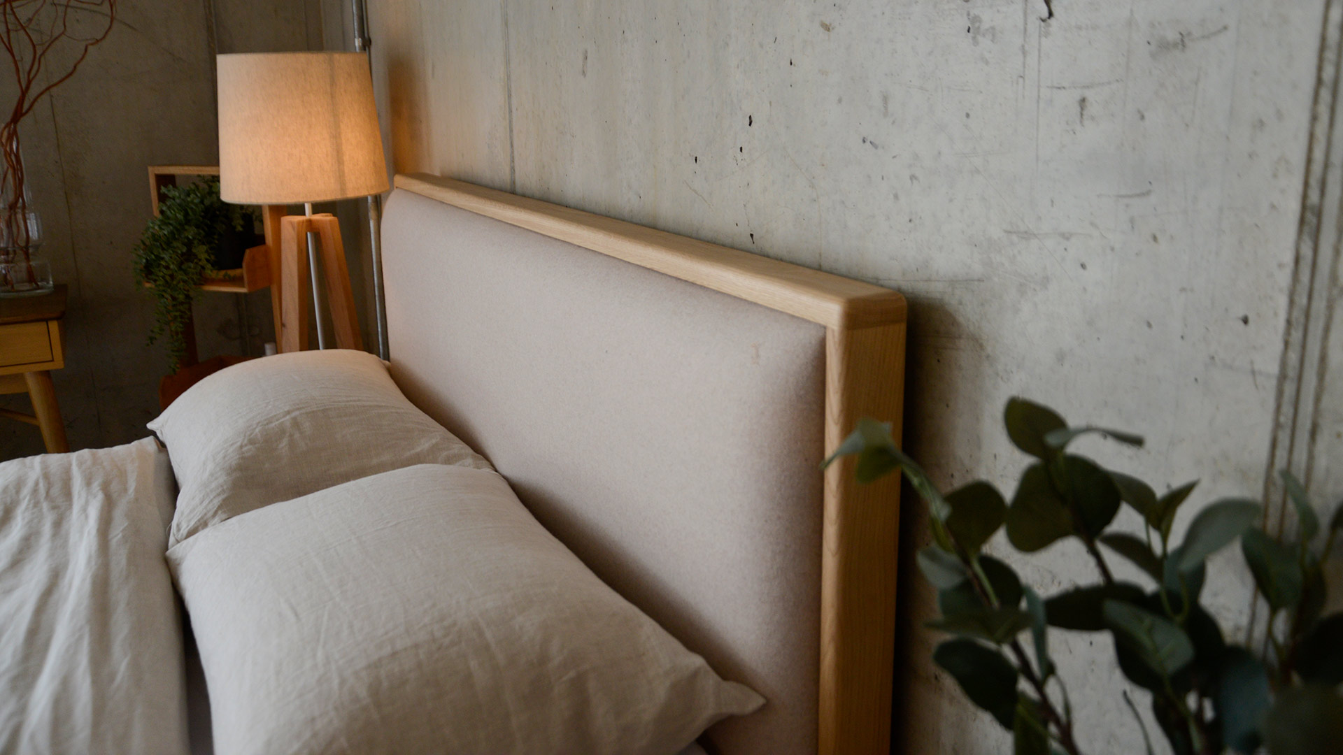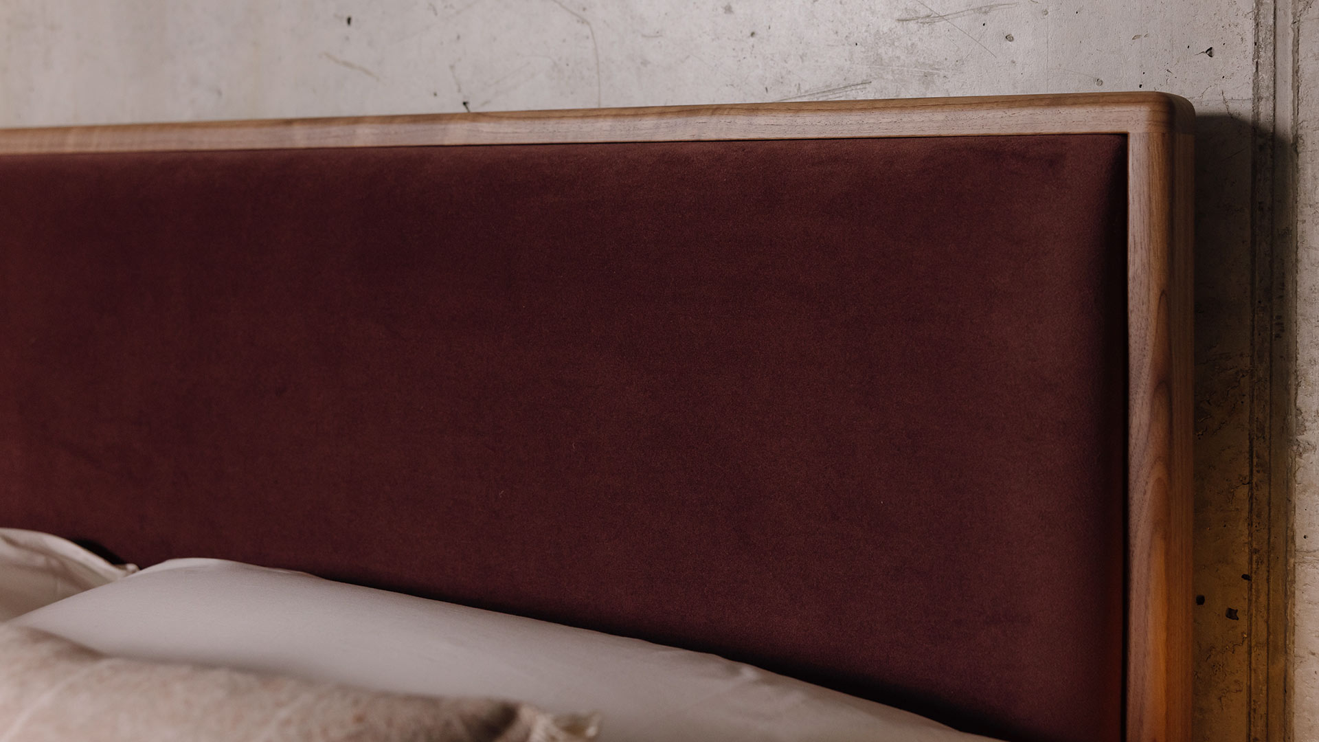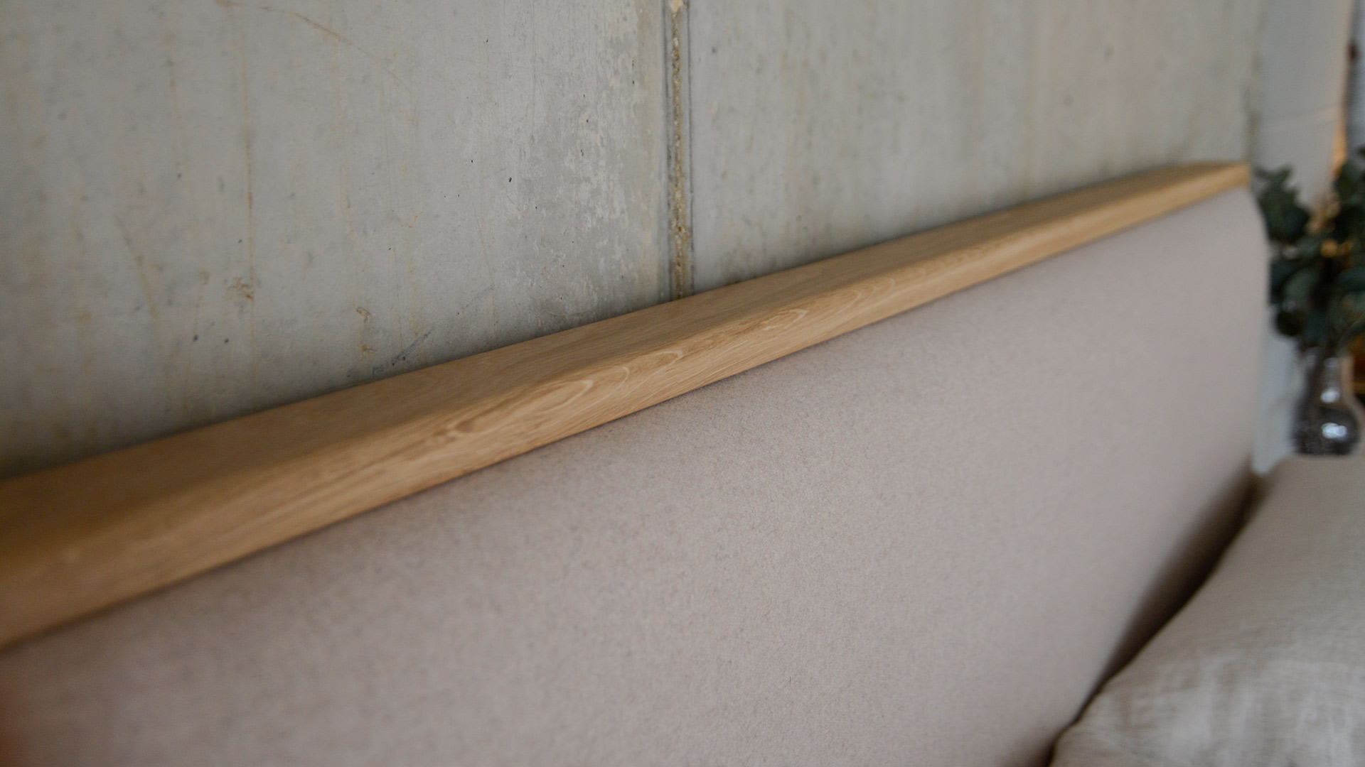 The above images show a walnut base with a headboard covered in eco-velvet, along with images of an oak frame, with the headboard upholstered in Amatheon Fabric (in the colour Wisp). Click on the thumbnail images to see a number of images with various timber and fabric combinations.