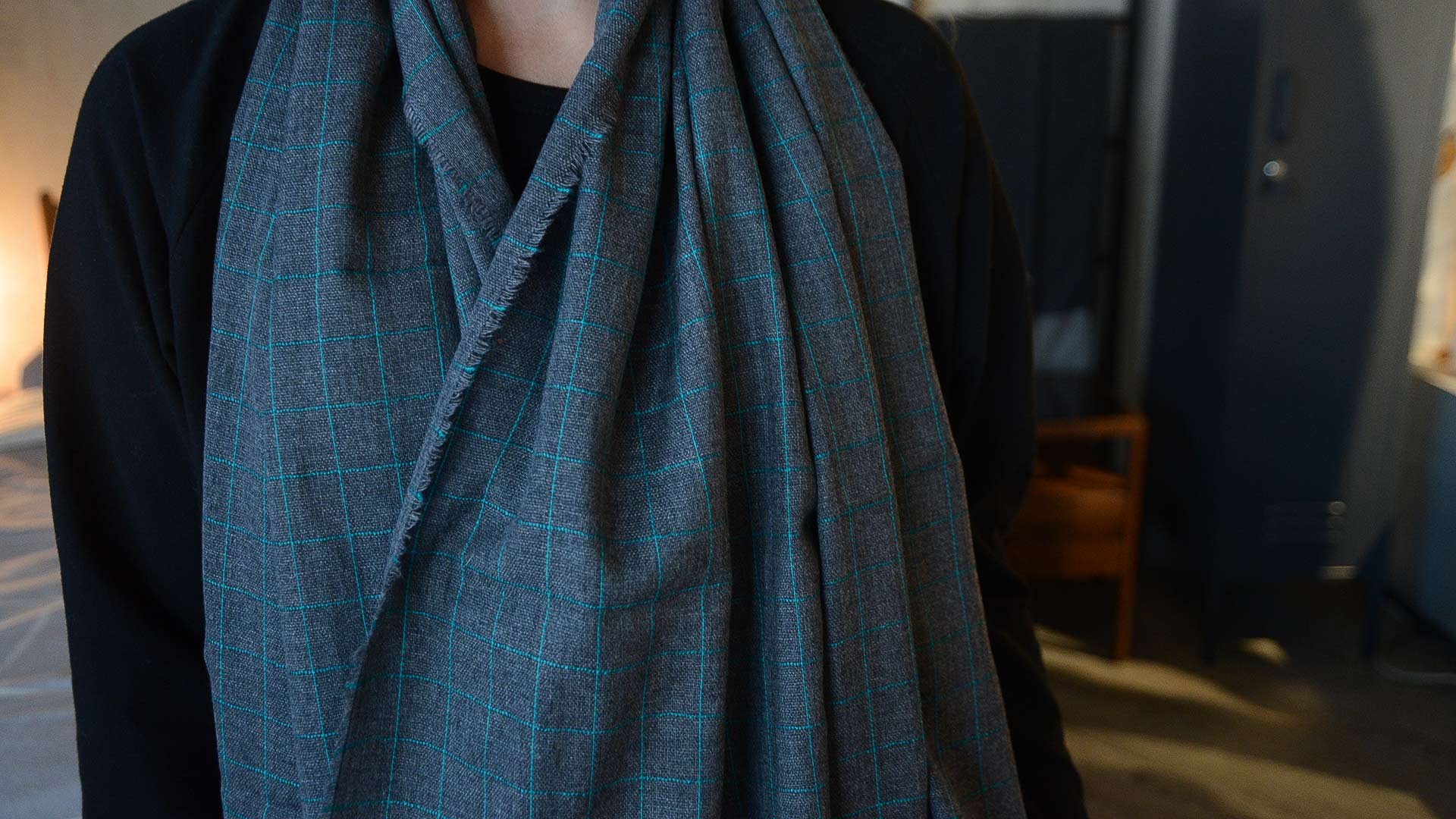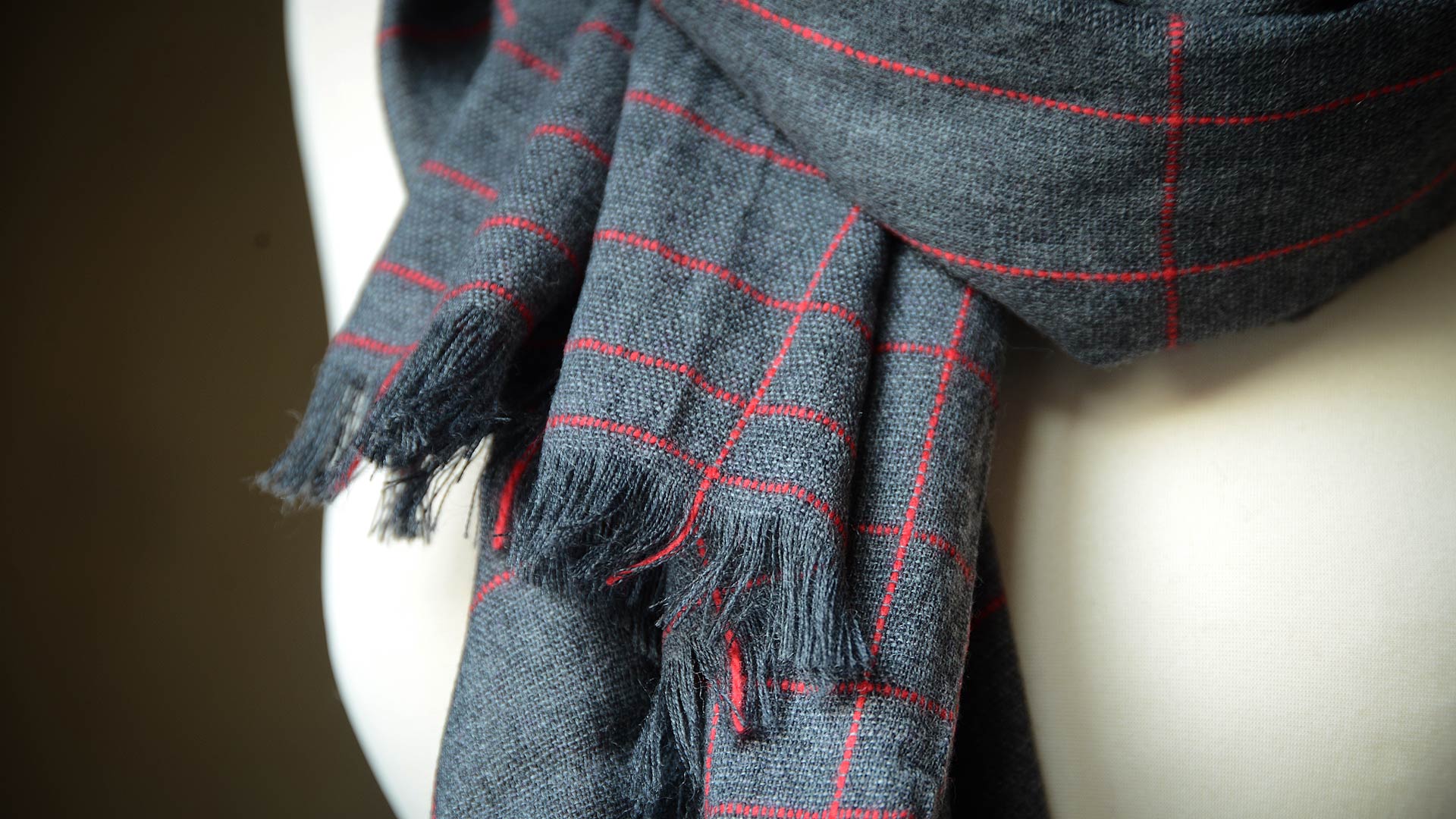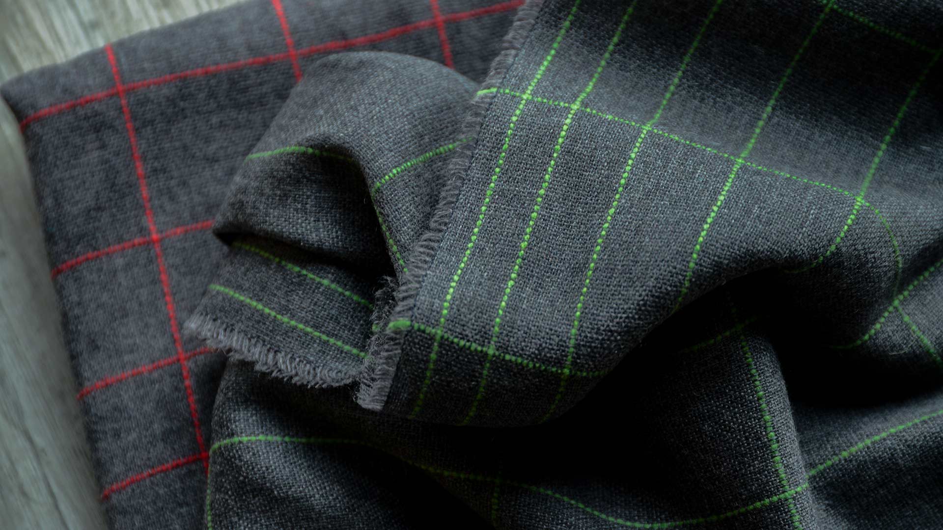 Red: a deep red check over a charcoal background Green: a bright green check over a charcoal background Teal: a windowpane design in teal over a charcoal background Yellow: a variegated check in yellow over a silver-grey background