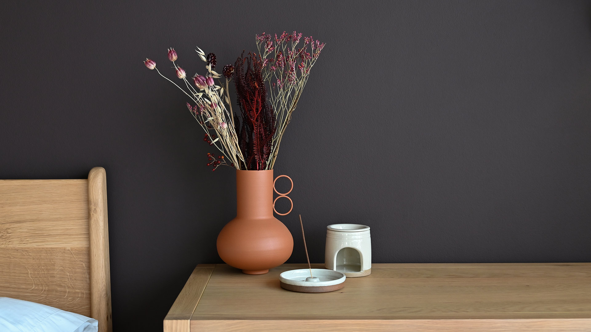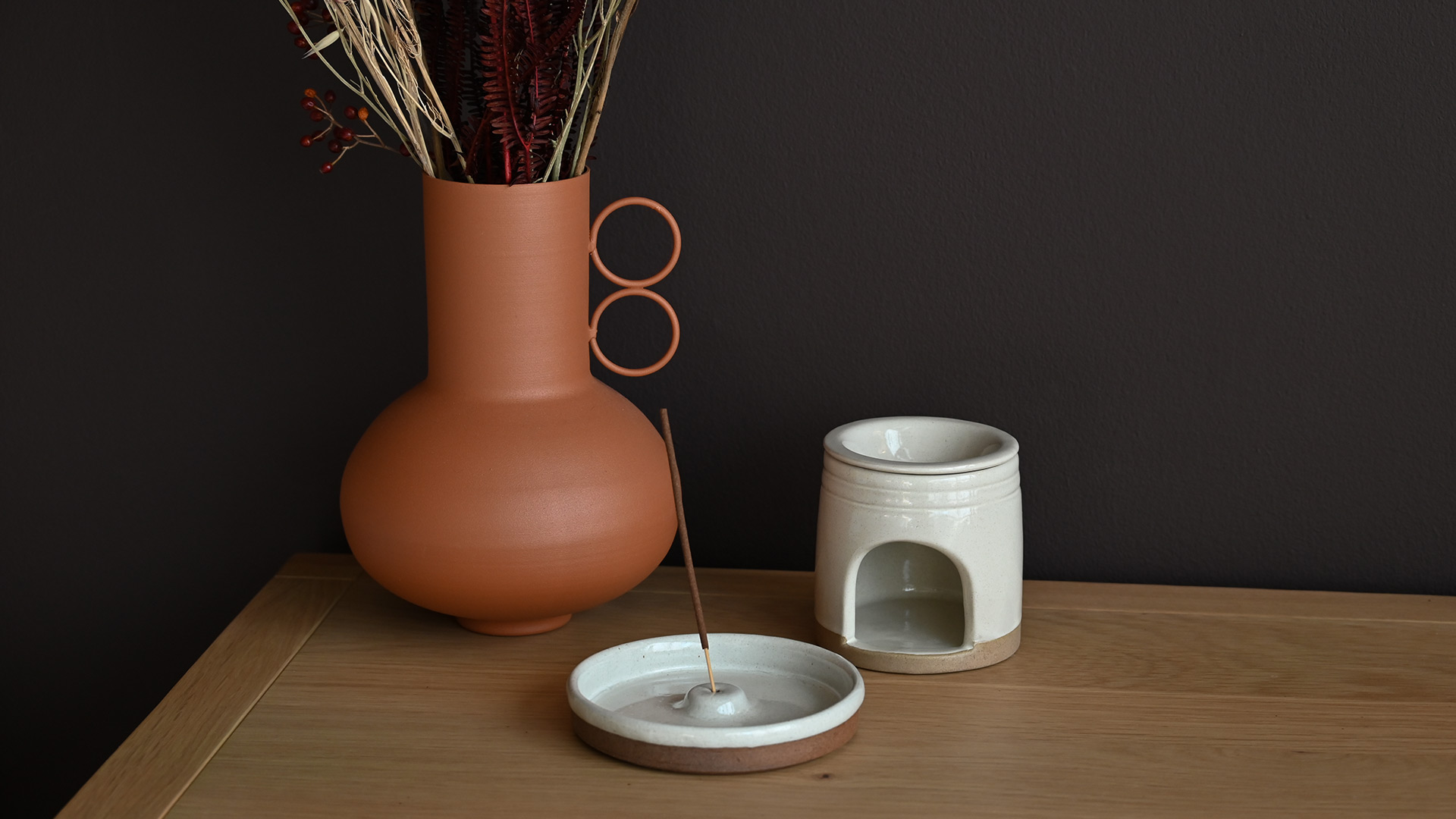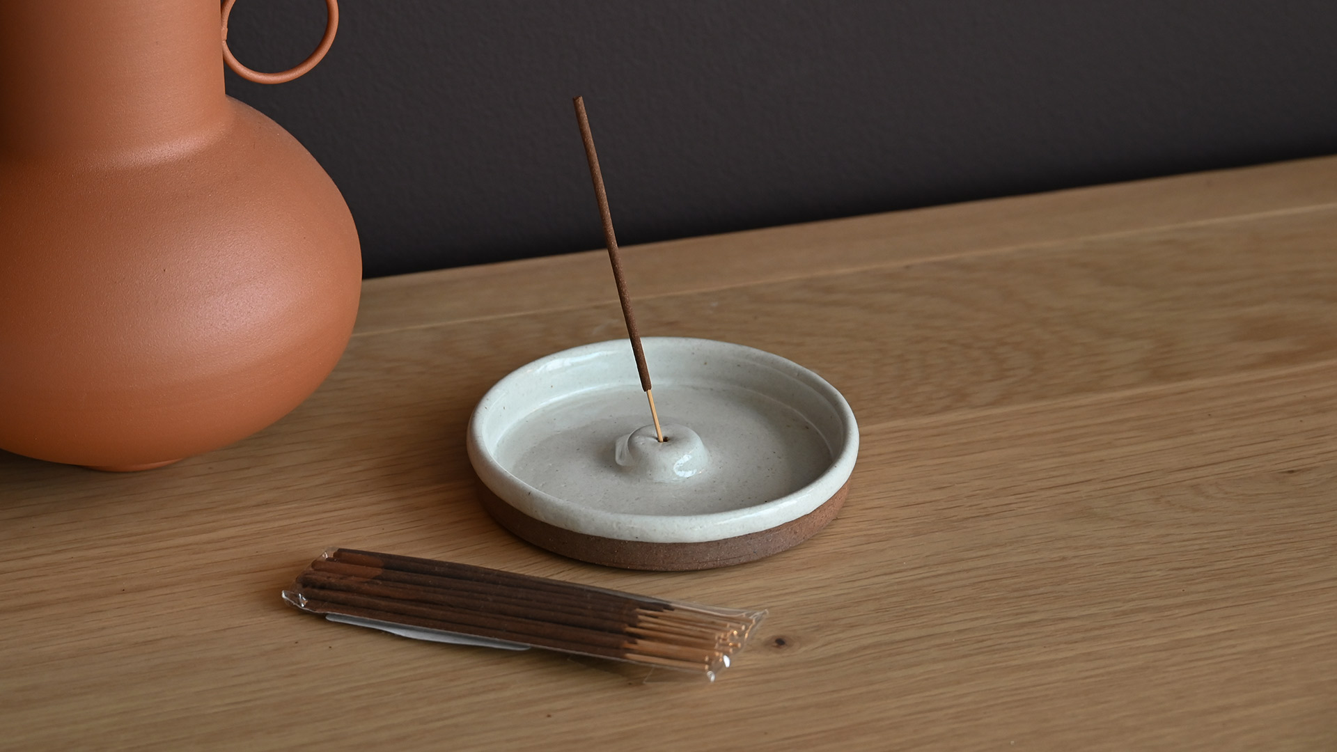 A beautifully simple round ceramic incense holder, paired with classic Nag Champa incense sticks. The gently curved dish catches ash neatly as the incense burns, combining practical design with a clean, modern aesthetic.