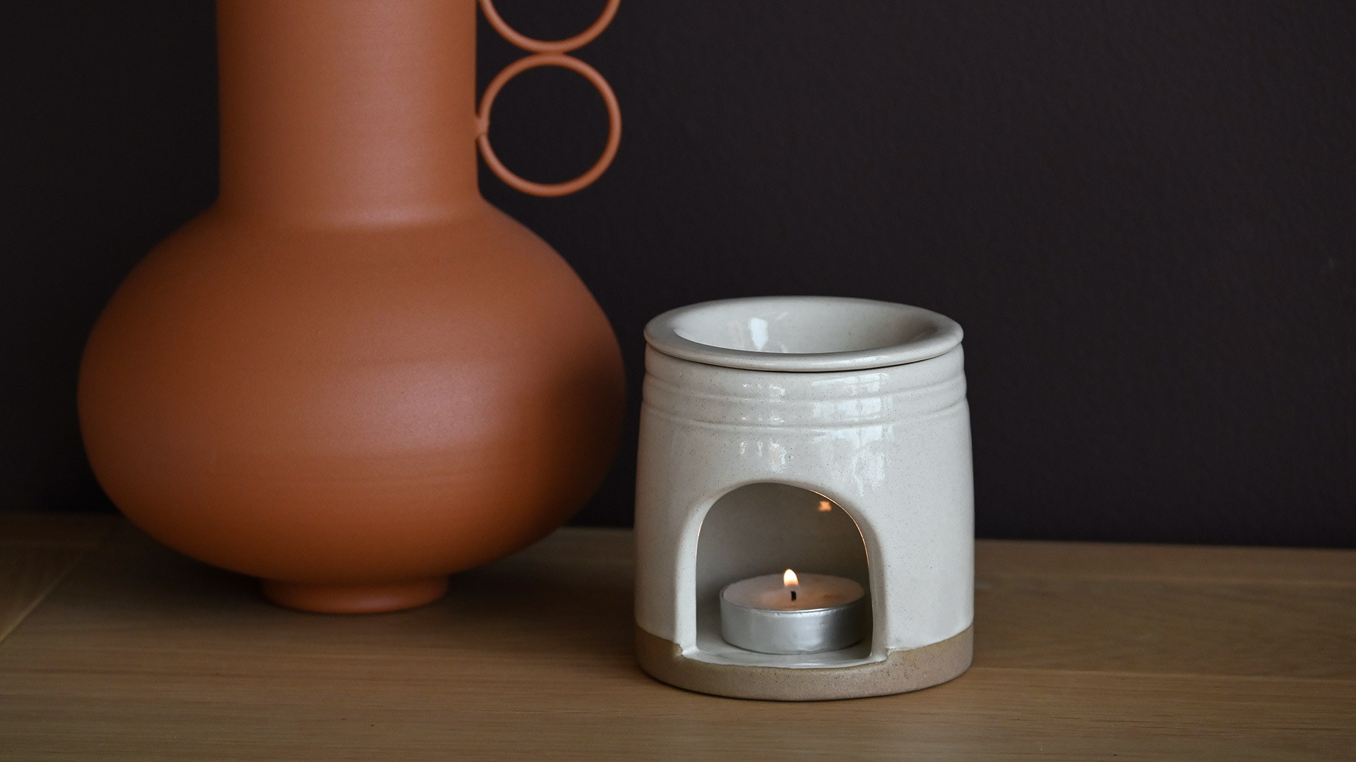 Handcrafted in dark chalky clay with a soft, subtle glaze, this timeless oil burner adds warmth and gentle fragrance to any space.