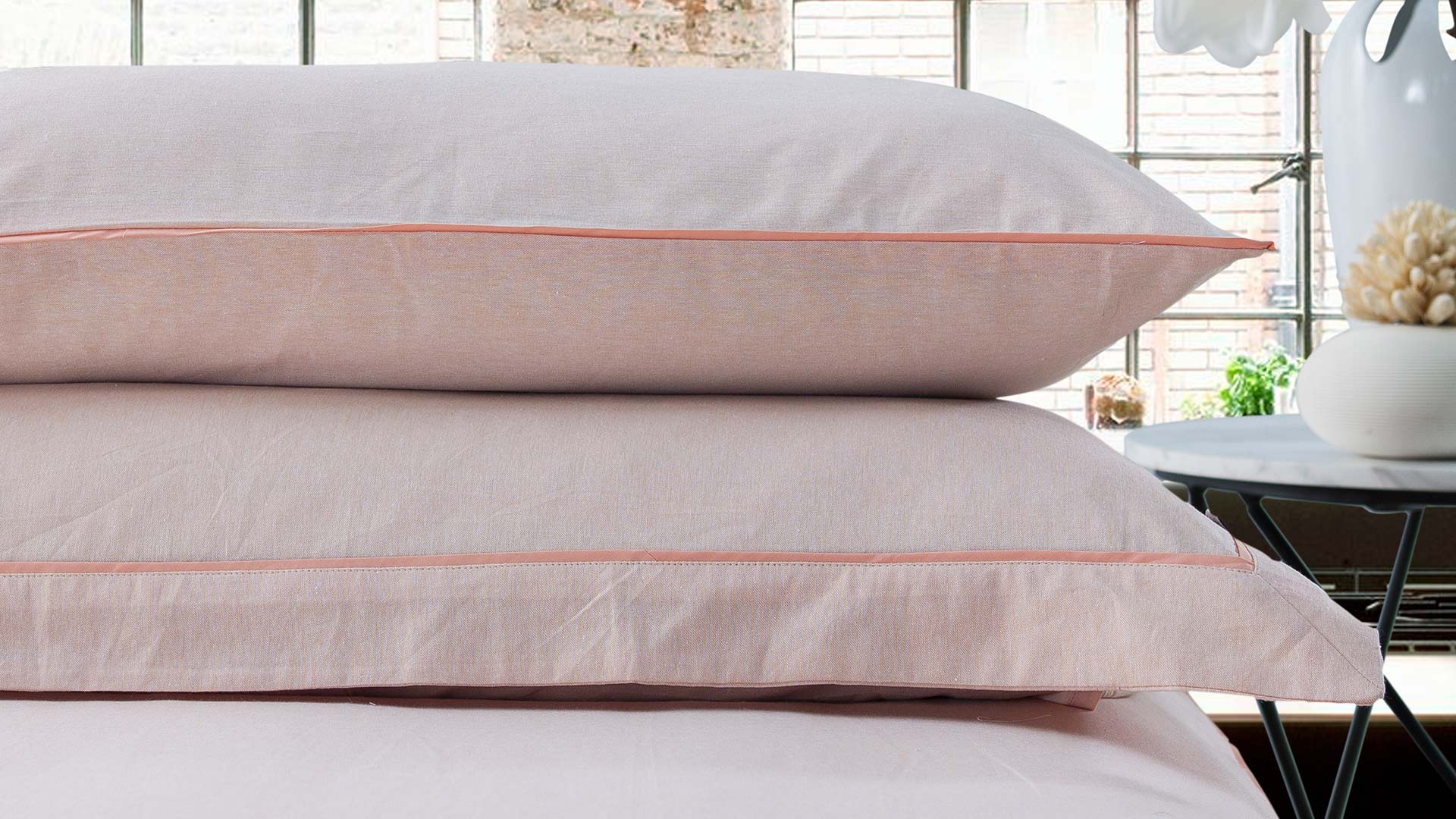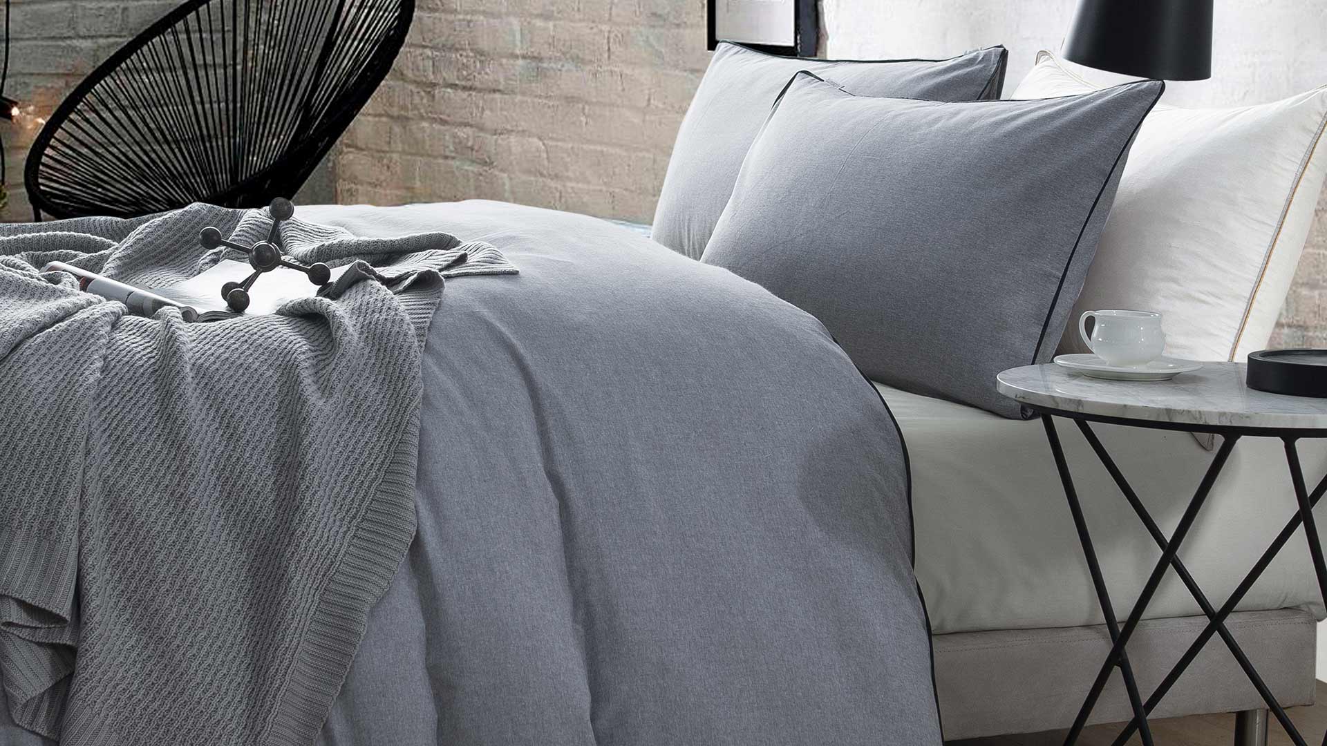 The lifestyle collection of chambray cotton bedding is available in cool grey, pale ecru and soft peach colours.
