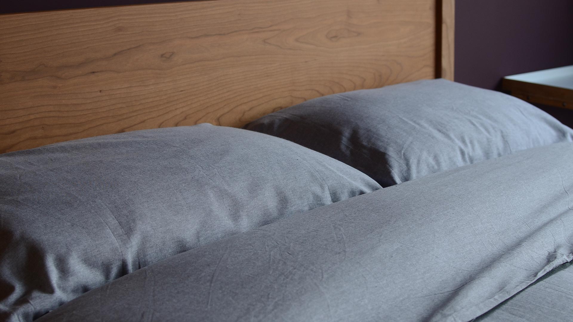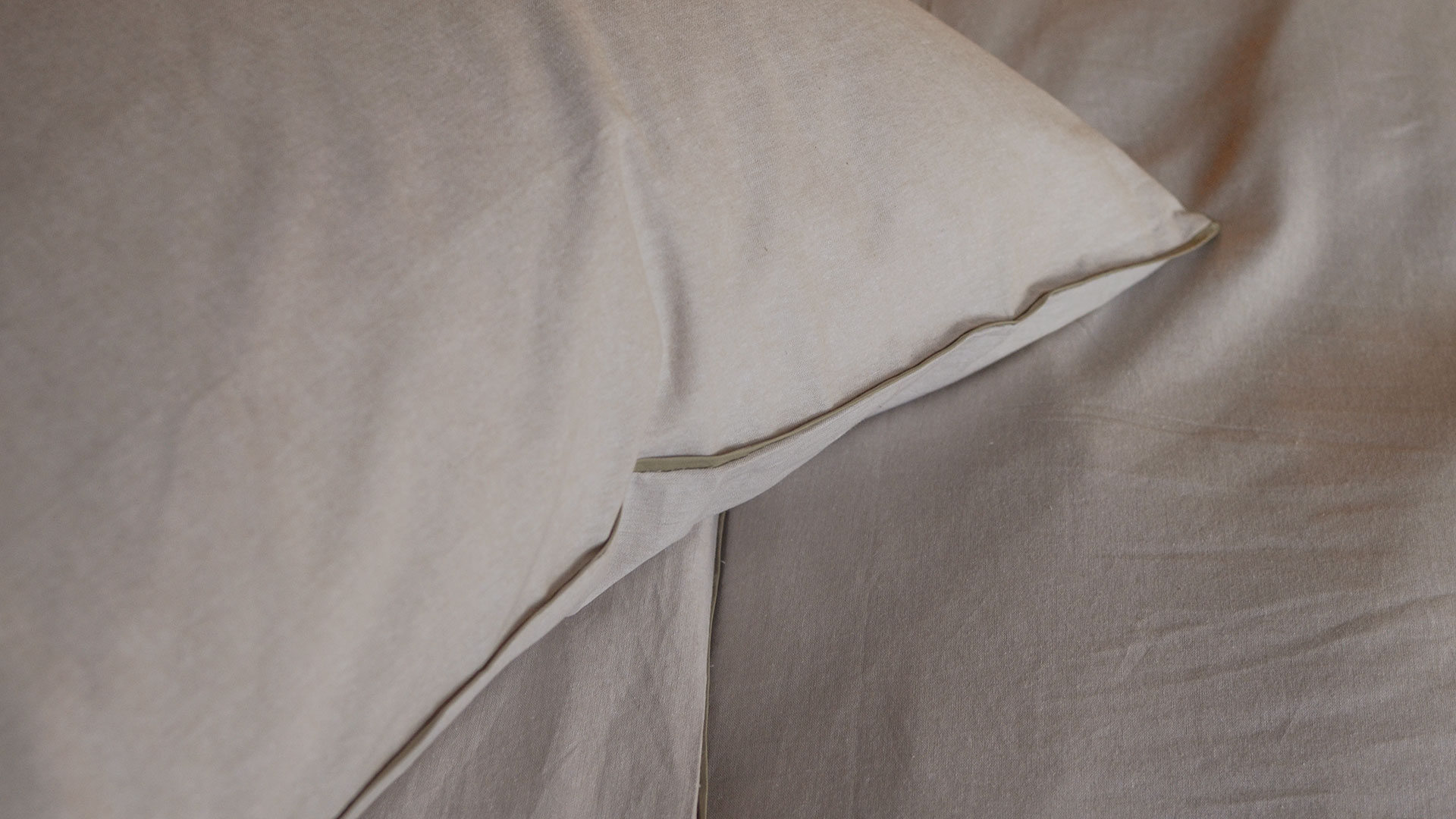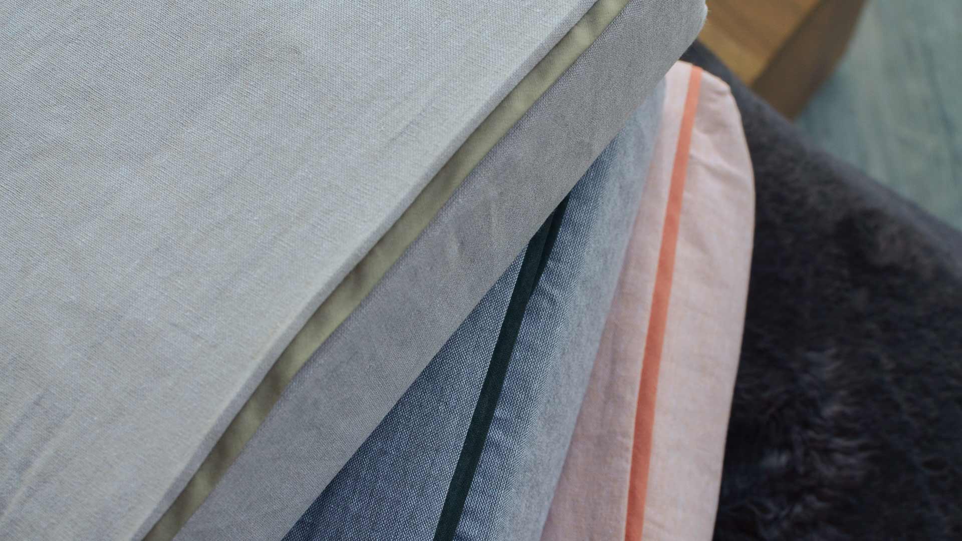 Duvet covers and pillowcase pairs in soft cotton chambray – the duvet covers are available in double and king-size, the pillowcase pairs are house-wife style. Available in mid grey with charcoal piping, pale ecru with deep beige piping, or pale peach-pink with coral piping.
