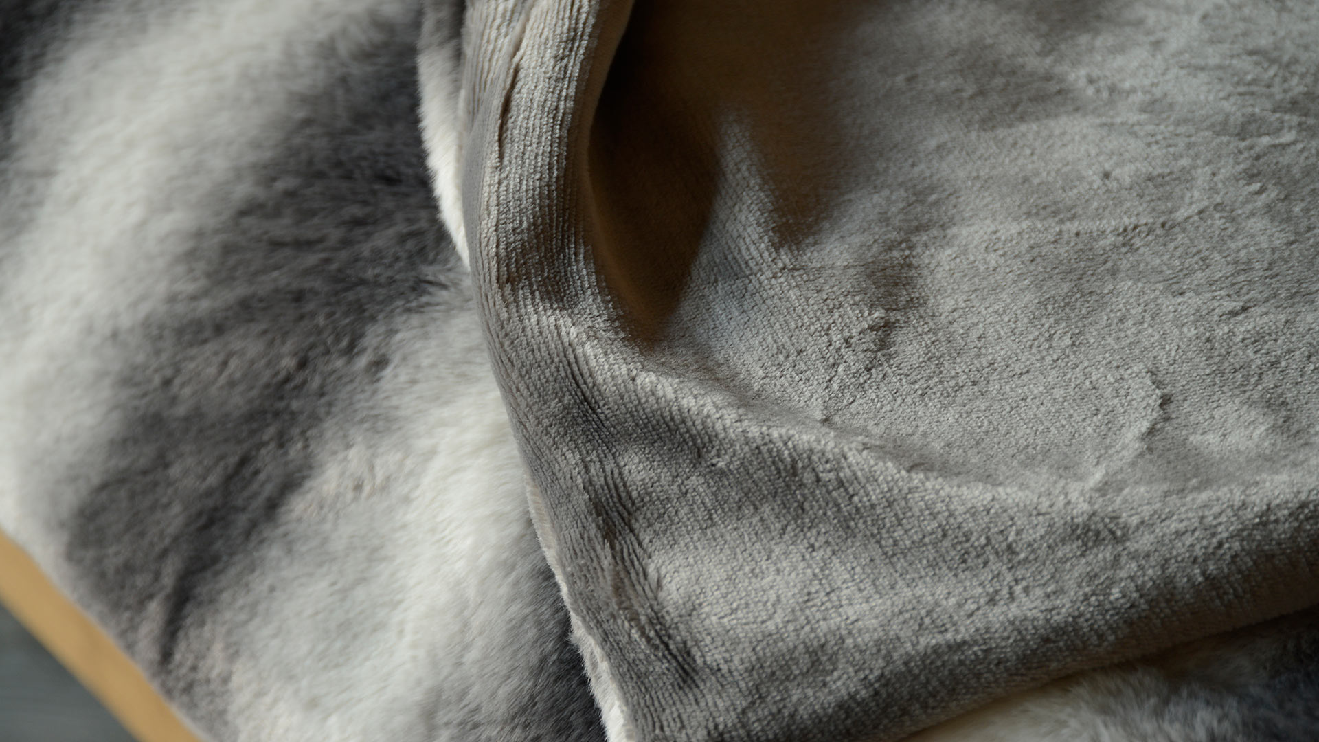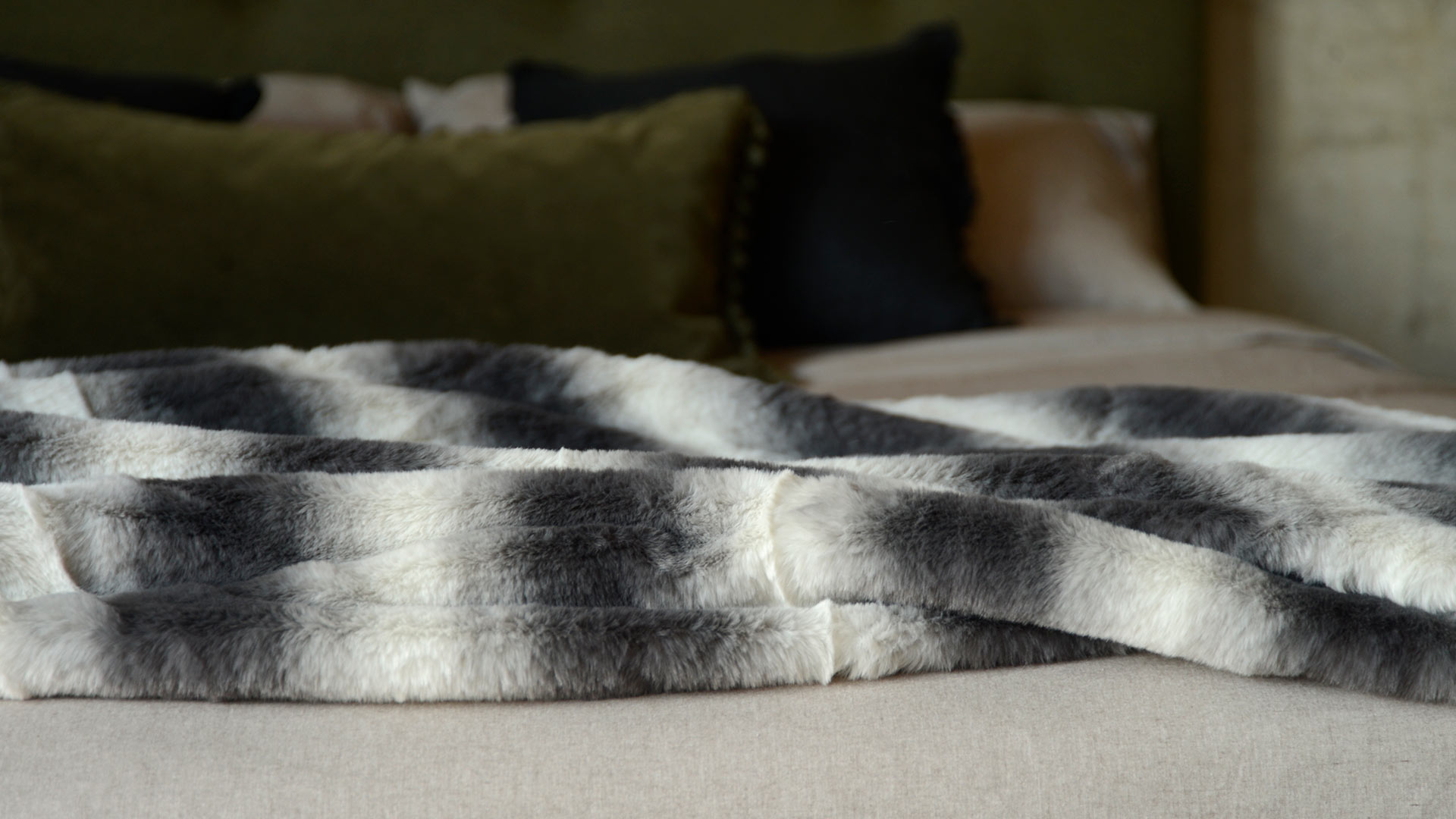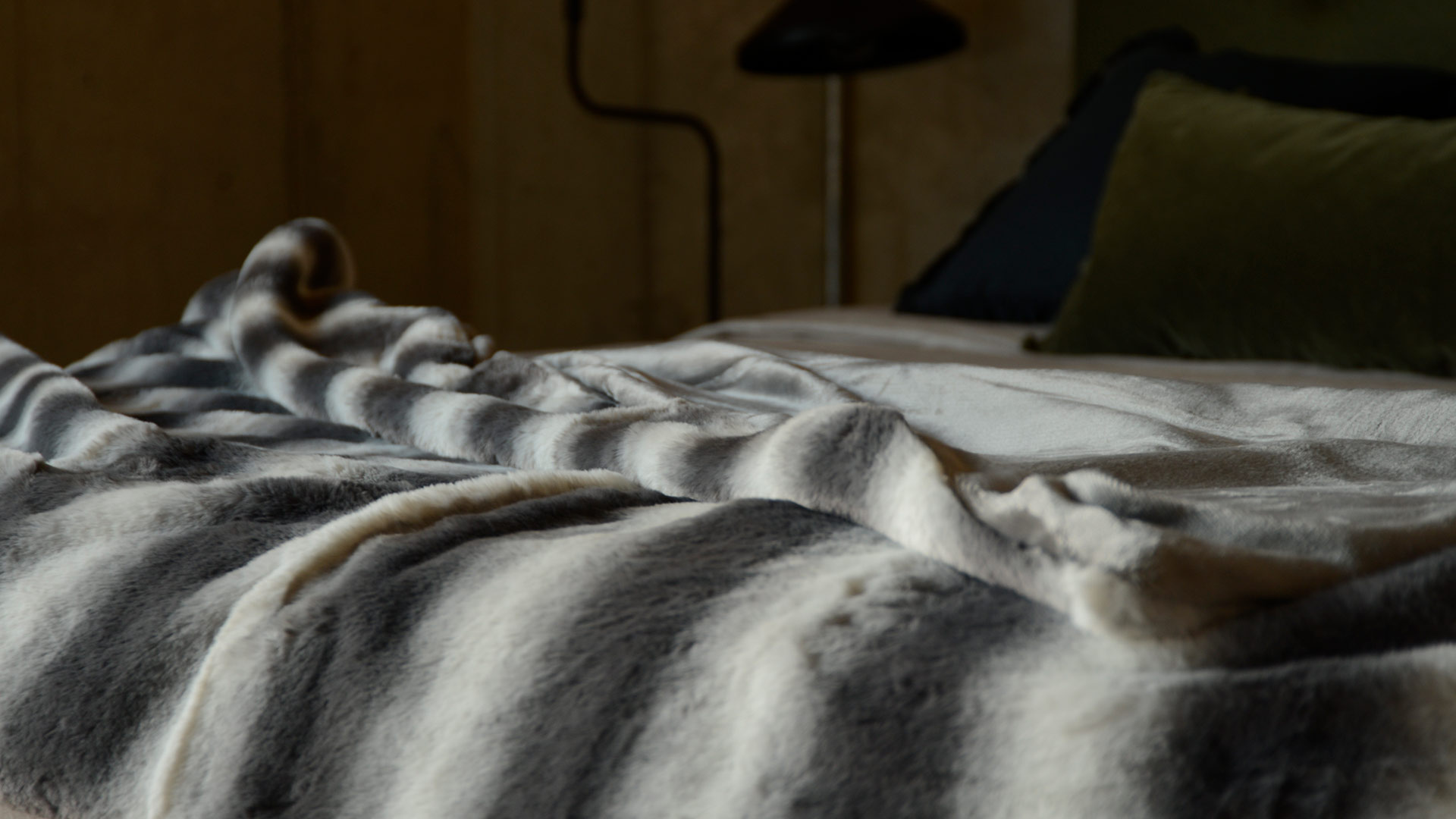 These faux fur throws have a short, but incredibly soft pile. This cosy throw has a soft and smudgy charcoal stripe printed on to the ivory ‘fur’ – inspired by natural fur.