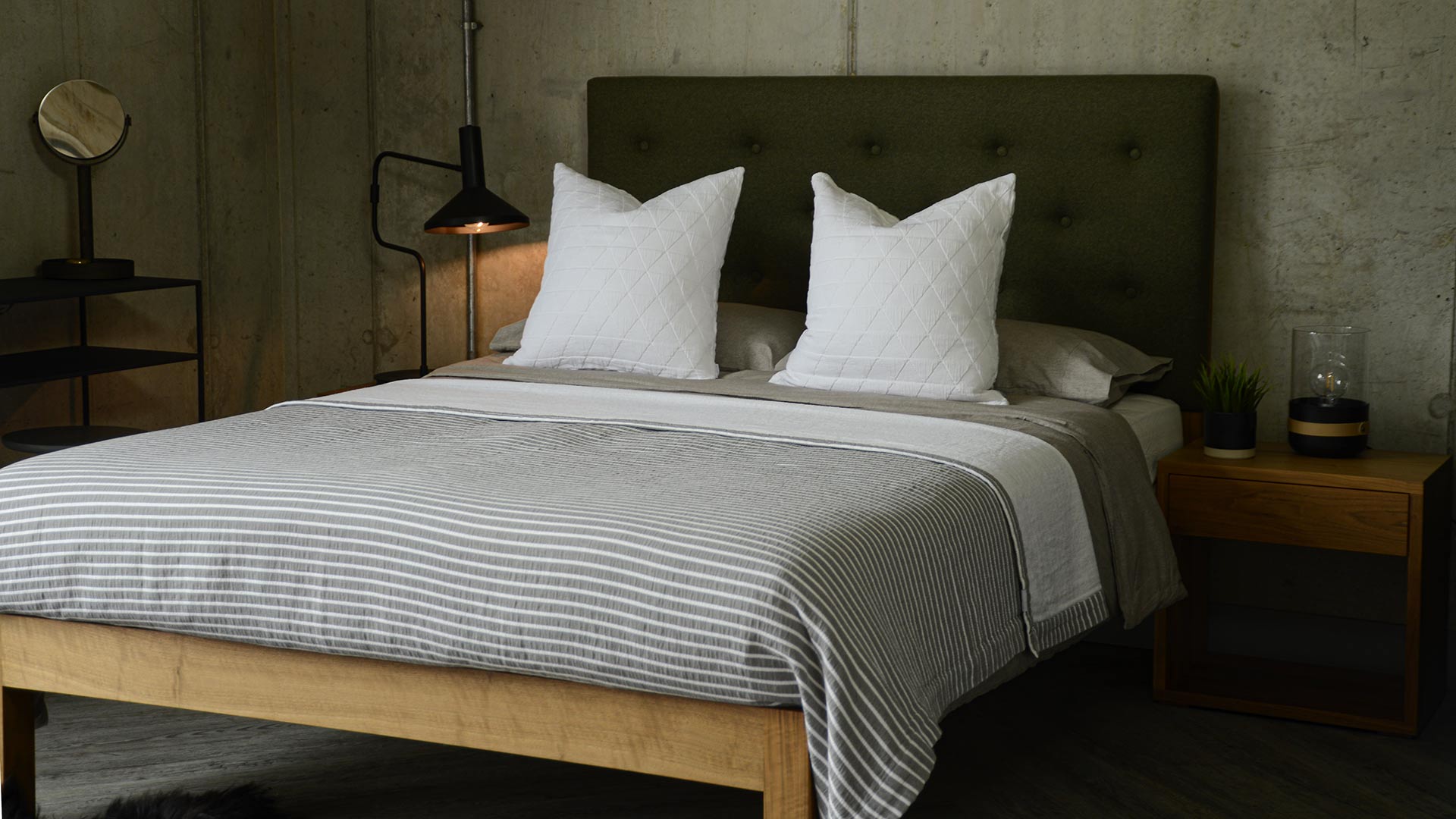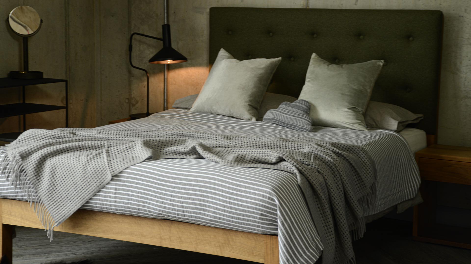 This soft, cotton rich bedspread is a great way to update your bedroom. A modern striped blanket in charcoal with slim ivory stripes. 180x200cm in size – it is large enough to be used over the end of a double or king-size bed. A modern, flexible design that works well with much of our bedding collection – including our white ruffle edge duvet covers.