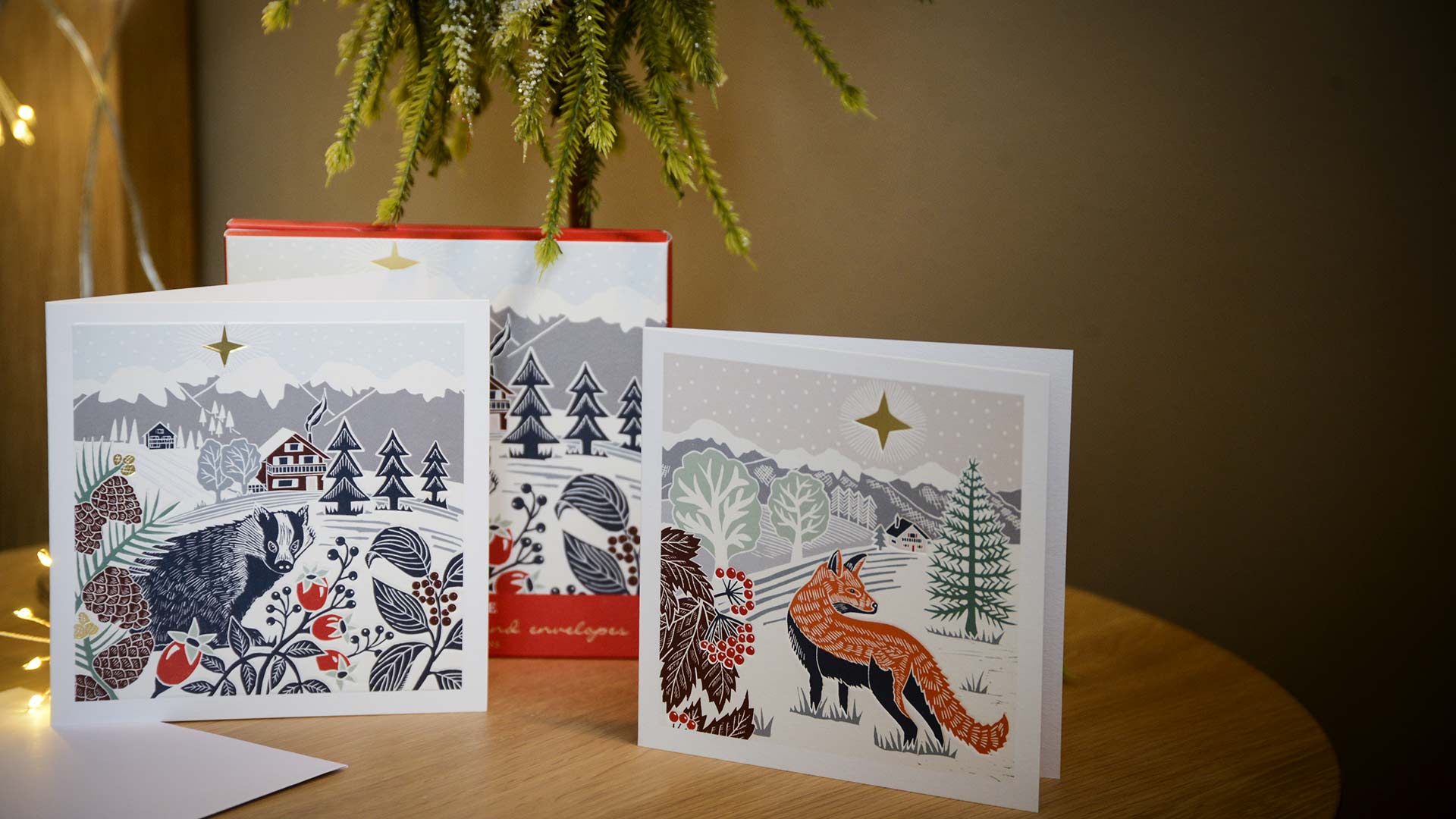 Fox & Badger: A set of 10 cards in 2 designs (5 of each design): A wintery scene featuring a fox, Christmas tree and a gold foil star in the sky. A wintery scene featuring a badger, Christmas trees, snow topped mountains and a gold foil star in the sky.