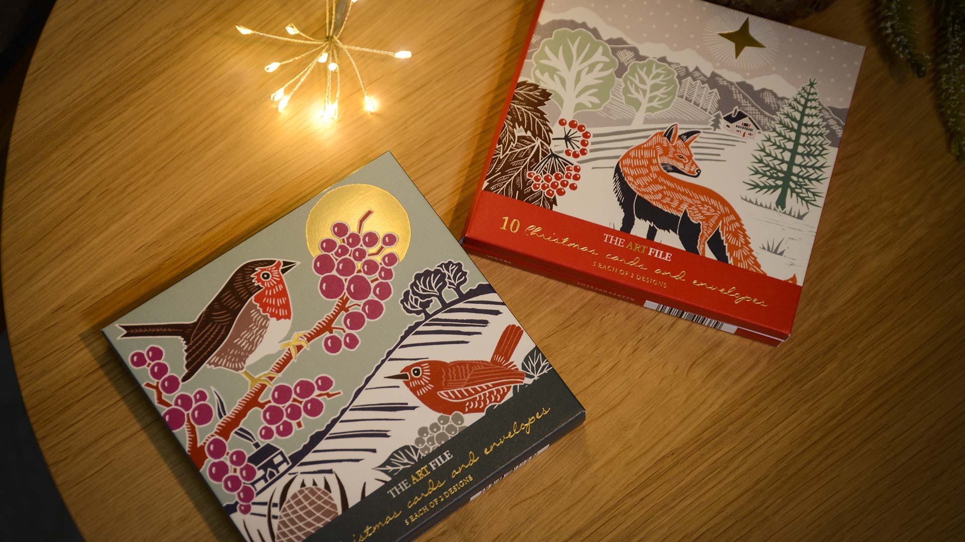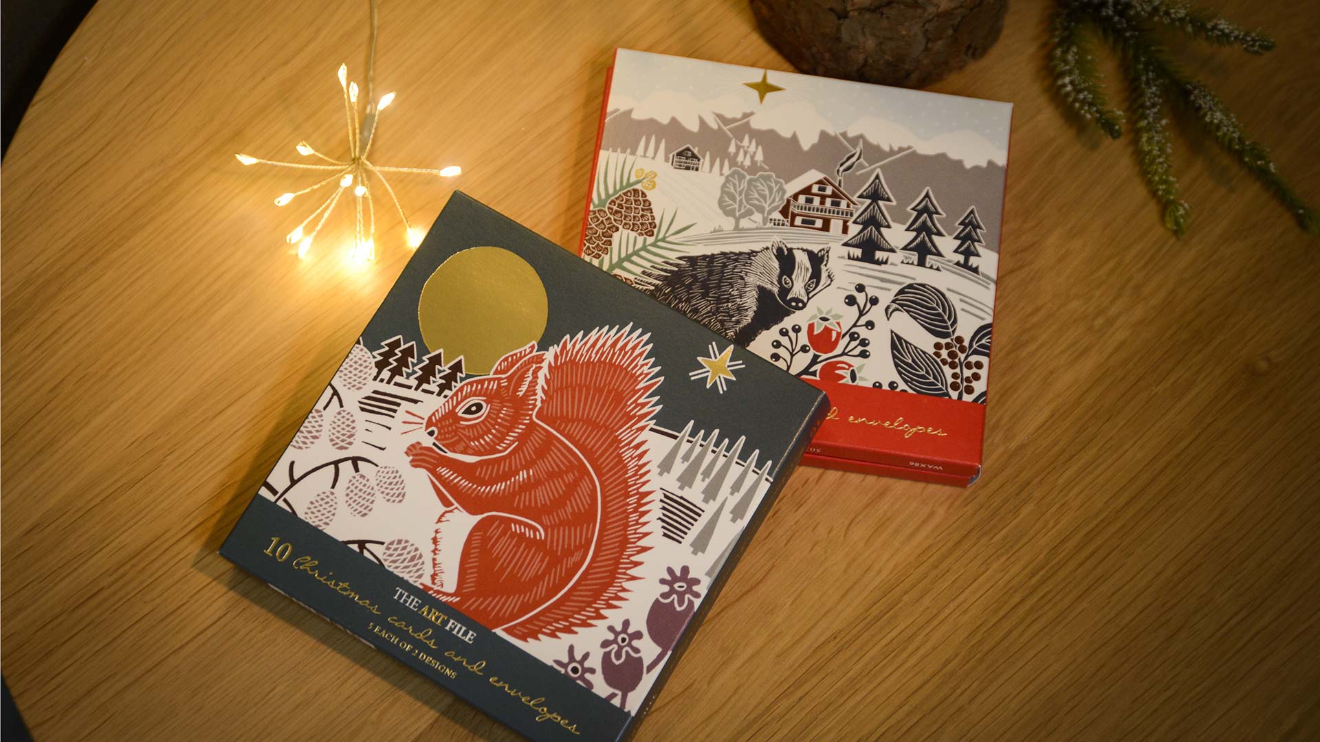 Sets of contemporary Christmas cards. Multipack sets of 10 cards, each containing 2 designs (5 cards per design). Chooses from the Fox & Badger pack or the Robin & Squirrel pack. All feature wintery scenes with gold foil details.