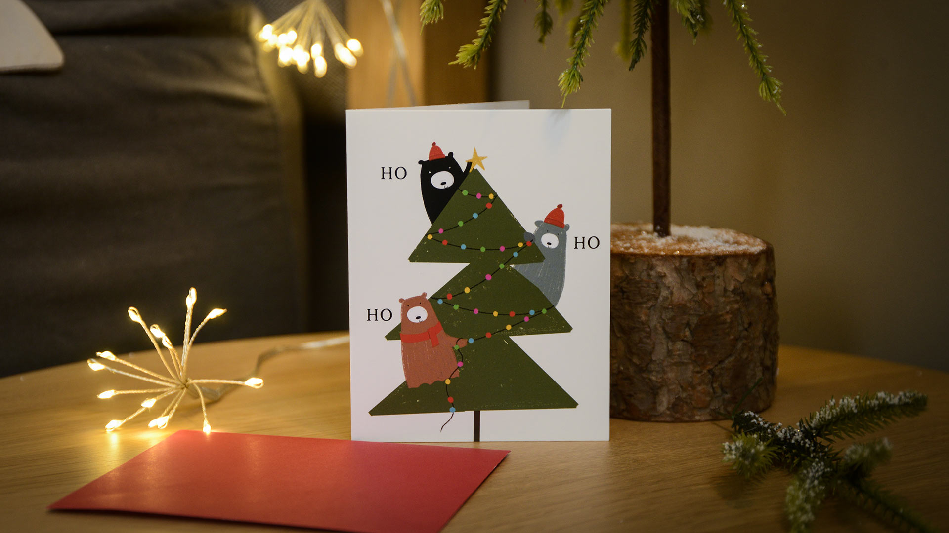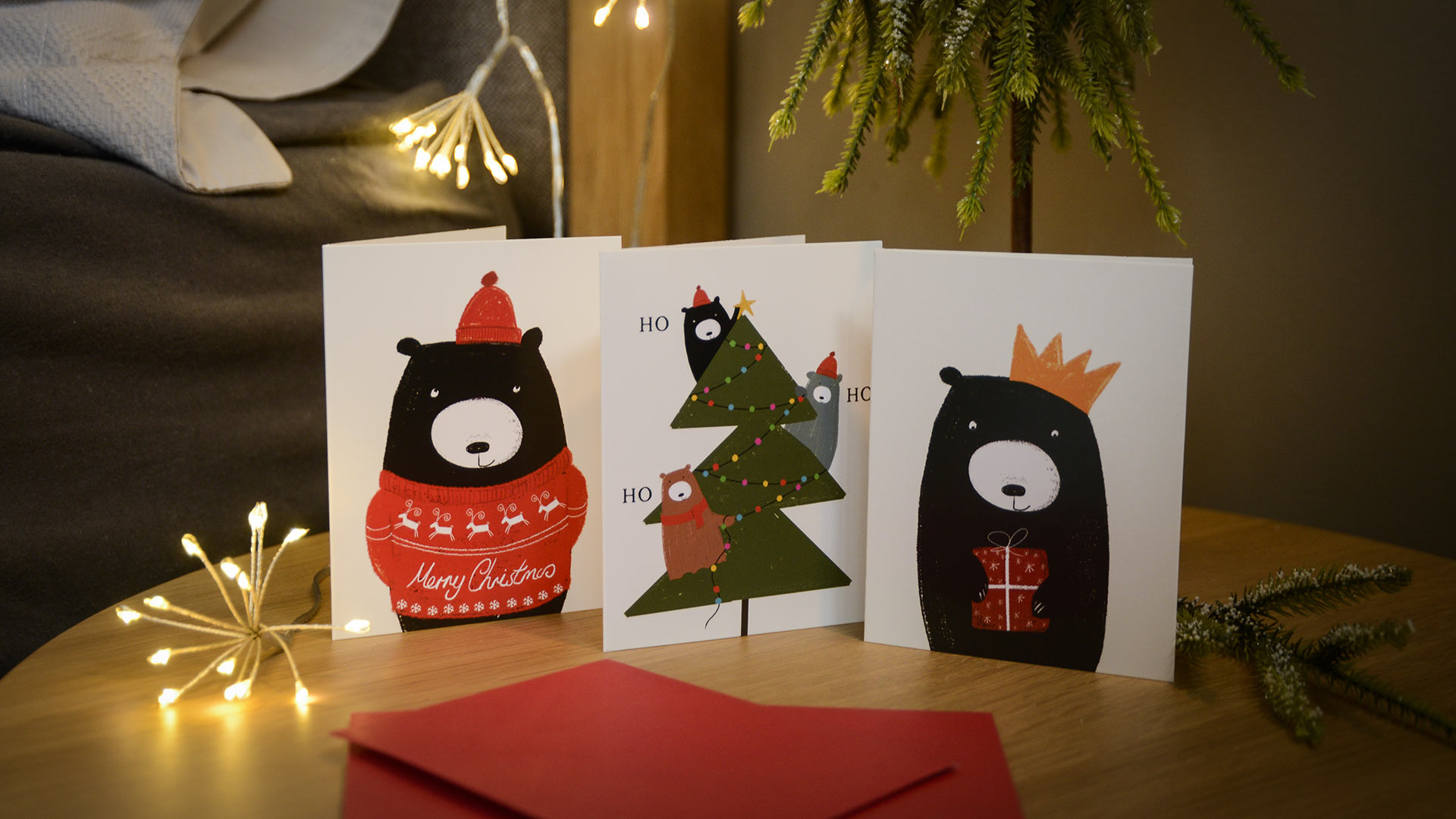 Designs: 1. Single festive bear with a gift and wearing a paper crown. 2. Three bears decorating a Christmas tree. 3. A cosy bear wearing a Christmas jumper and hat.