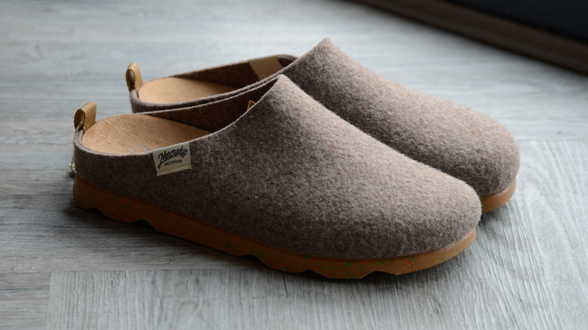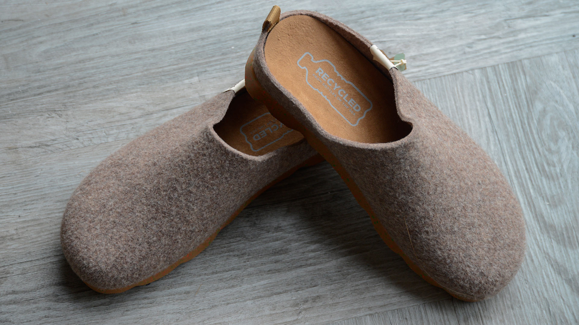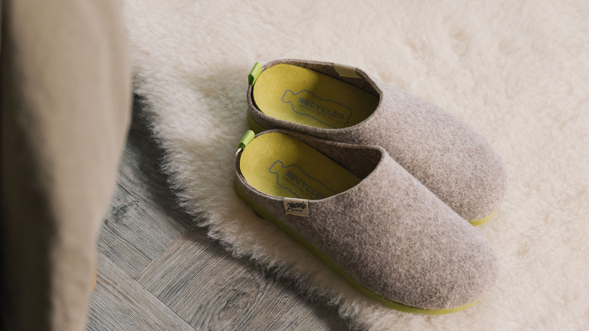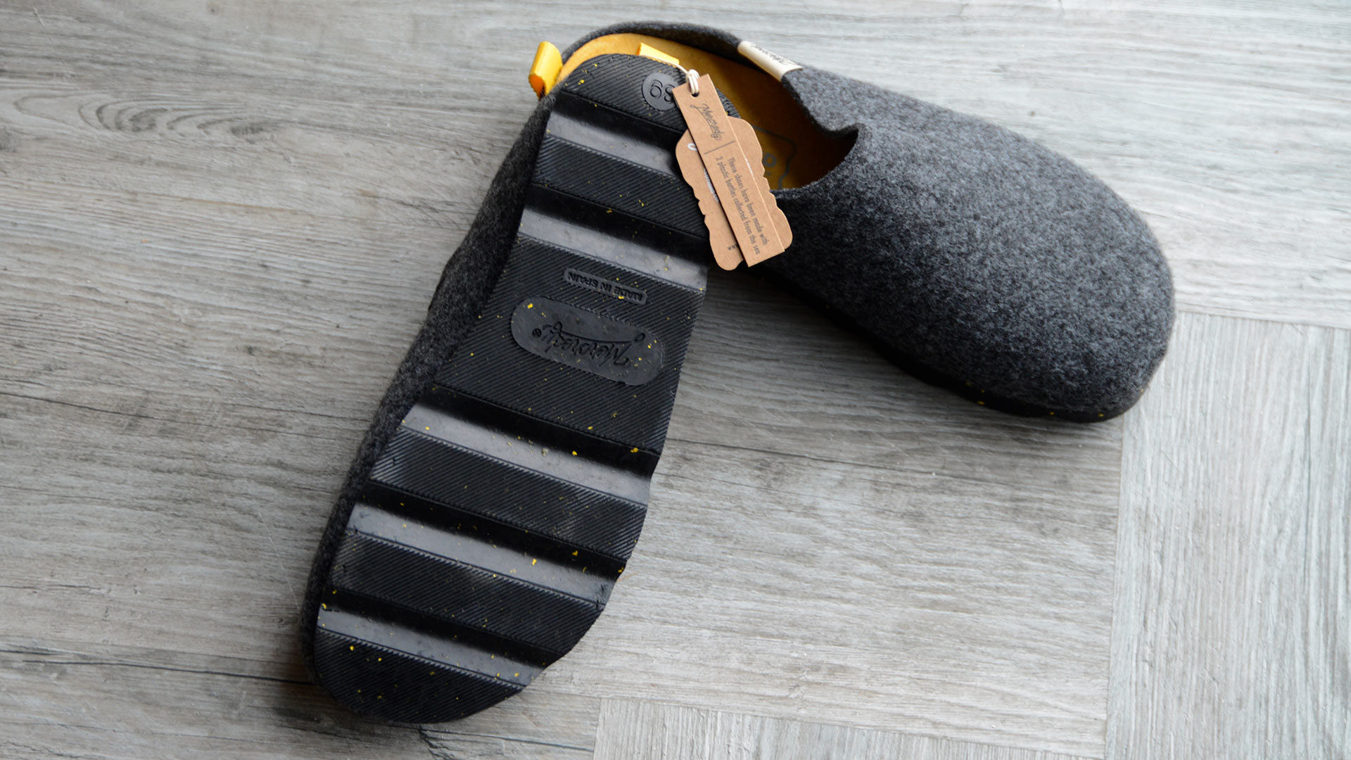 Sustainable slippers – comfy, eco-friendly and in a range of subtle and bold colours. A recycled plastic upper that feels like soft felt, with a natural rubber sole.