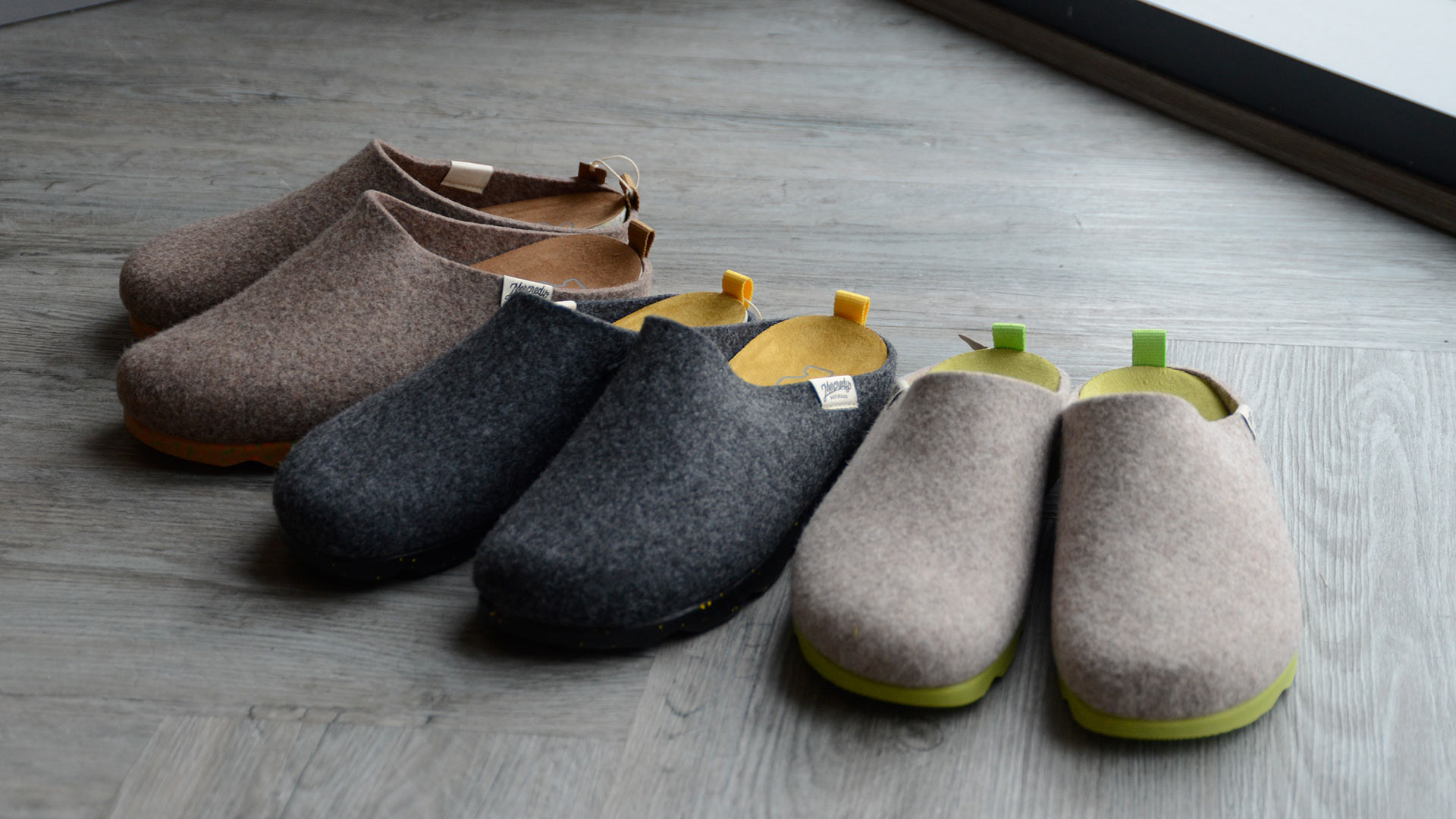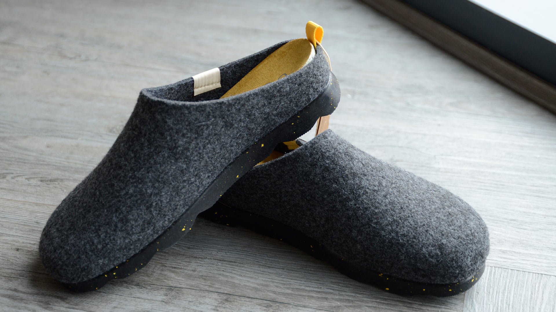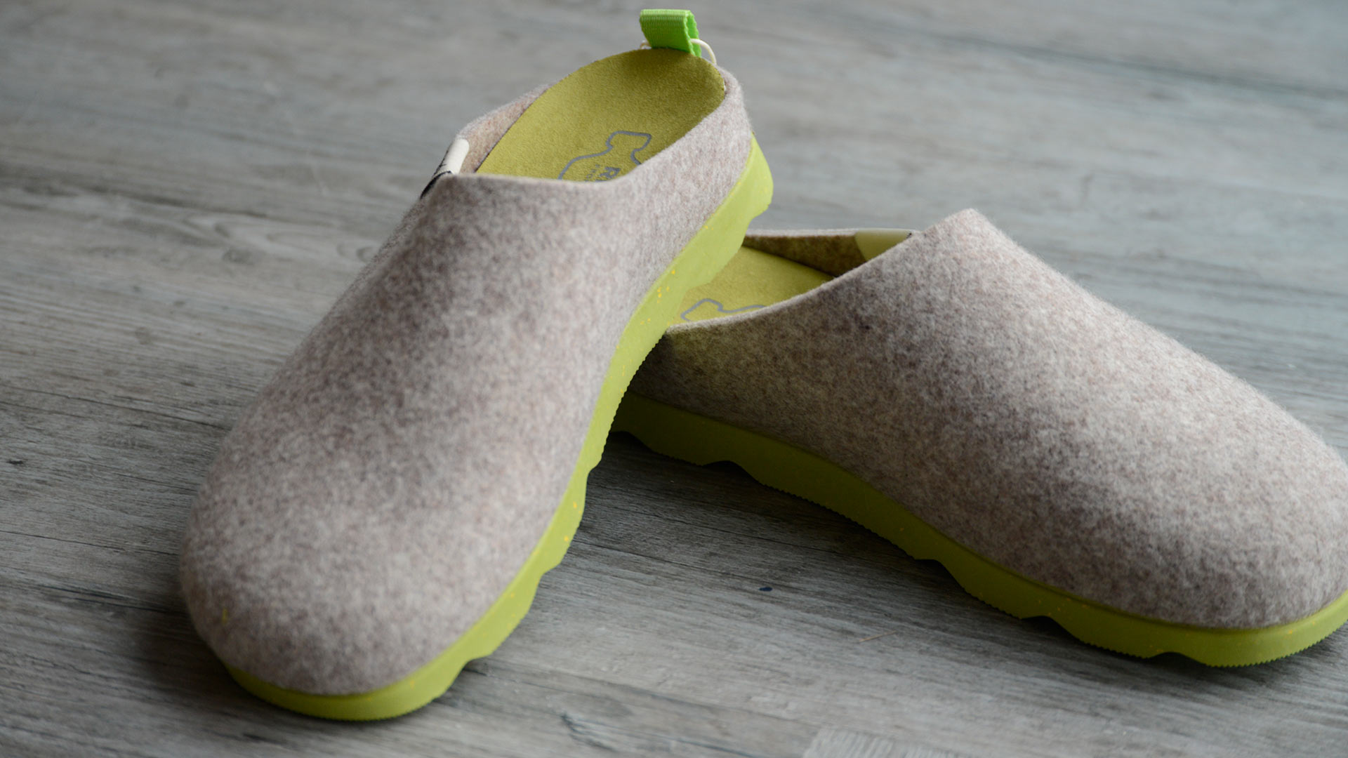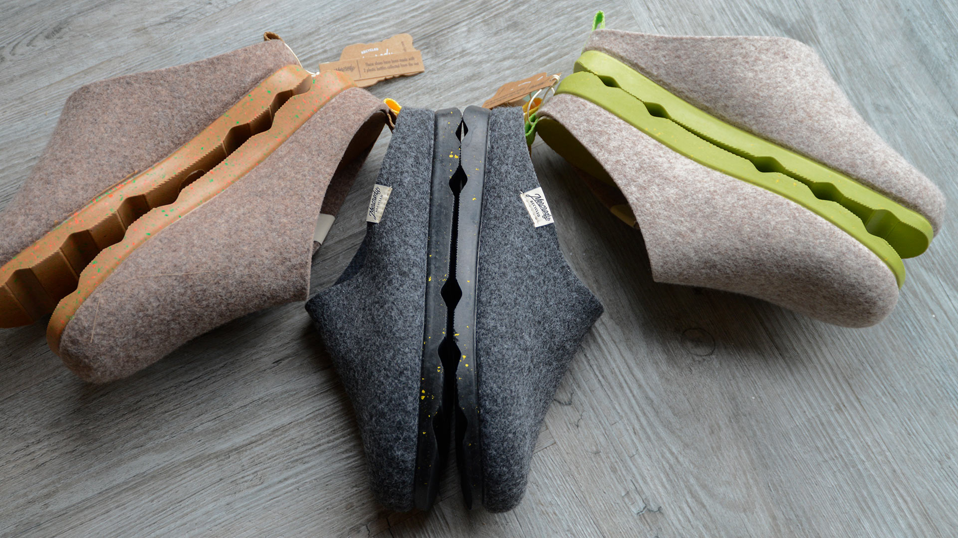 Sustainable slippers – comfy, eco-friendly and in a range of subtle and bold colours. A recycled plastic upper that feels like soft felt, with a natural rubber sole.