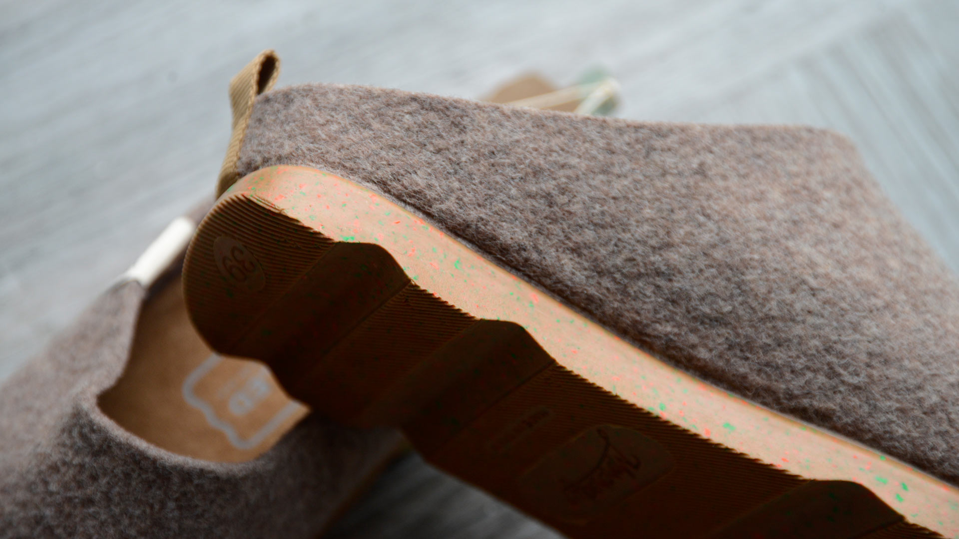 These sustainable slippers are available in the following colours: Brown: A brown felted top and a brown sole with colourful orange and green speckles Beige: A beige felted top and lime green sole with yellow speckles Charcoal: A charcoal felted top with a black sole and yellow speckles