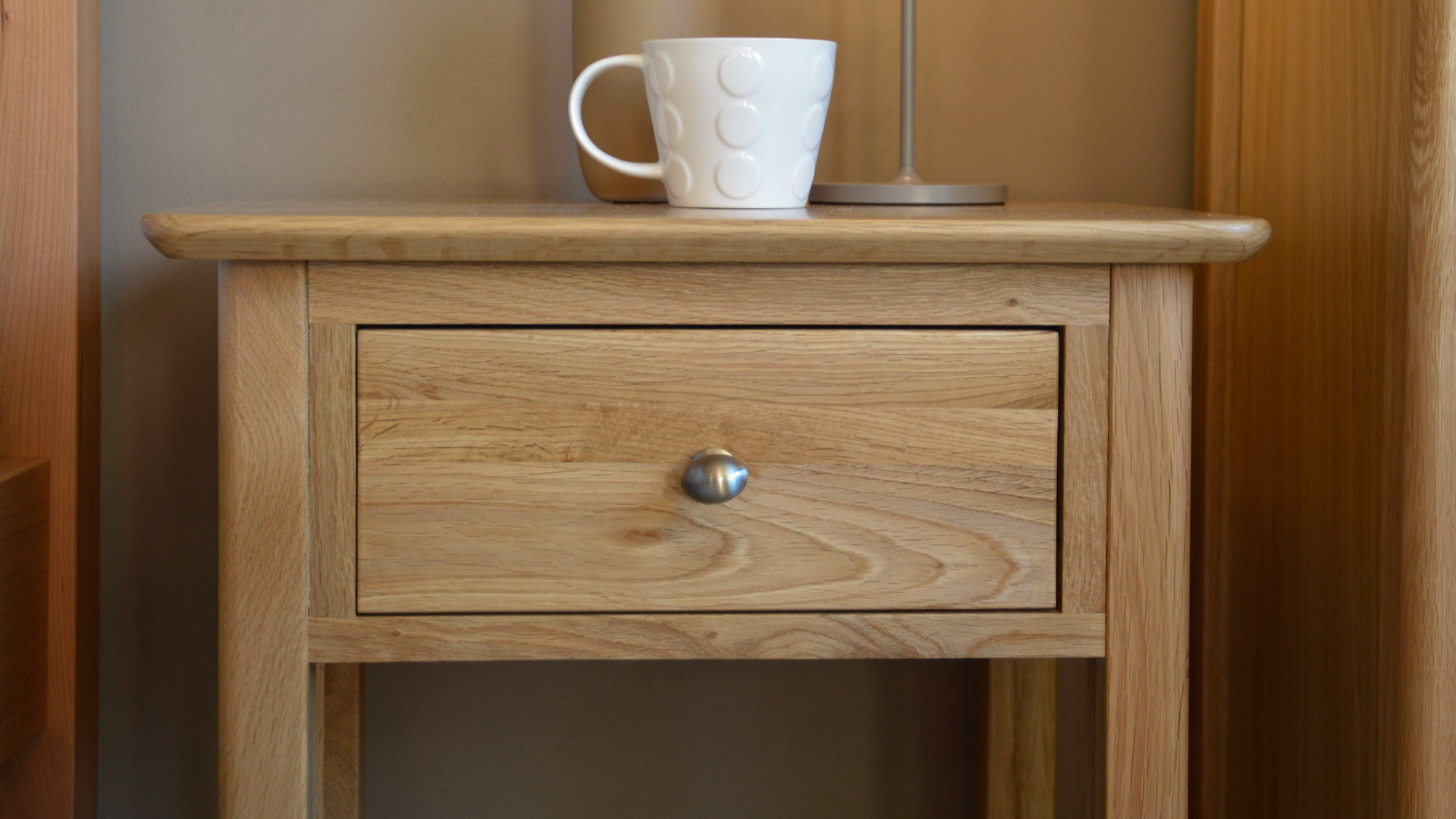 A classic, traditional oak design, with a modern twist. This one-drawer bedside table is part of a larger range of bedroom furniture, all available through our website. You can also find a matching chest of drawers just here.
