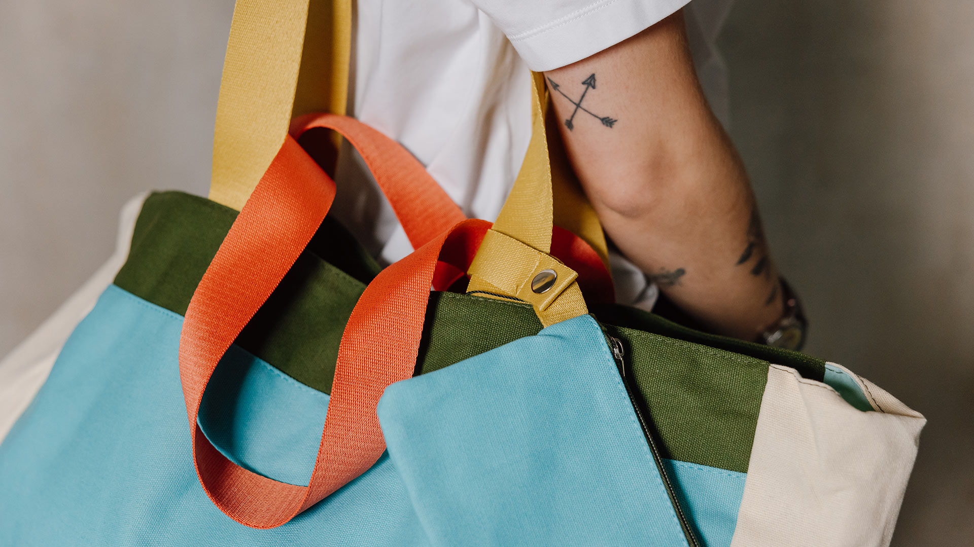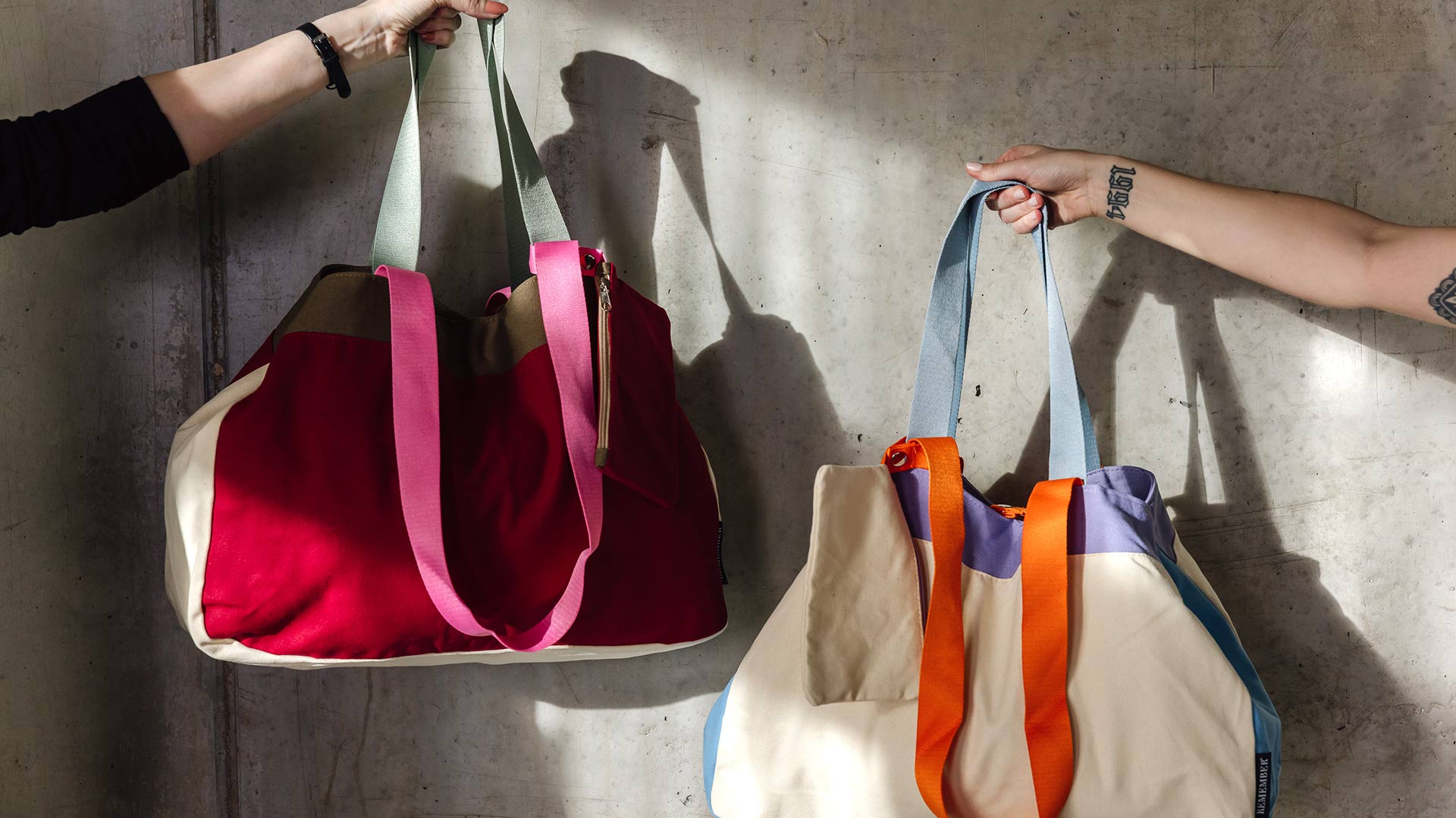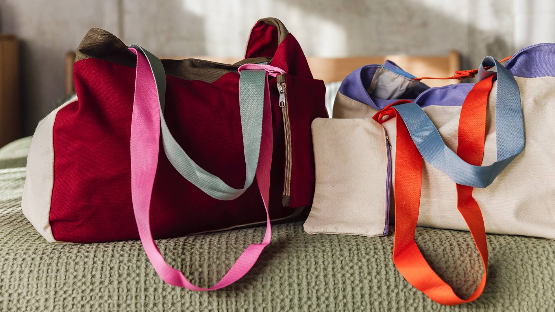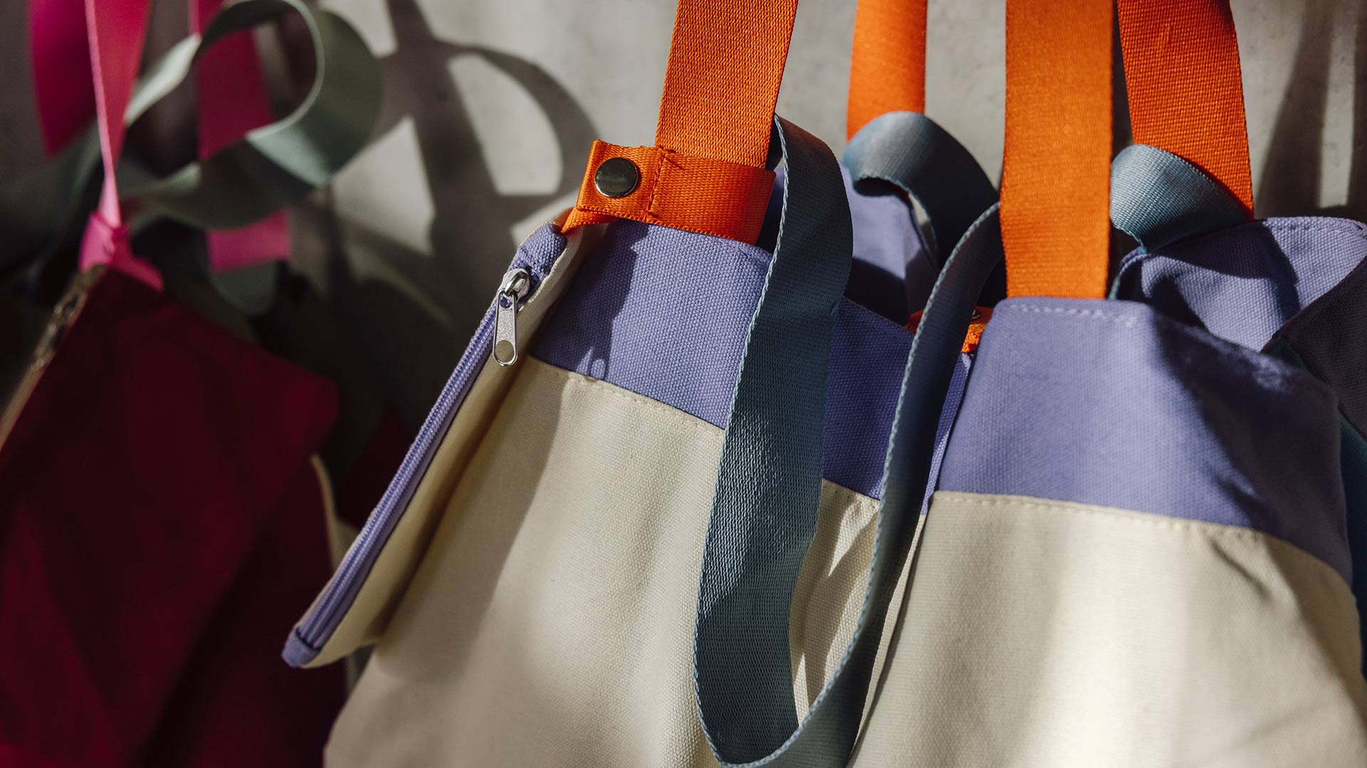 Plum – a lush purple makes up the majority of the bag, featuring contrasting sections of light beige and khaki. The longer straps are a bright pink, and the shorter are a muted grey-blue. The pouch is the same plum shade with a khaki zip. Beige – a light beige makes up the majority of the bag, featuring sections of contrasting lavender and baby blue. The longer straps are bright orange, and the shorter are a light, muted blue shade. The pouch is the same light beige, with a lavender zip. Blue – a light, bright blue makes up the majority of the bag, featuring sections of contrasting light beige and deep olive green. The longer straps are light yellow, and the shorter are orange. The pouch is the same bight blue, with a deep olive green zip.