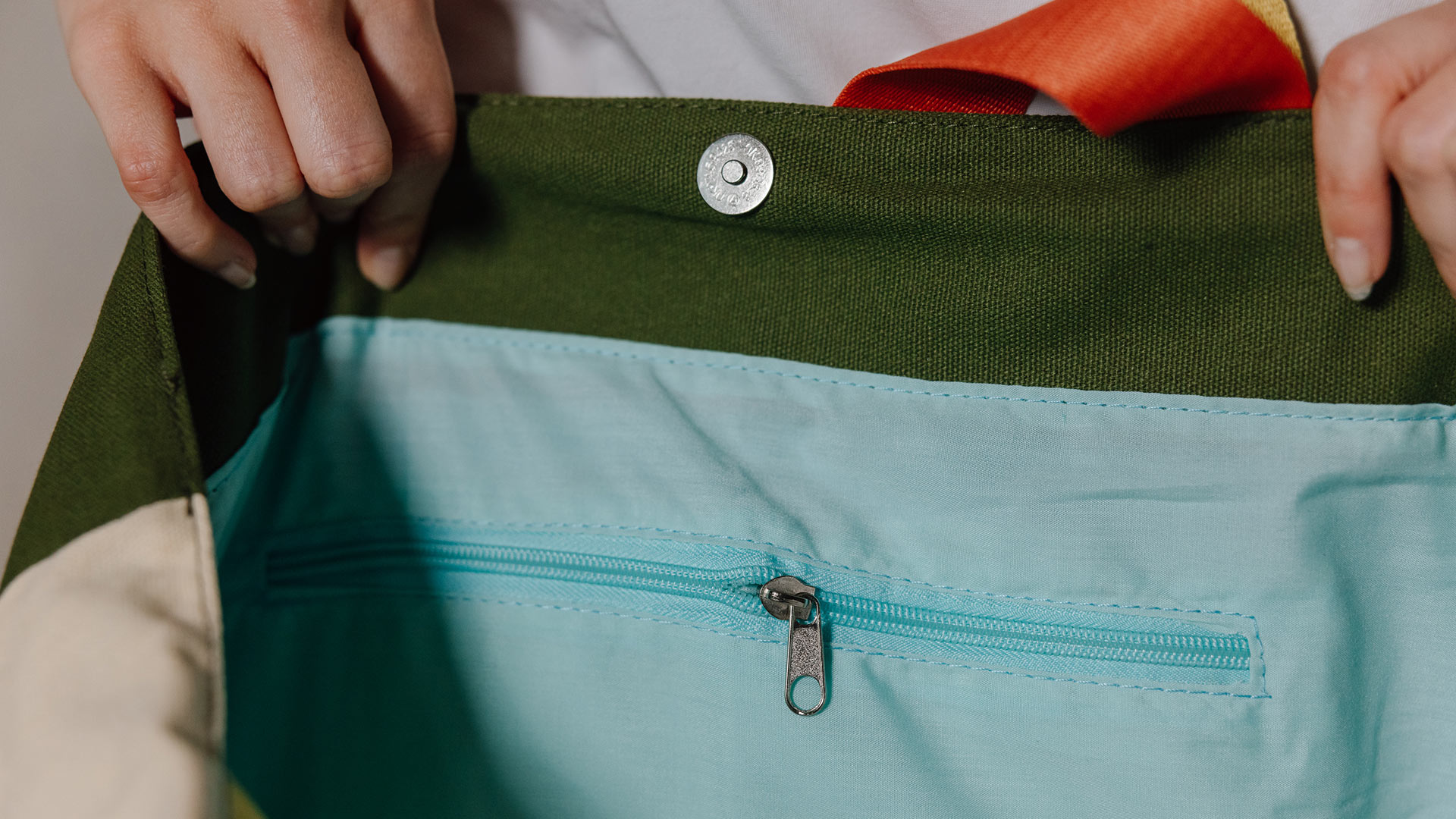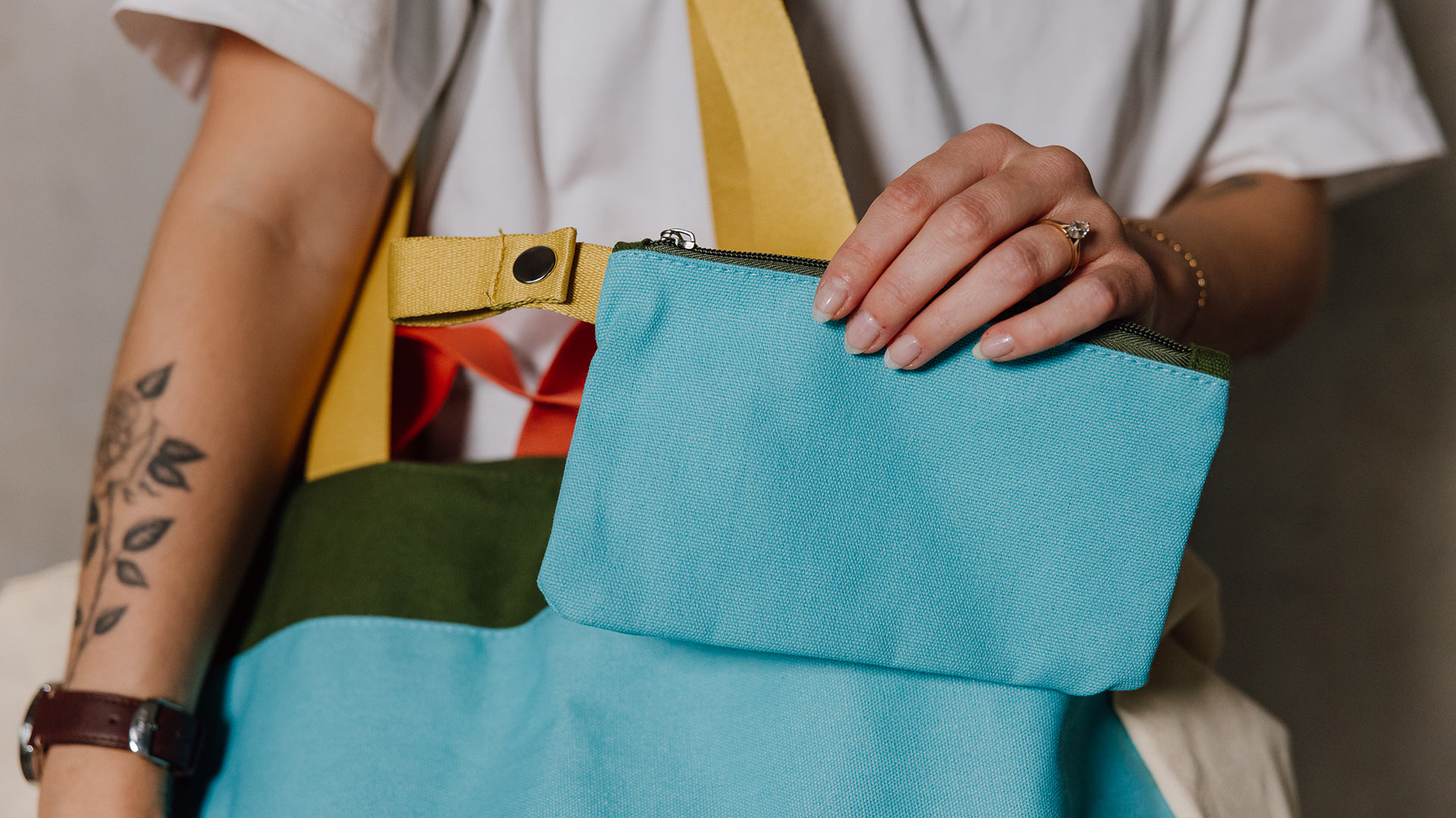 Material: outer material & lining: 100 % cotton, pouch: 100 % cotton, strap: 100 % polyester.