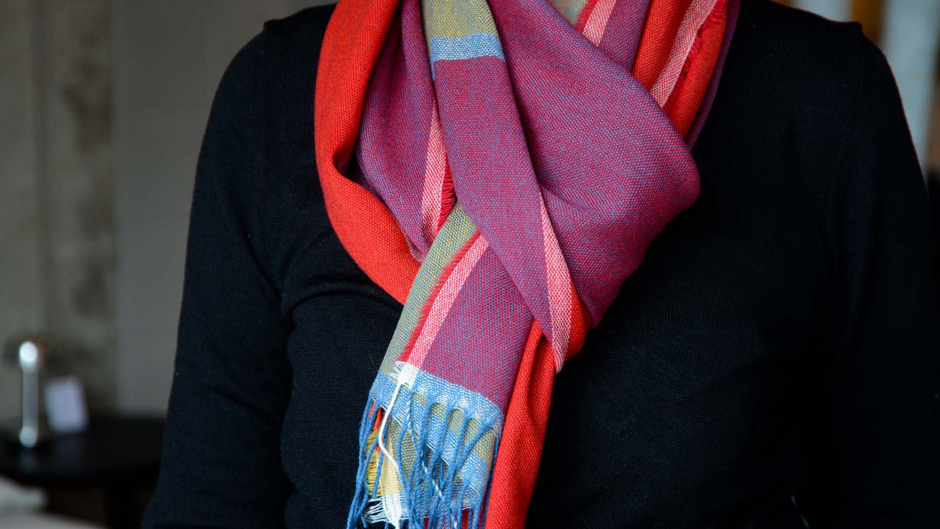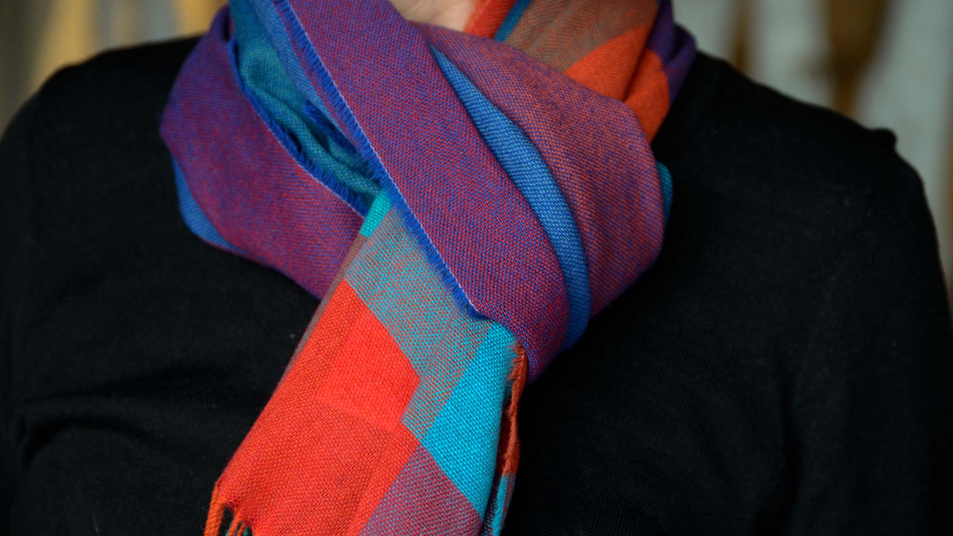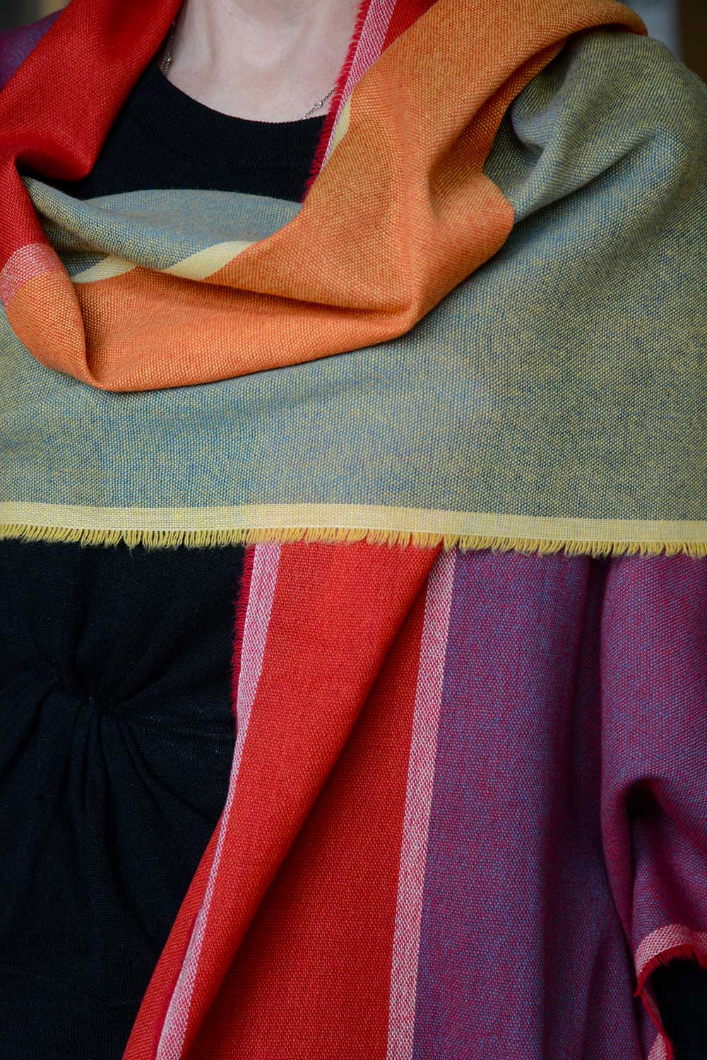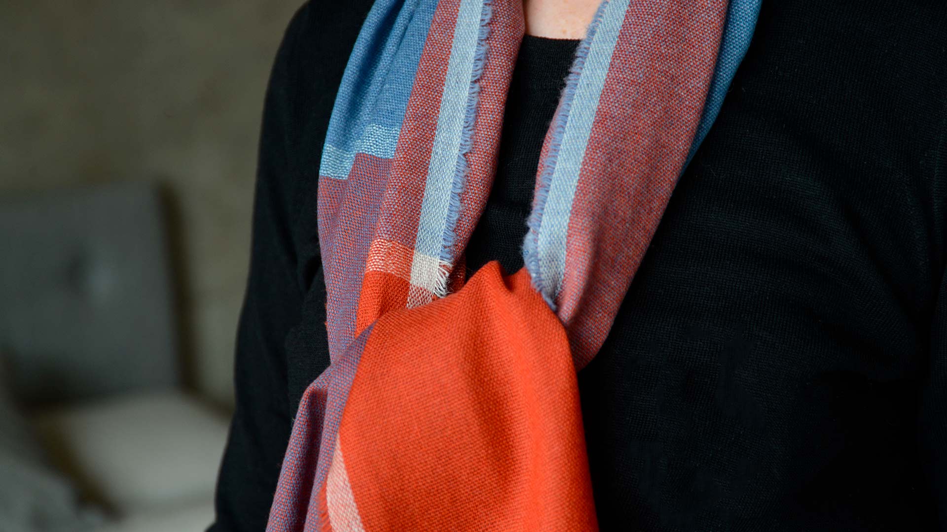Dawn: A combination of bold and muted shades of denim blue and washed red, with stripes of white throughout Dusk: An autumn inspired scarf, with blocks of orange, olive green, purple and red, striped with paler tones Twilight: Jewel tones galore, this scarf boasts blocks of deep burgundy, blue and red, with highlights of bright orange