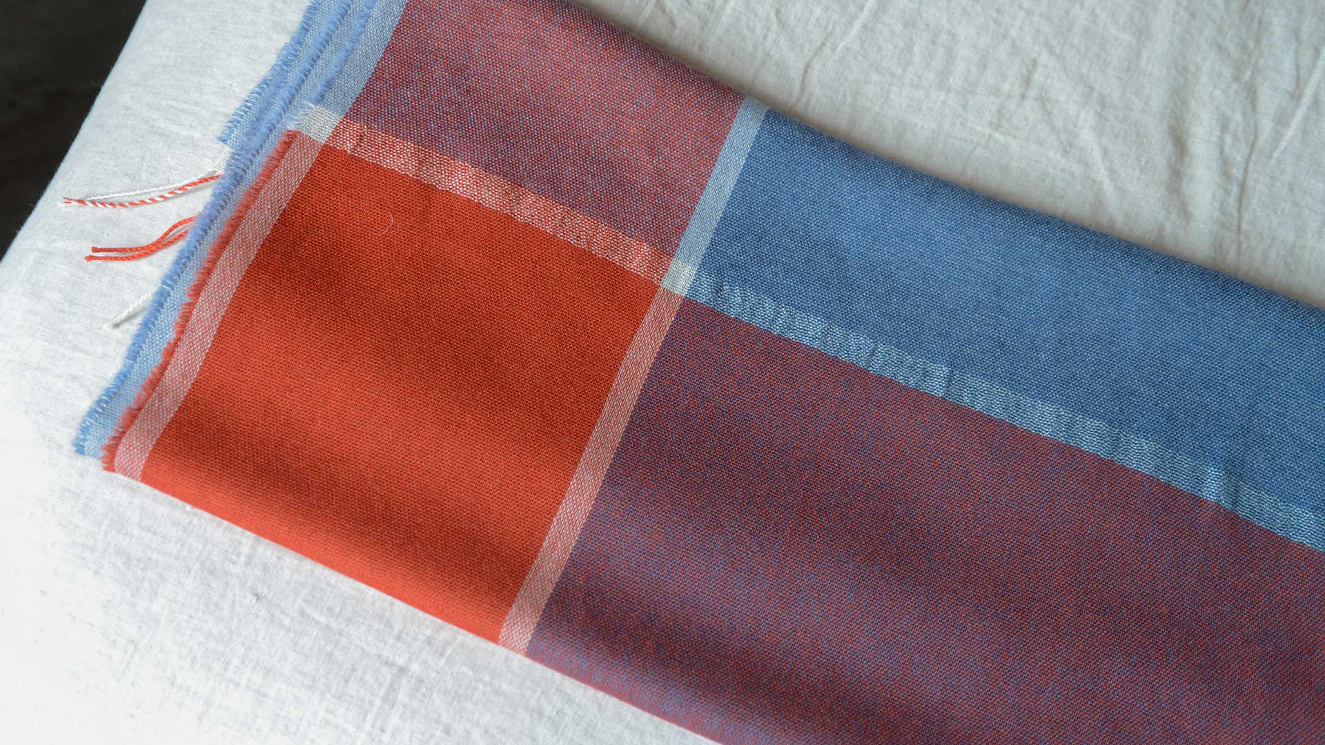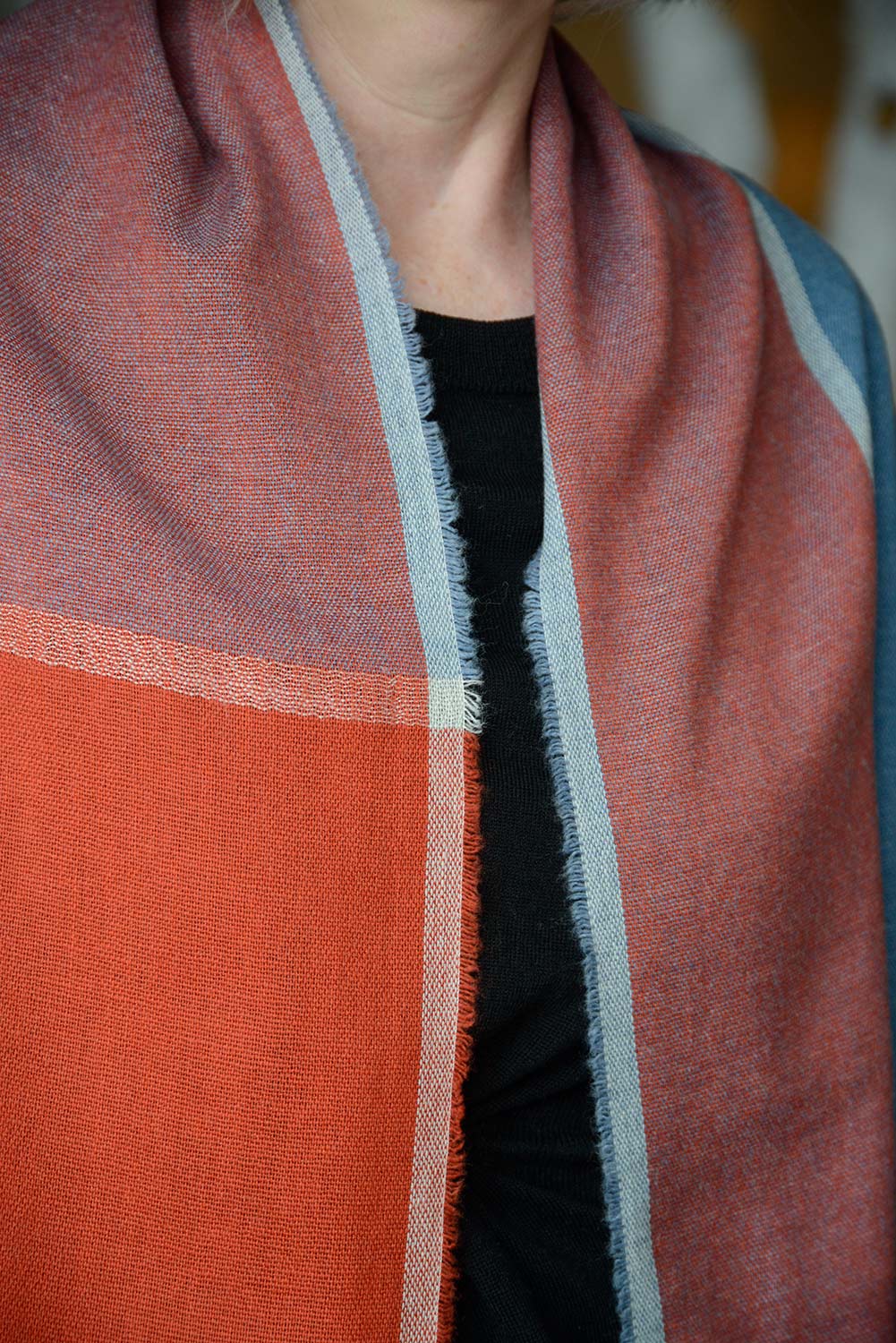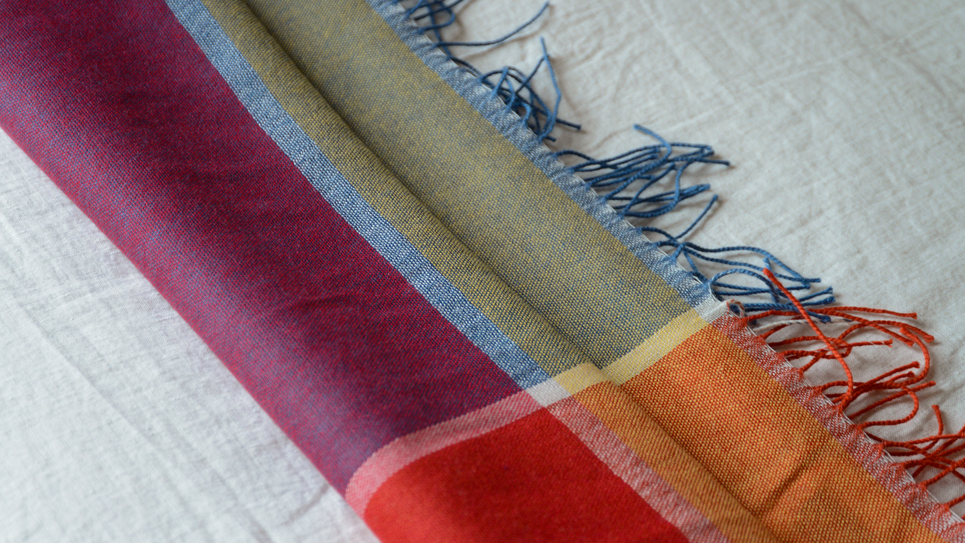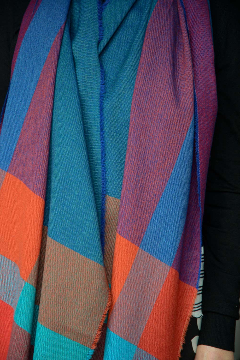 Dawn: A combination of bold and muted shades of denim blue and washed red, with stripes of white throughout Dusk: An autumn inspired scarf, with blocks of orange, olive green, purple and red, striped with paler tones Twilight: Jewel tones galore, this scarf boasts blocks of deep burgundy, blue and red, with highlights of bright orange