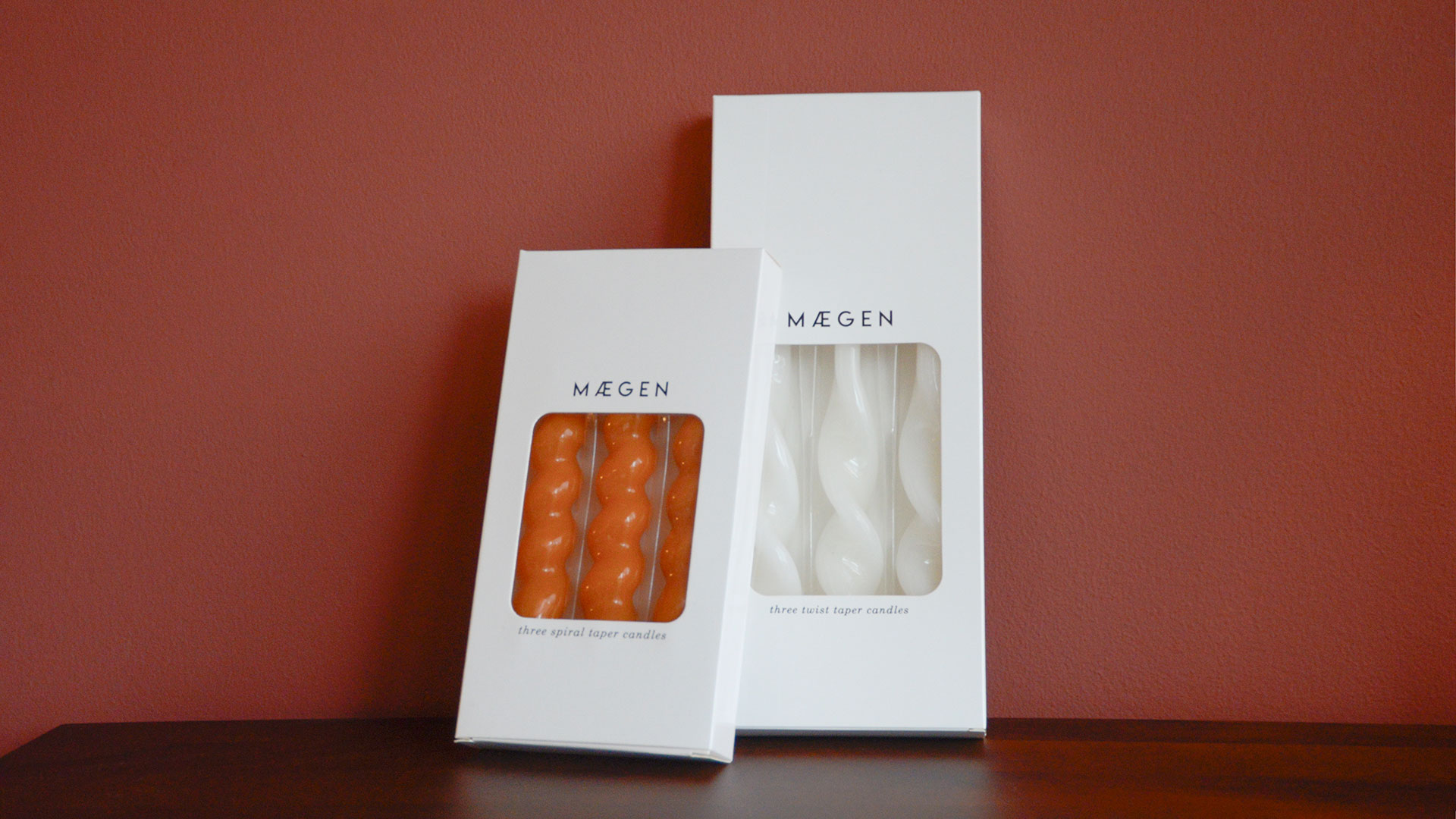 Orange: Chunky spiral candles in a bright, shiny orange colour. Approx. 18cm in height. White: Tall candles in a warm, ice white colour with a delicate twist to the bottom. Approx. 25cm in height.