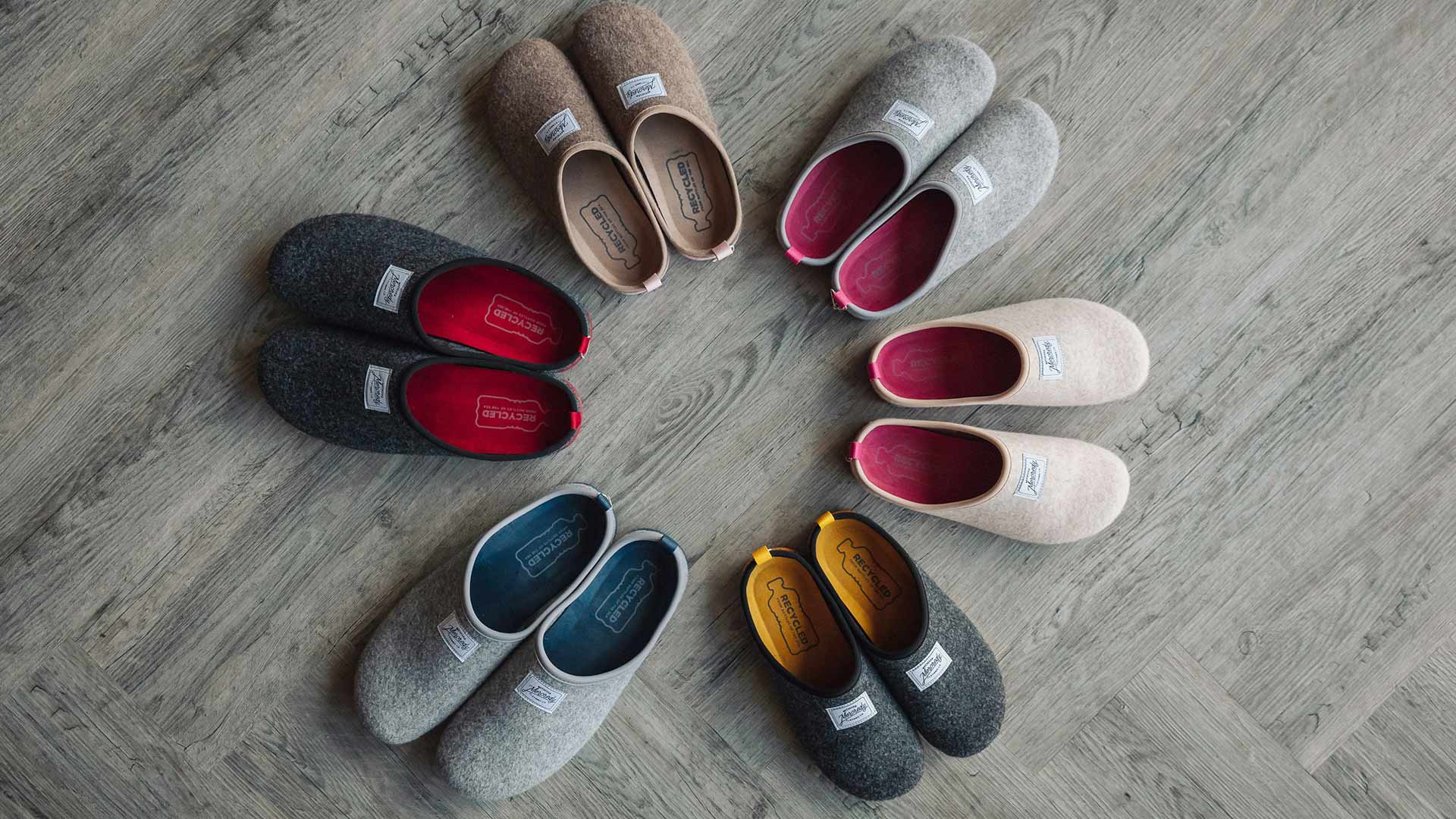 Sustainable slippers – comfy, eco-friendly and in a wide range of colours. A recycled plastic upper that feels like soft felt, with a natural rubber sole. Available in a range of stylish, vibrant colourways.