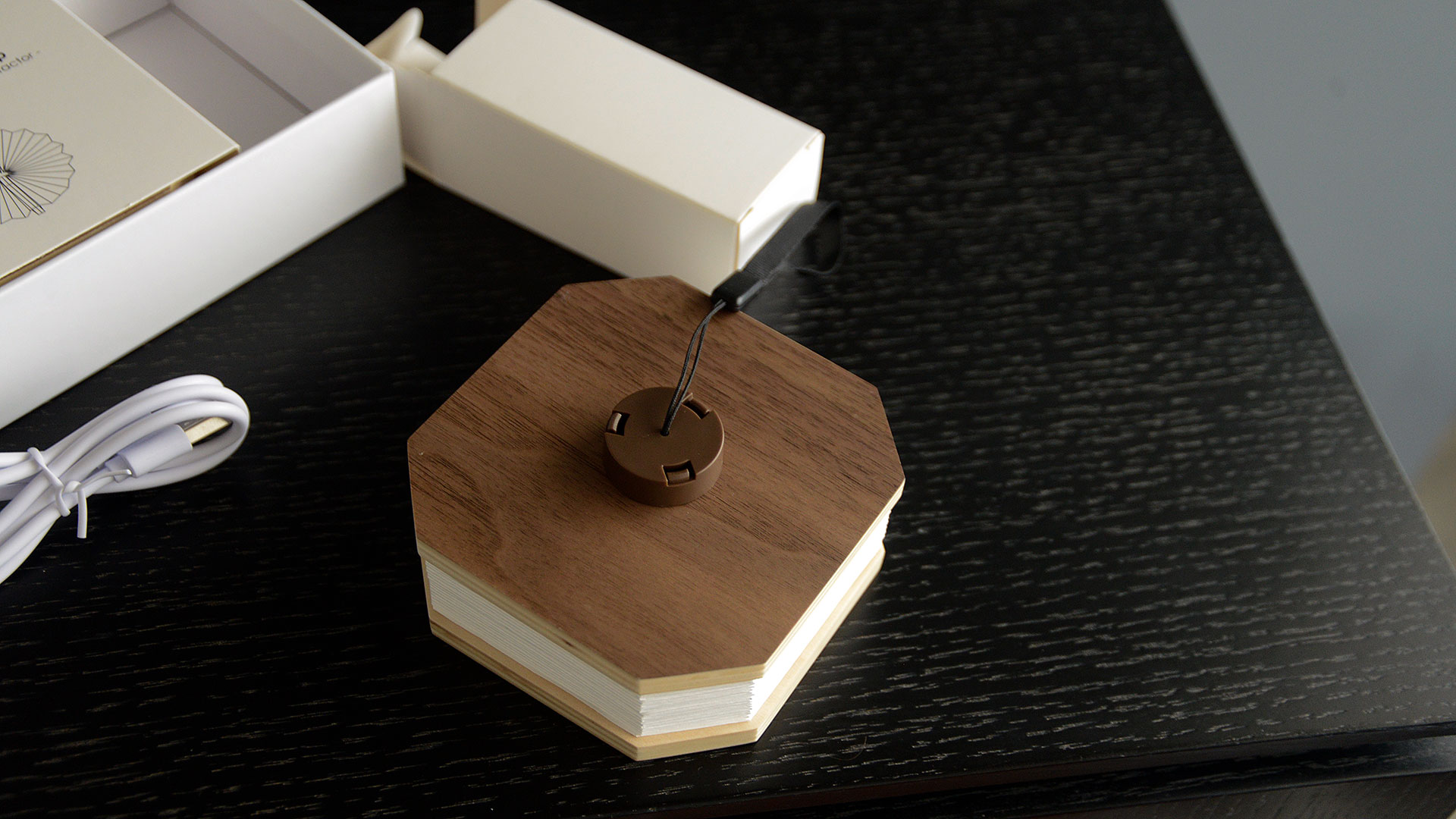 To open it, simply pull it as you would play an accordion, and it will instantly emit a wonderful ambient warm LED light through the accordion shaped pages. Close it and open it again, it magically changes to cool white LED light instead of warm light as before; when it’s fully closed, it masquerades as a laser-cut wooden hexagon display object.