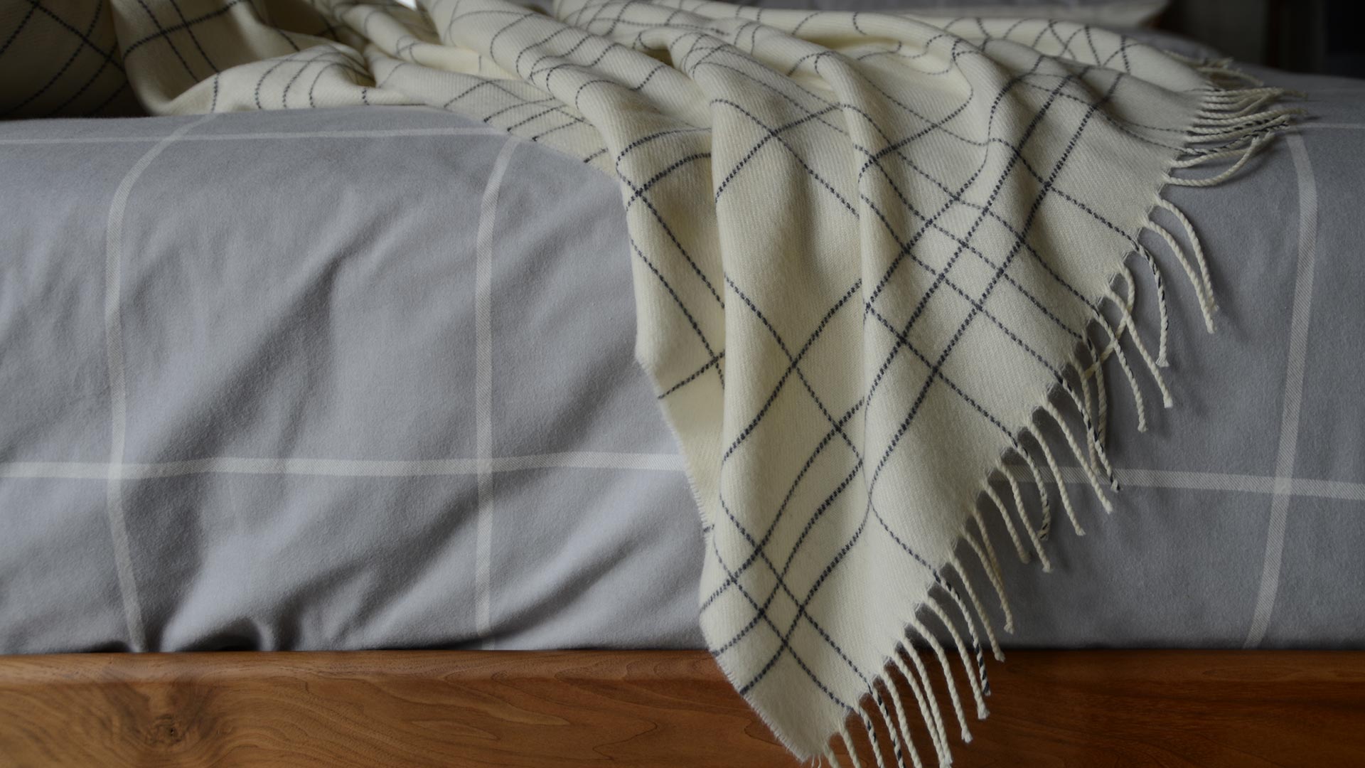 These contemporary, ‘maze’ criss cross patterned throws are made of super-soft merino lambswool. Available in two colourways: – Mid grey with a criss cross design in ivory. – Ivory with a criss cross design in charcoal.