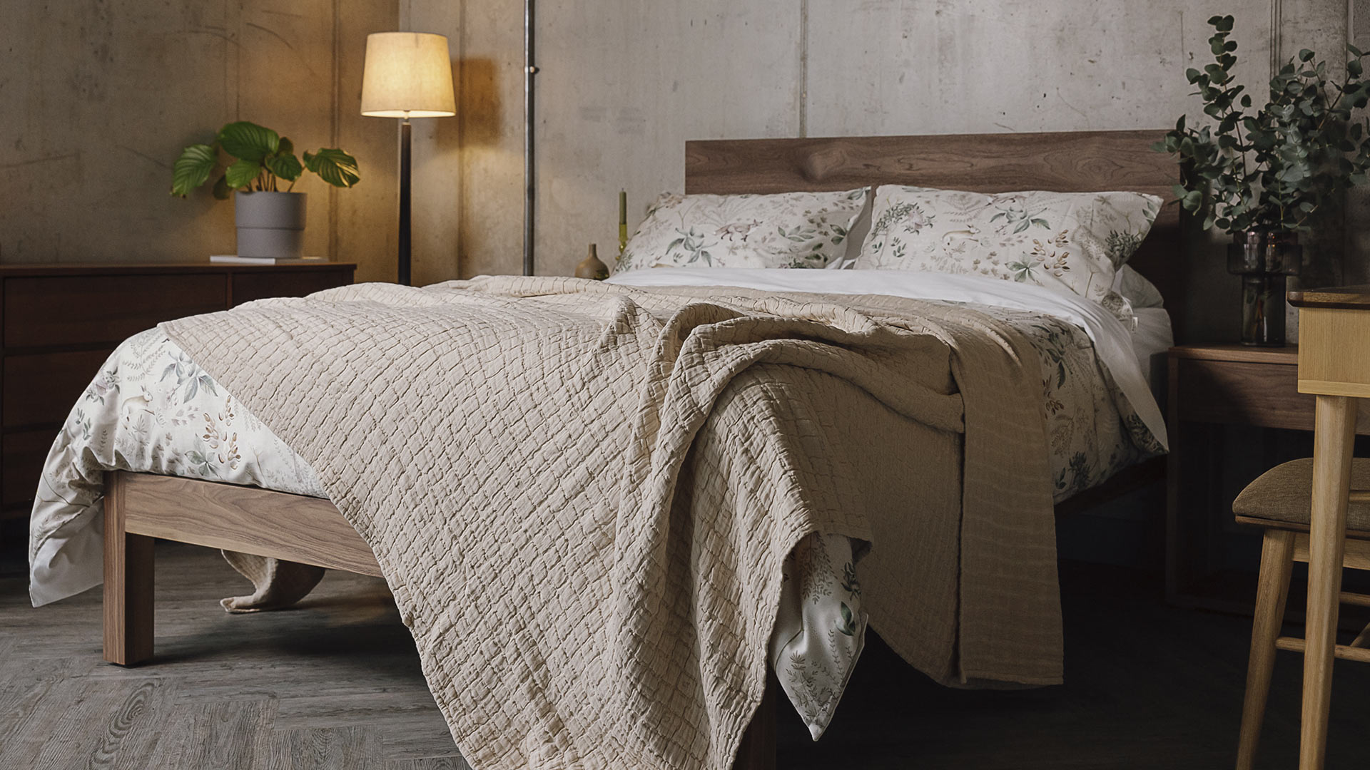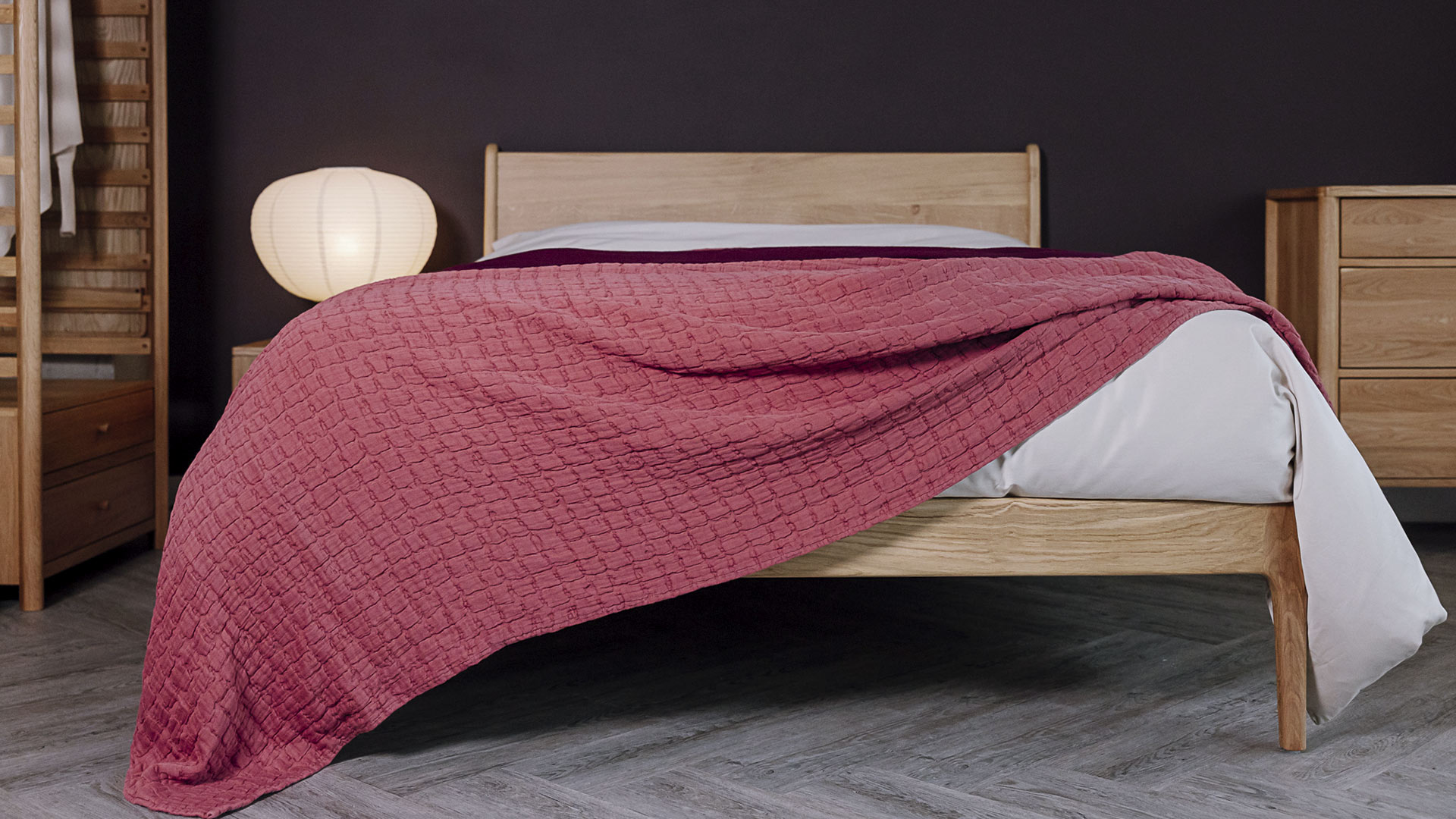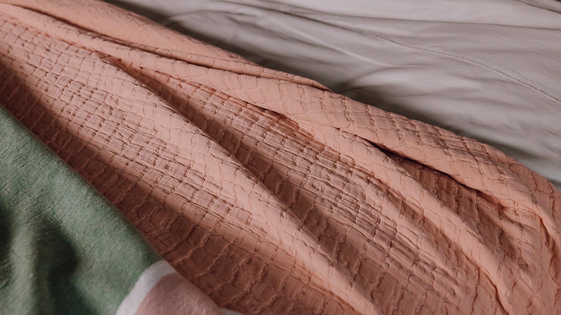 A soft, luxurious bedspread with a textured, seersucker design. Available in a range of contemporary colours: ecru, dark forest green, raspberry, blush pink and eucalyptus.
